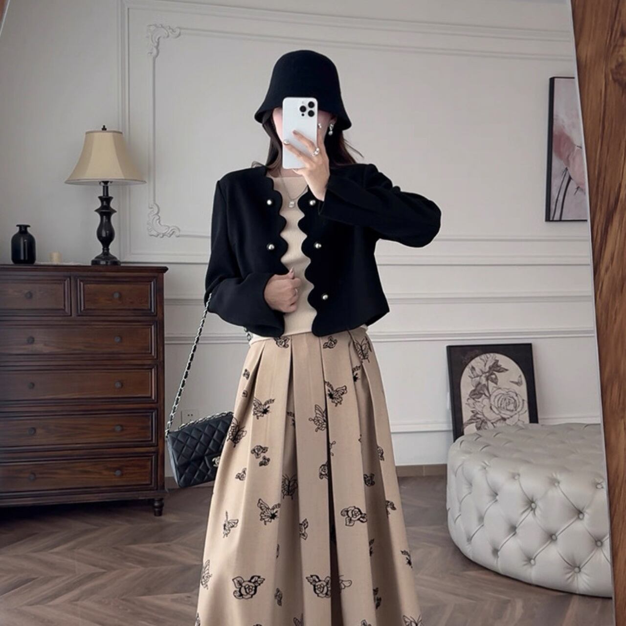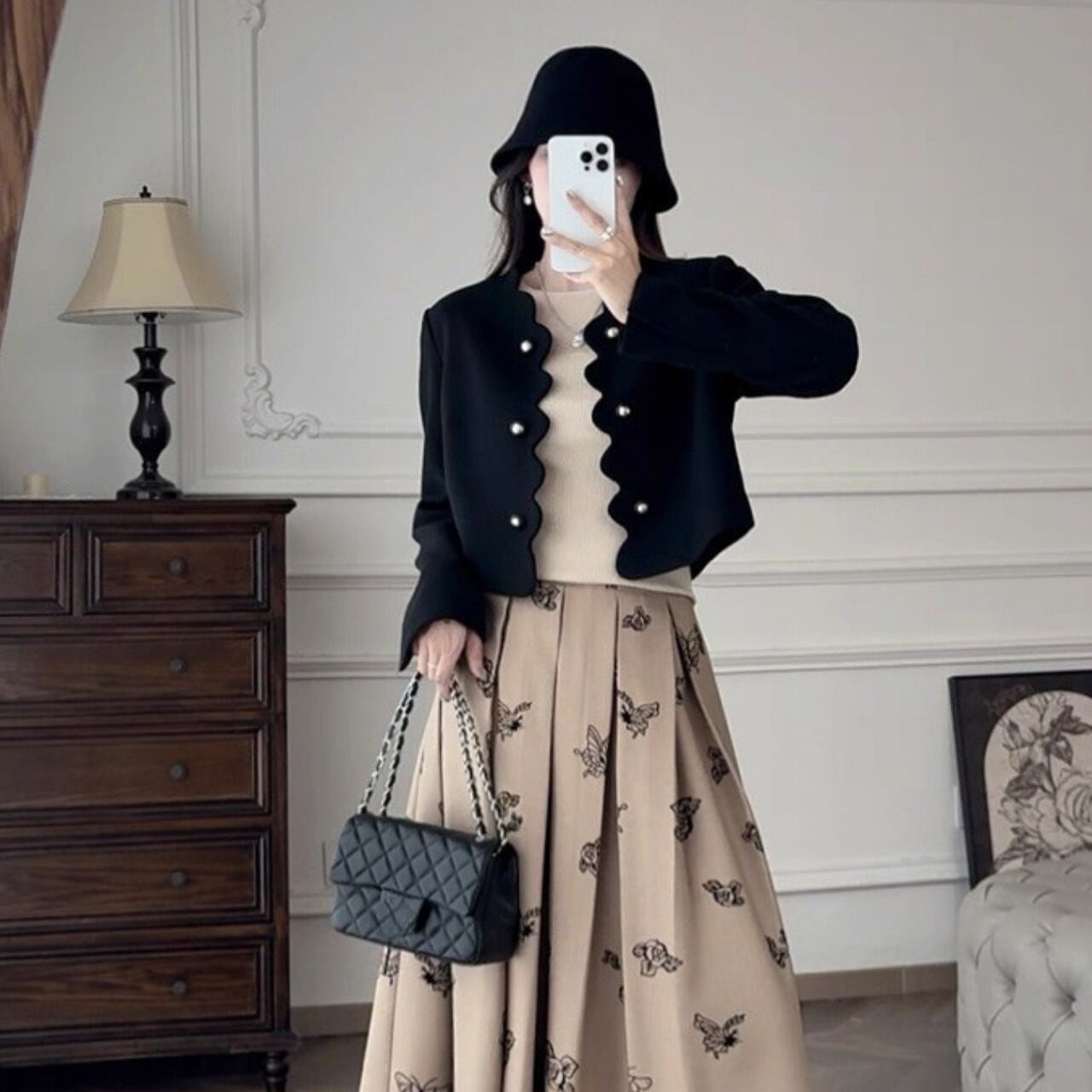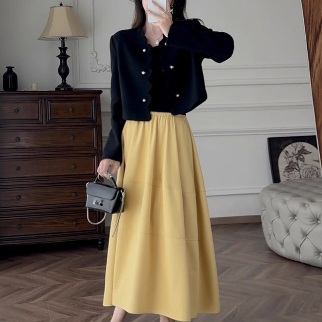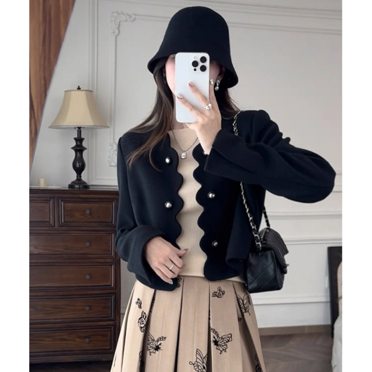 スカラップラインとパールボタンがクラシカルな魅力を放つショートジャケット。