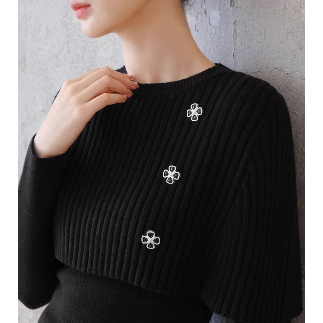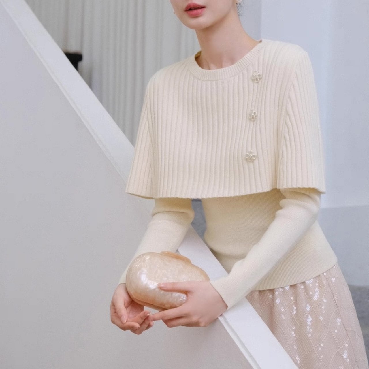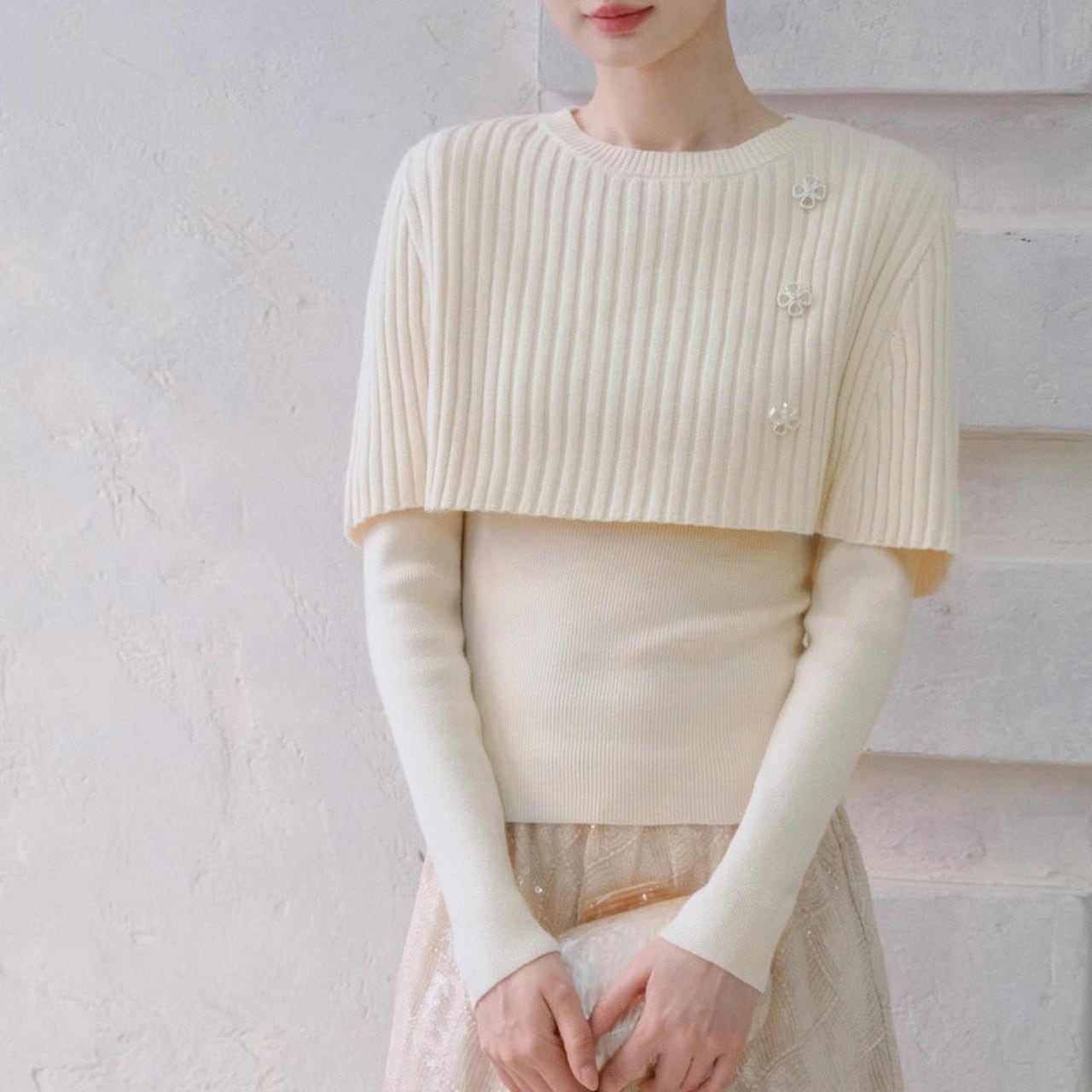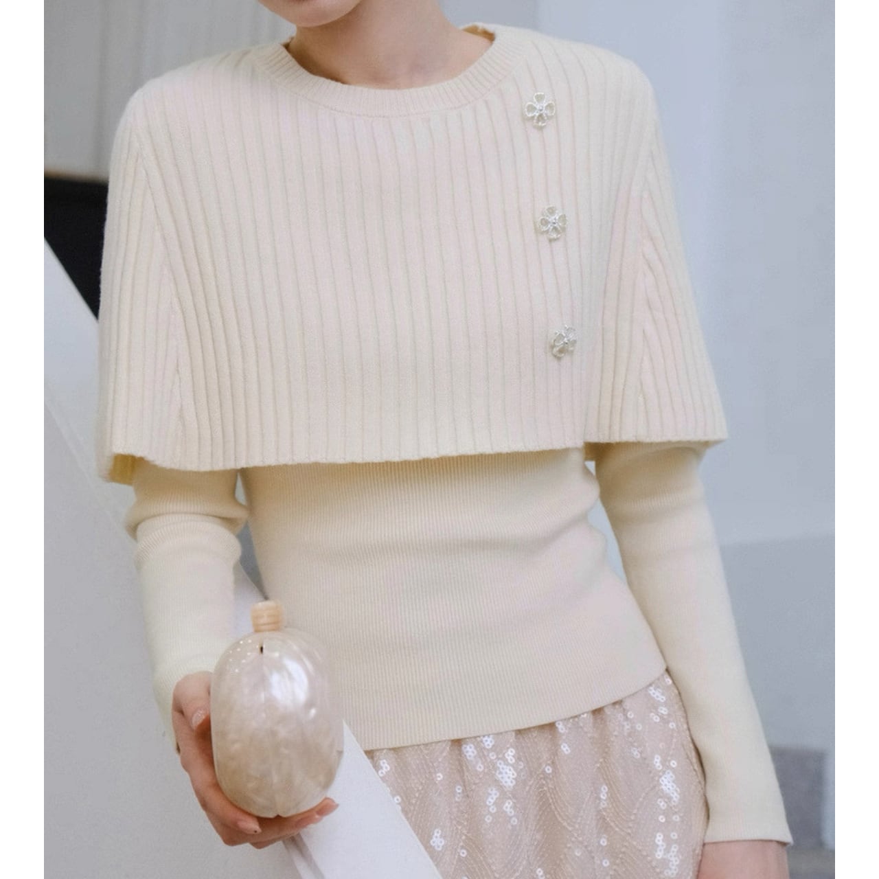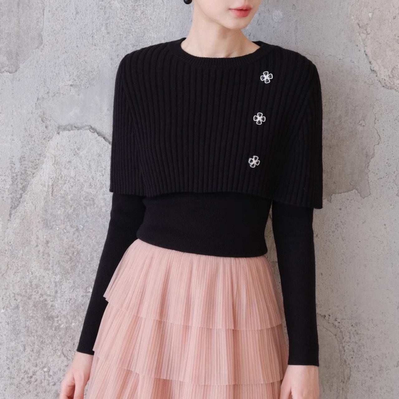 ショートケープを重ねたようなレイヤード風デザインが特徴のニットトップス。