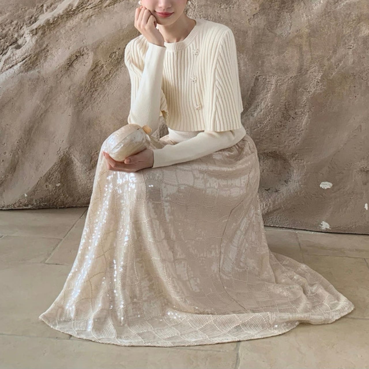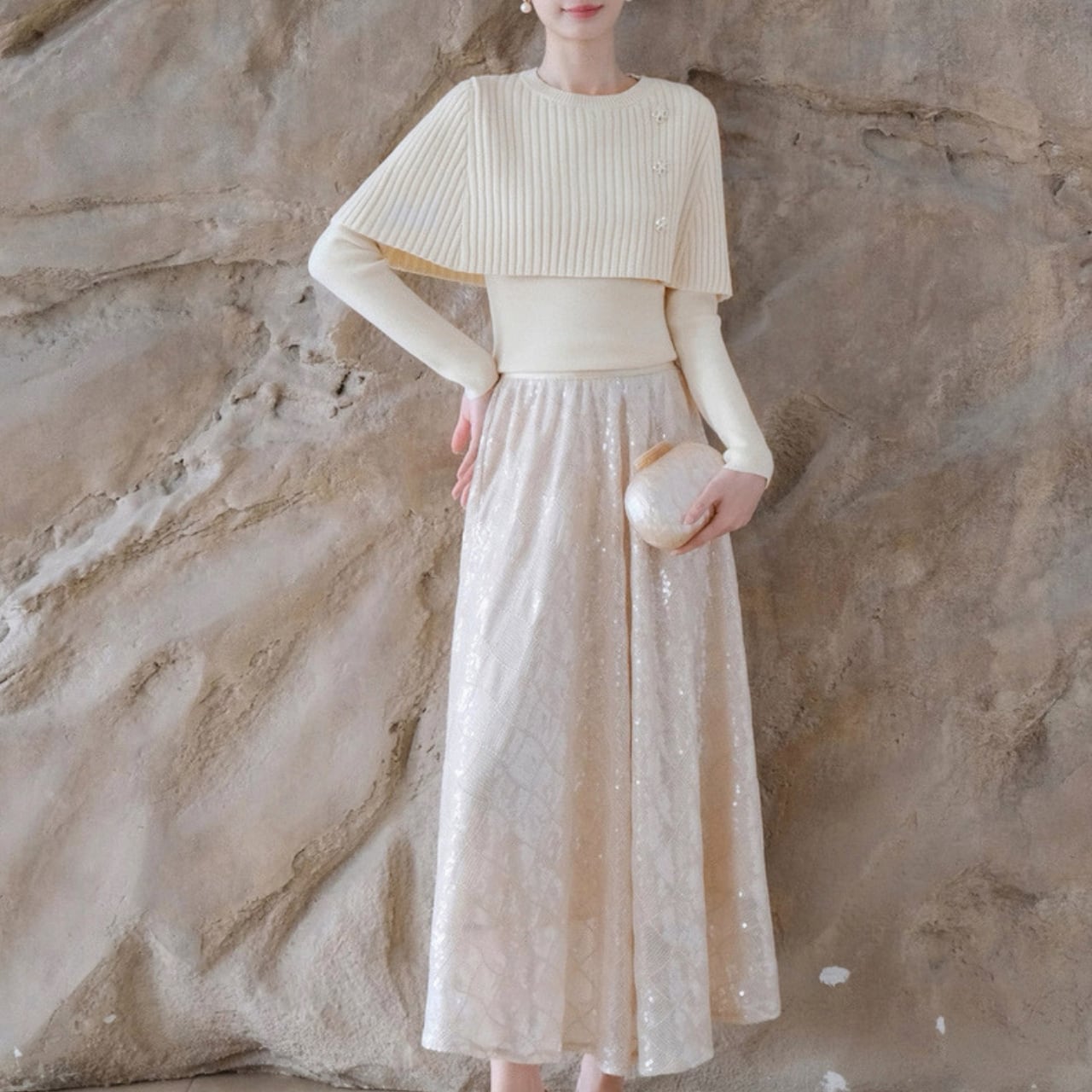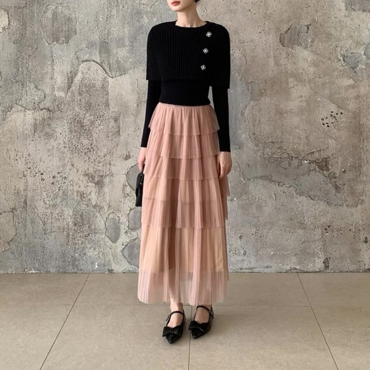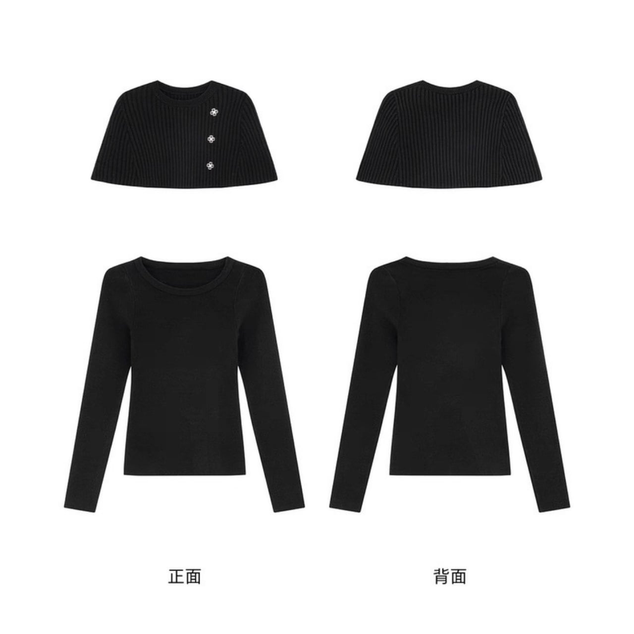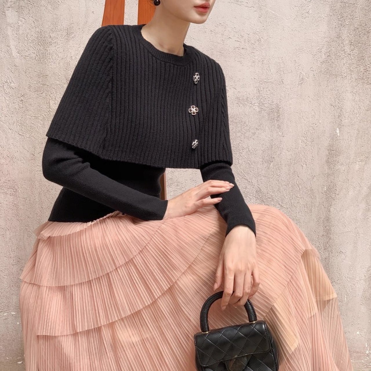 ショートケープを重ねたようなレイヤード風デザインが特徴のニットトップス。