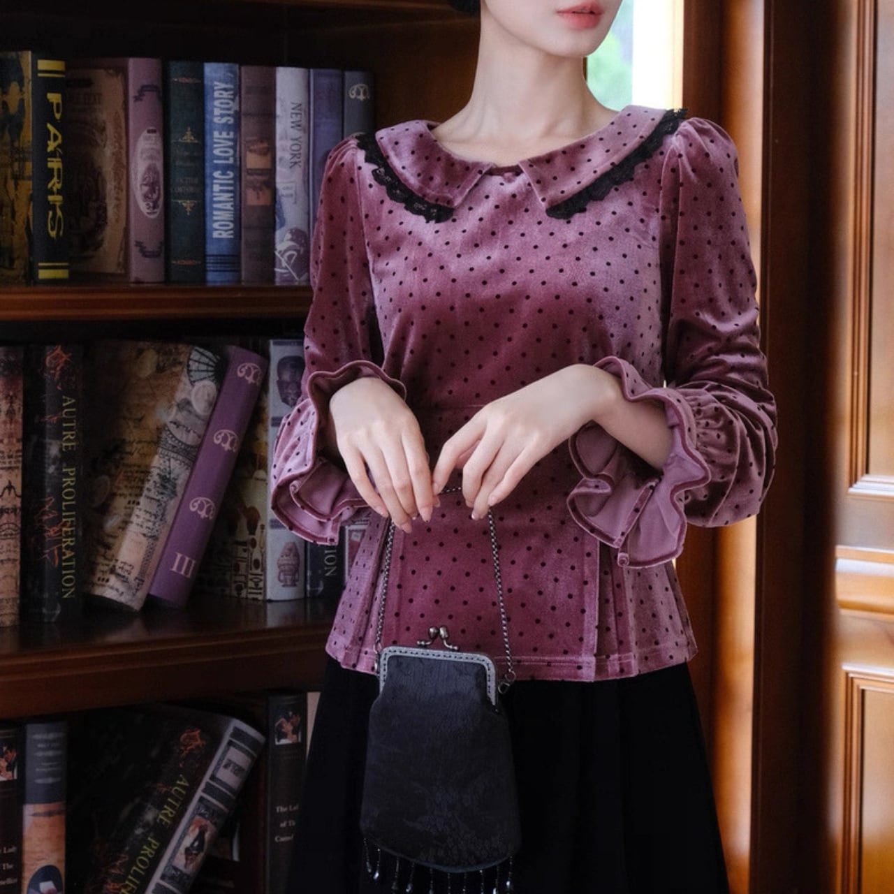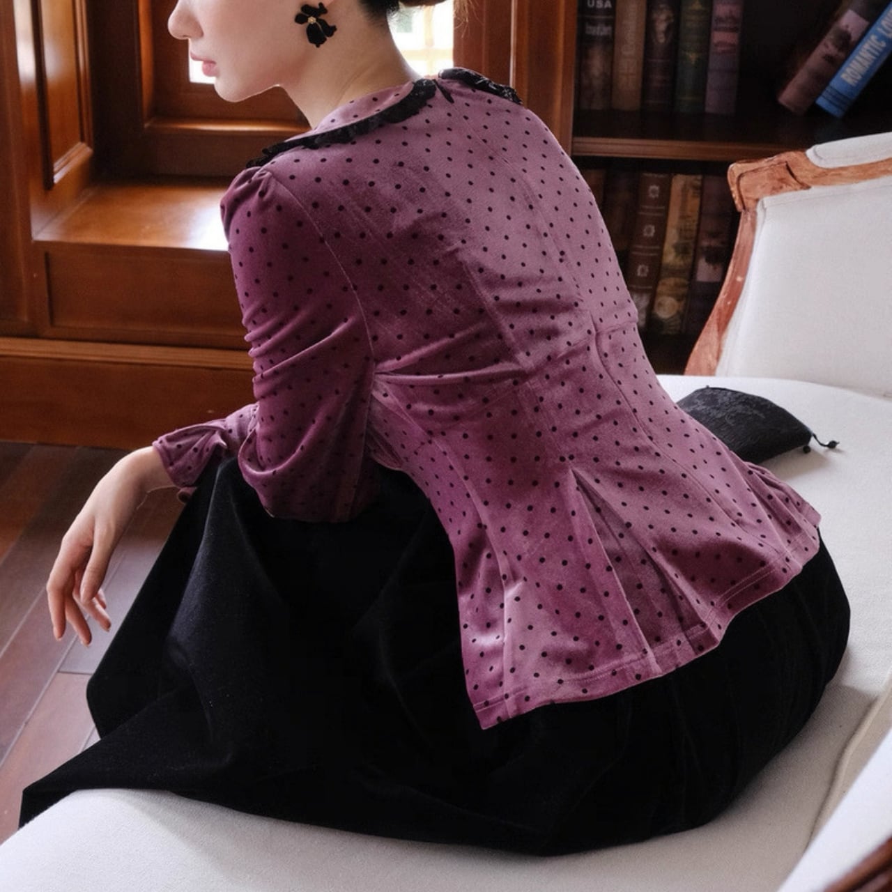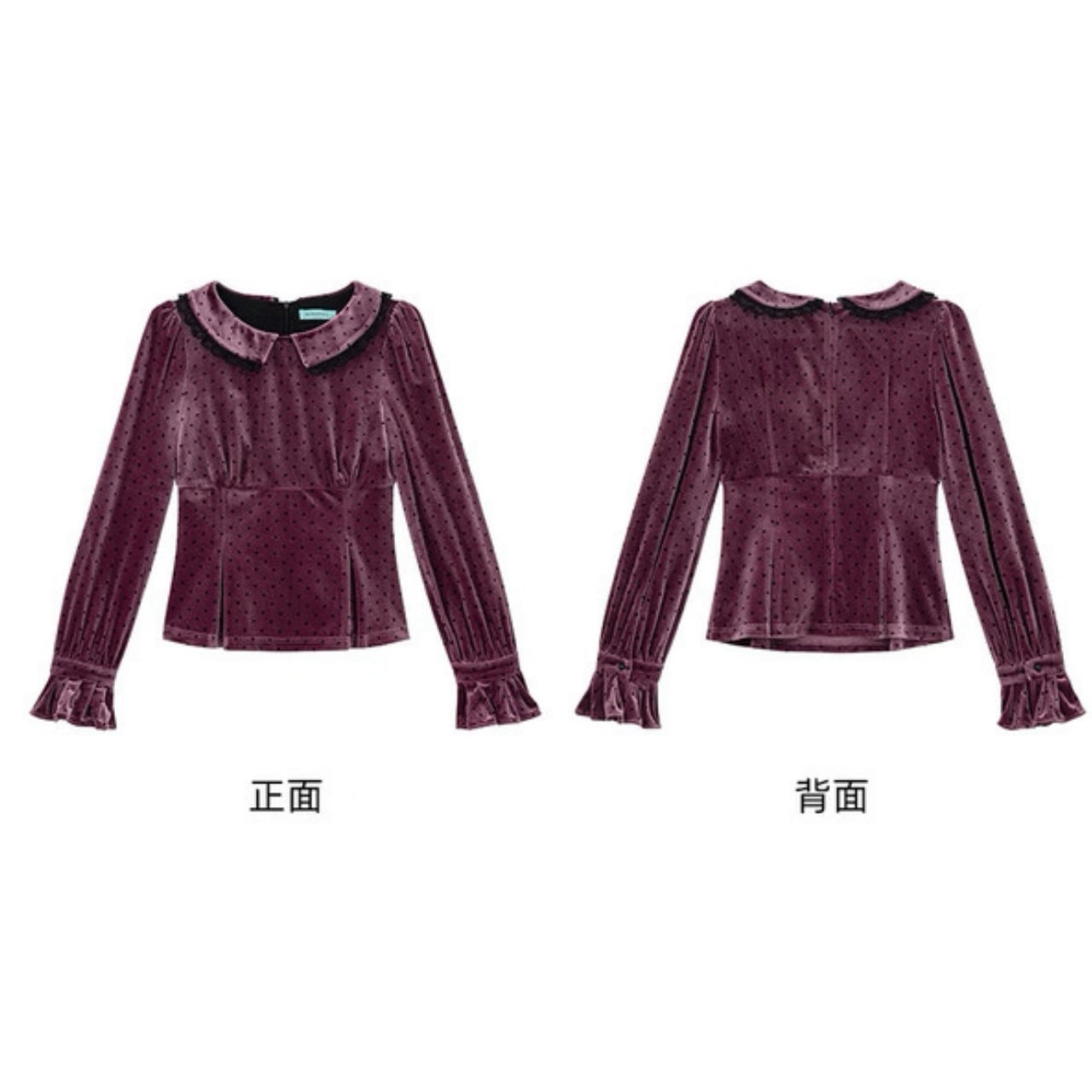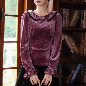 クラシカルなドット柄とフリルカラーが目を惹く、女性らしいベロアトップス。