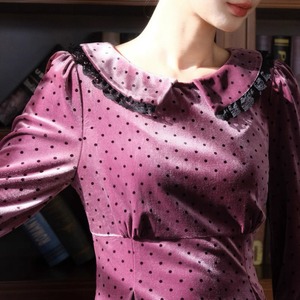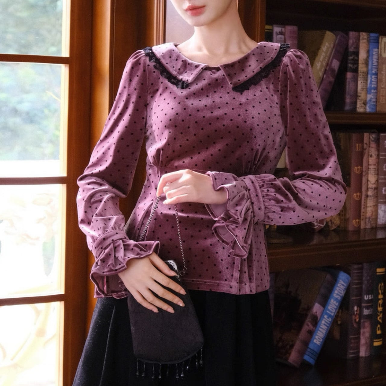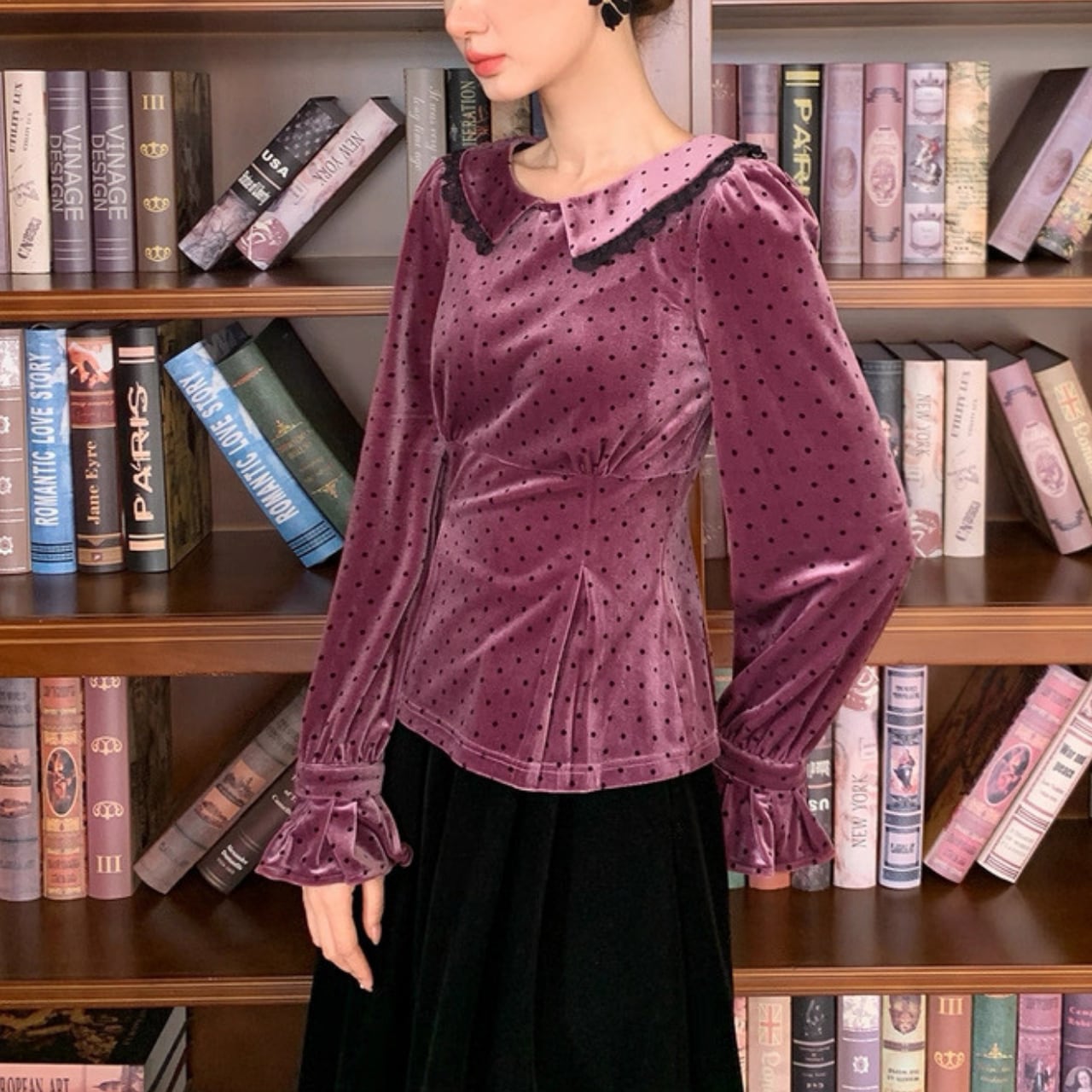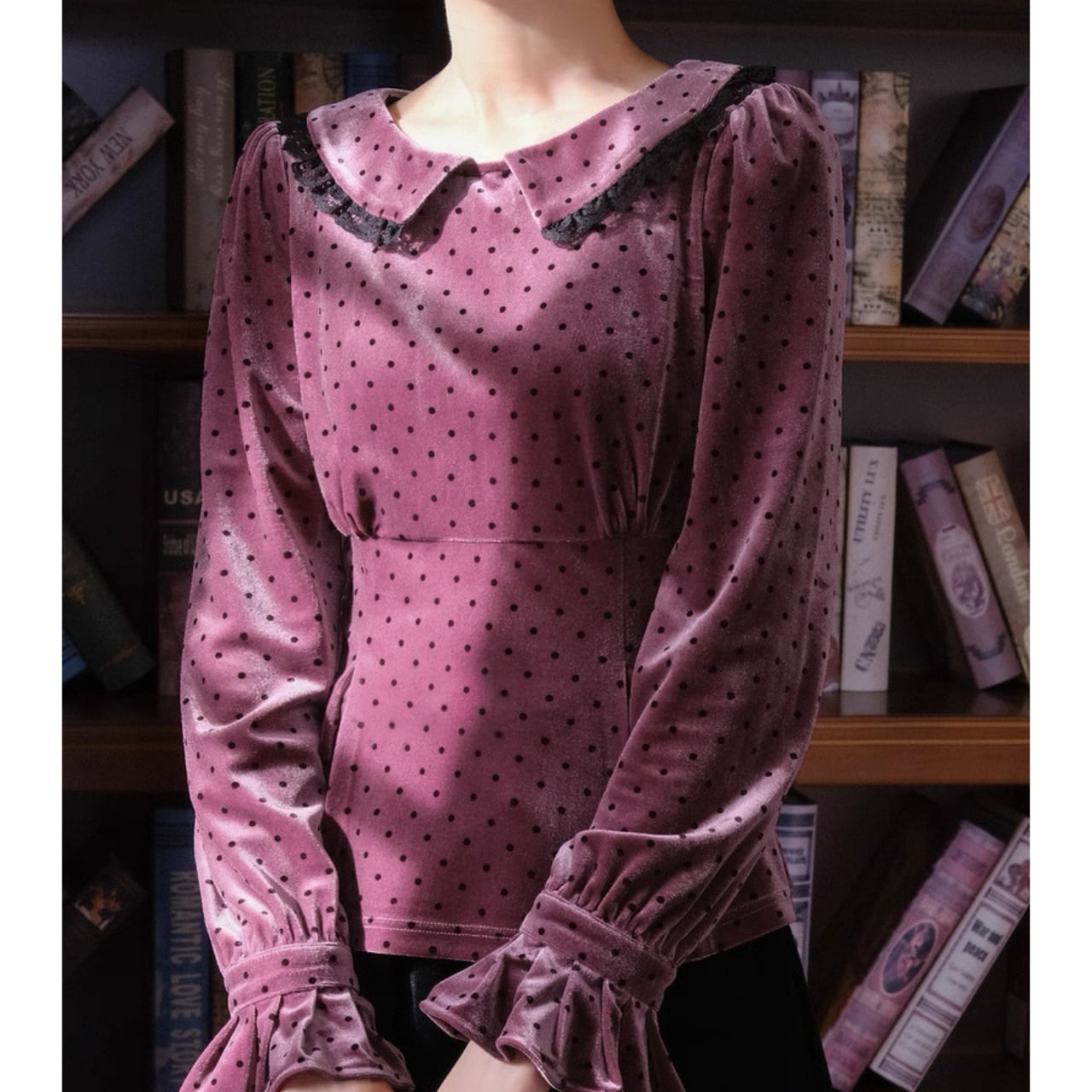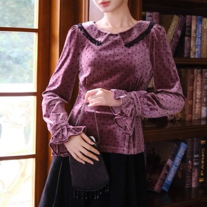 クラシカルなドット柄とフリルカラーが目を惹く、女性らしいベロアトップス。