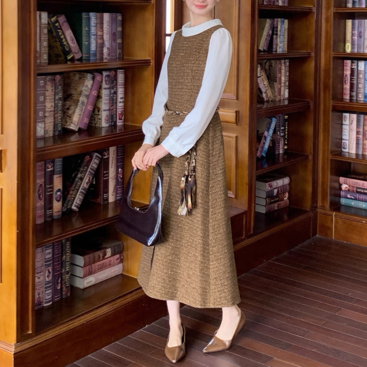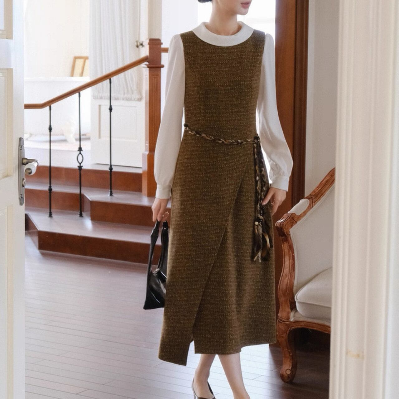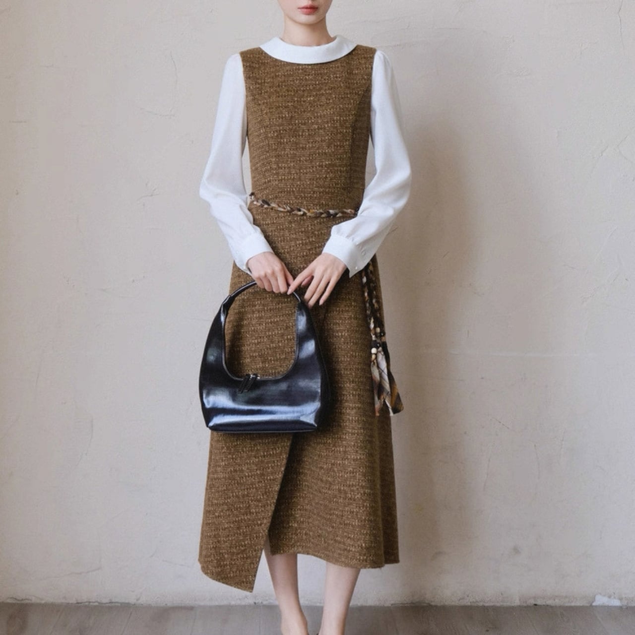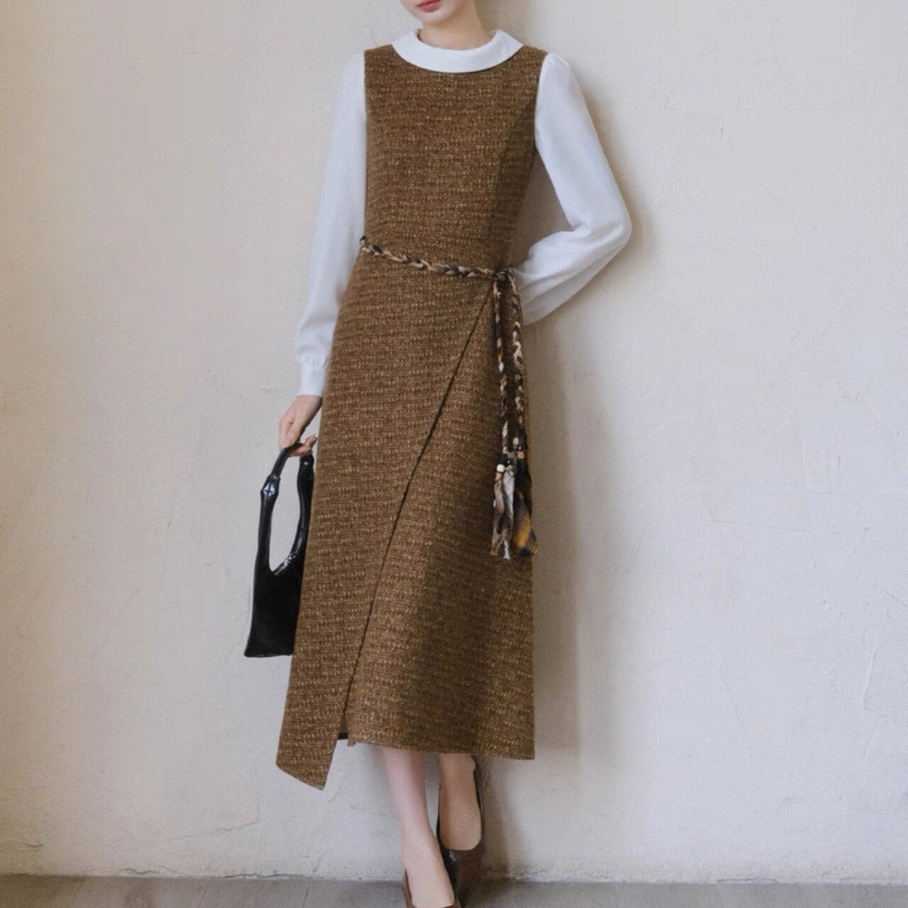 ツイード調素材が上品な印象を与えるノースリーブワンピース。