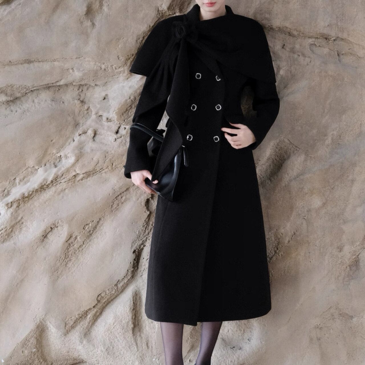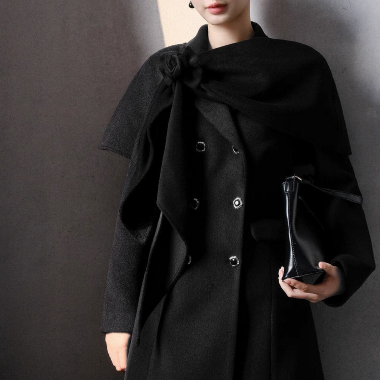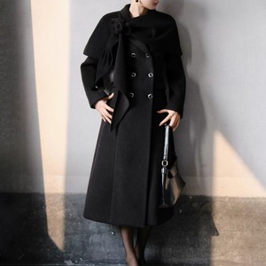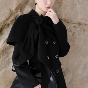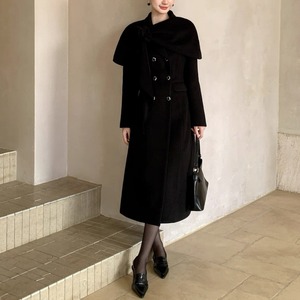 ケープ風デザインが印象的な、存在感のあるロングコート。