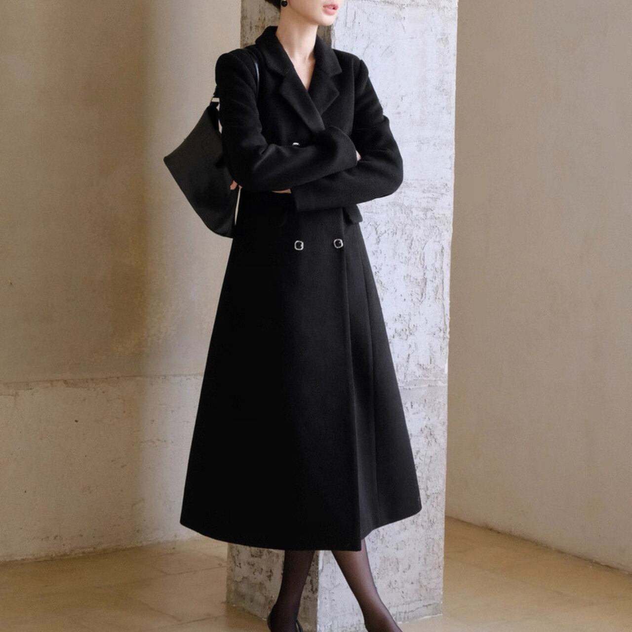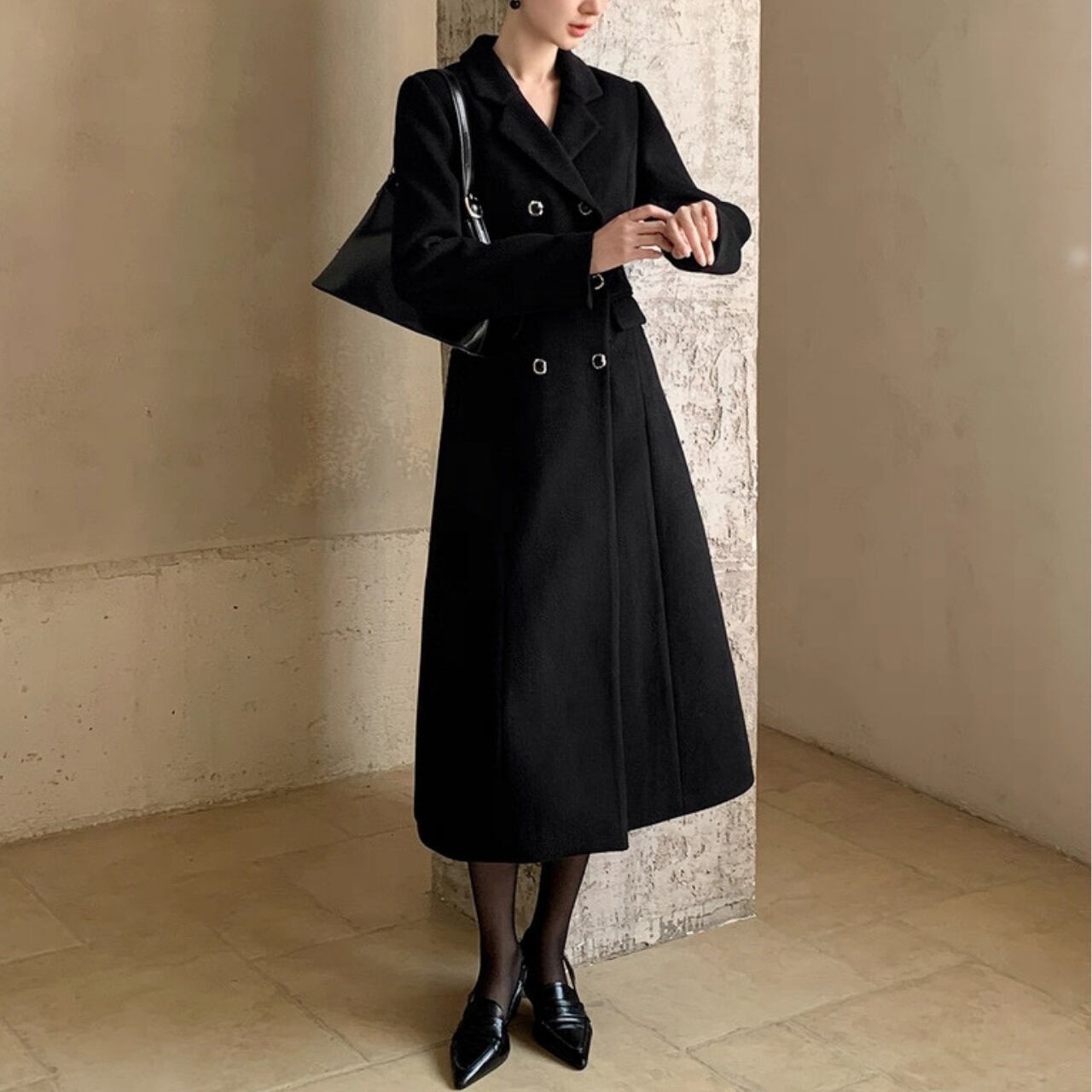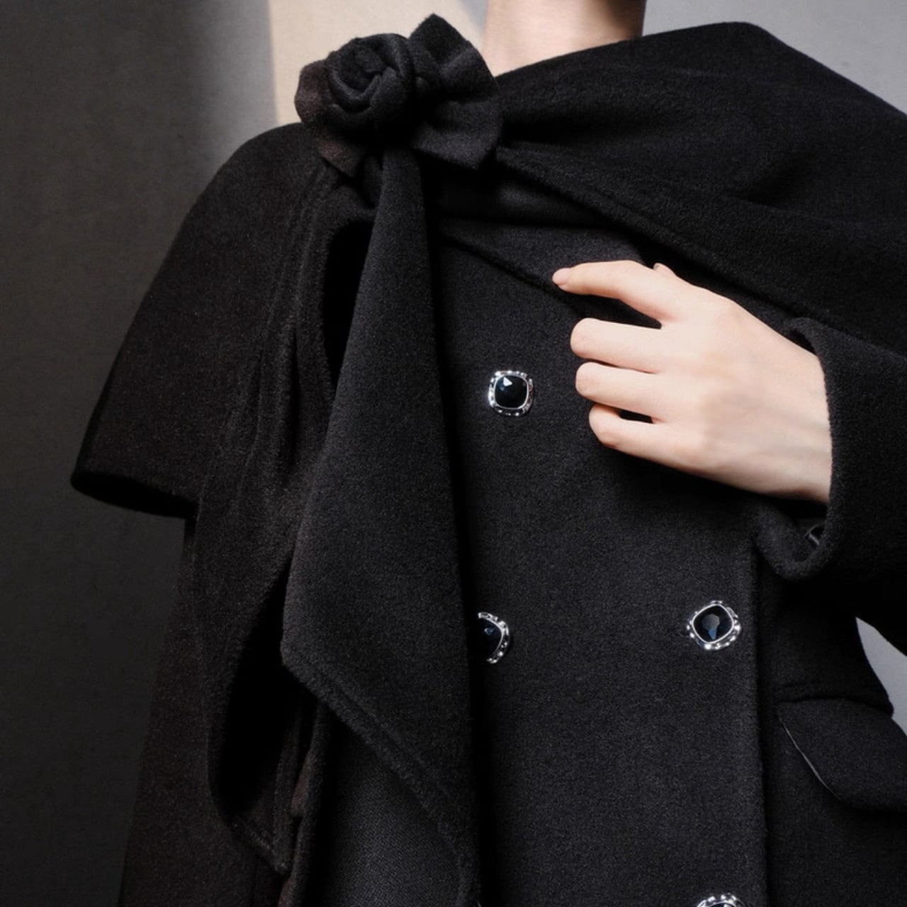 ケープ風デザインが印象的な、存在感のあるロングコート。
