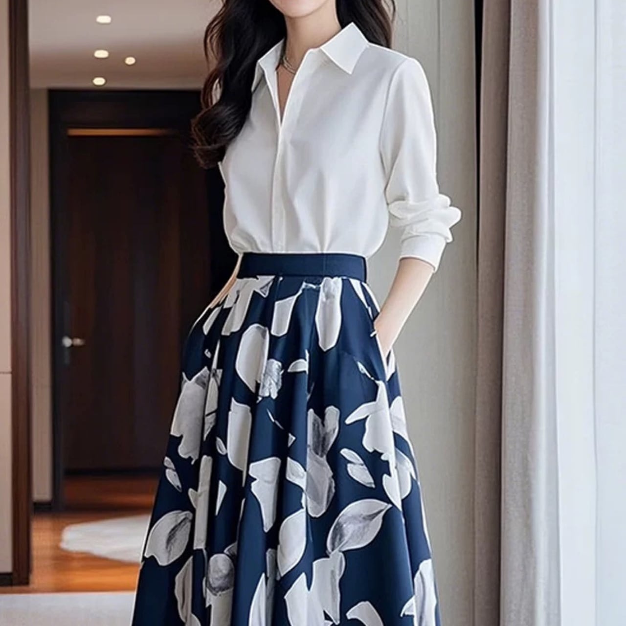 落ち着いた配色で描かれたフラワープリントが印象的な一着。