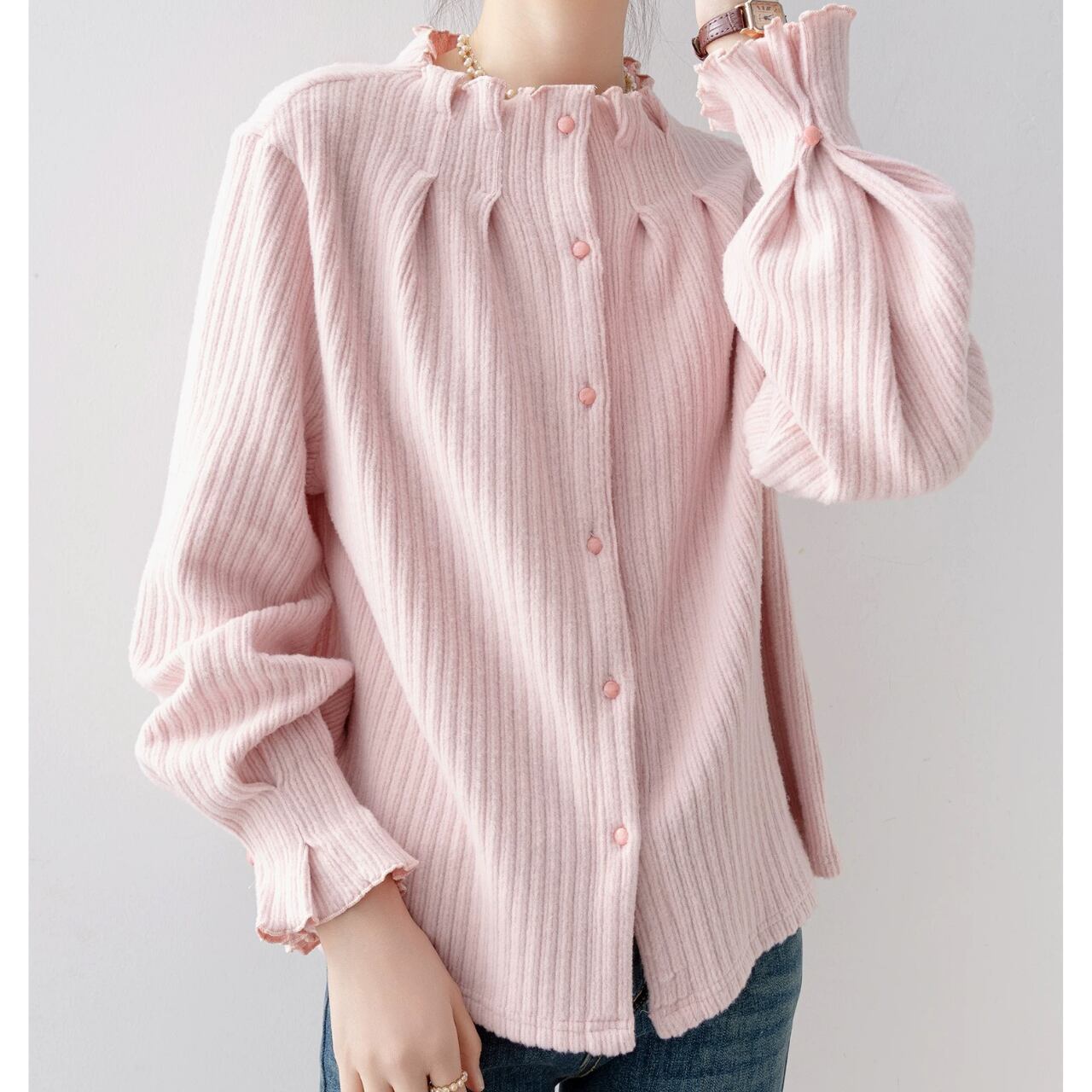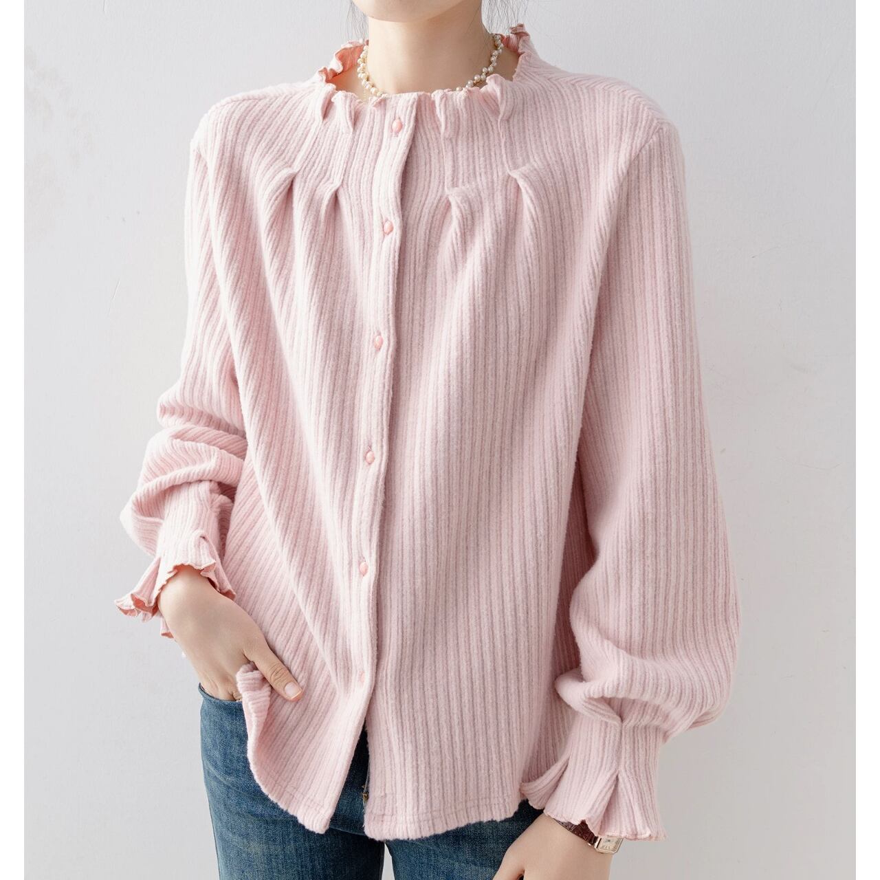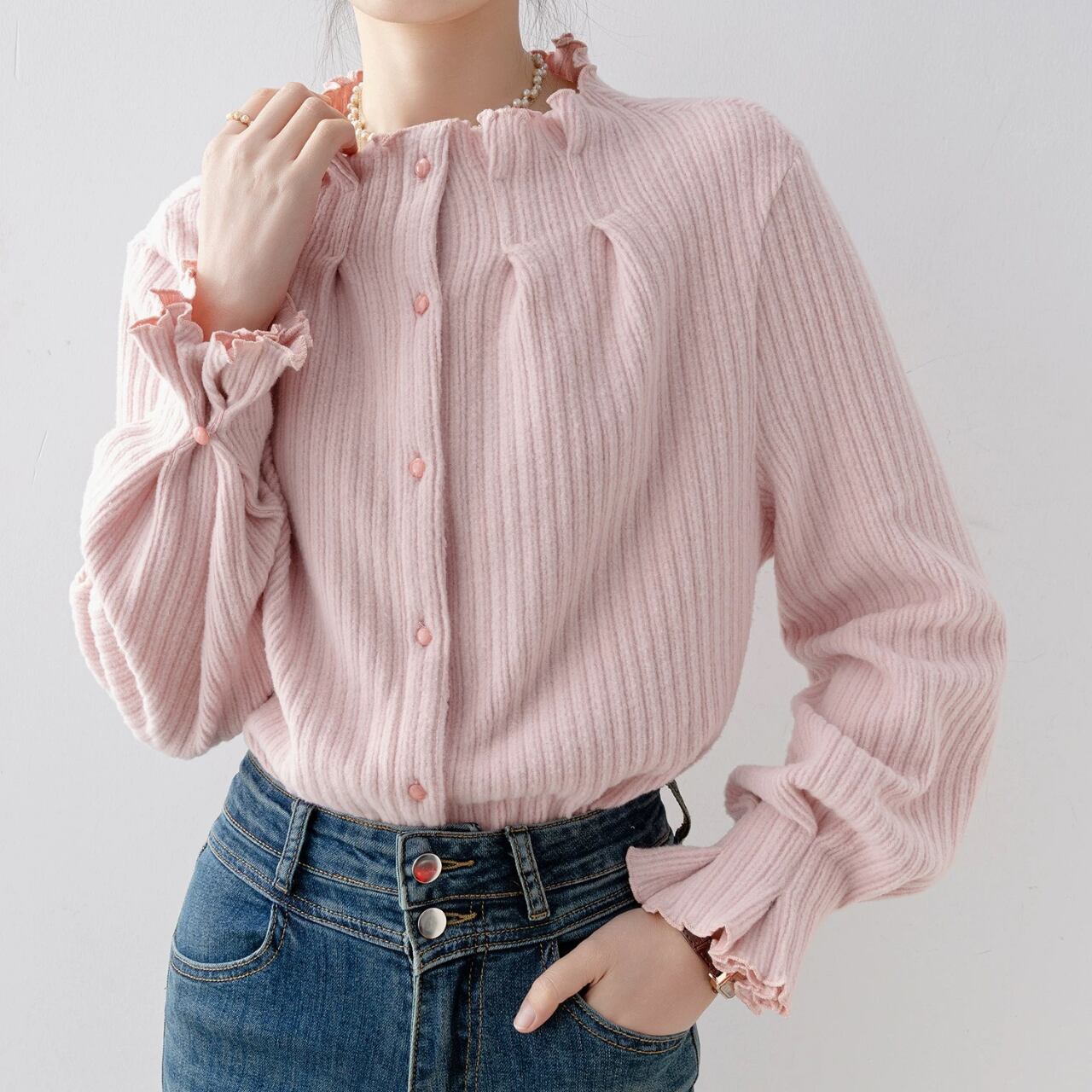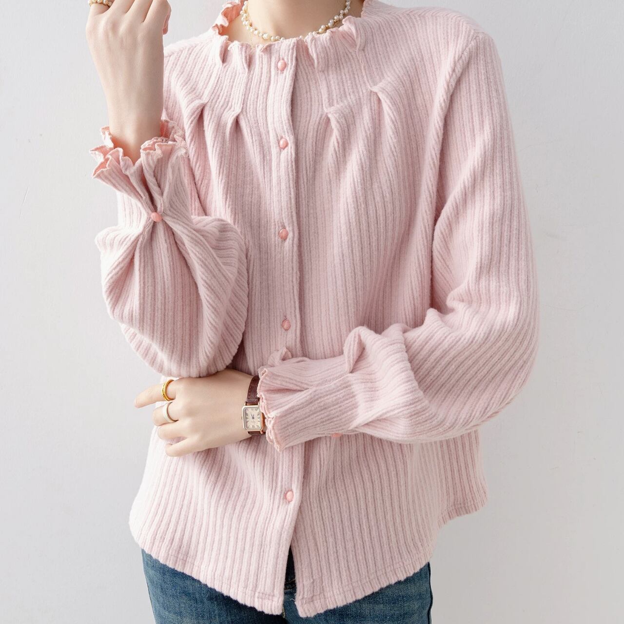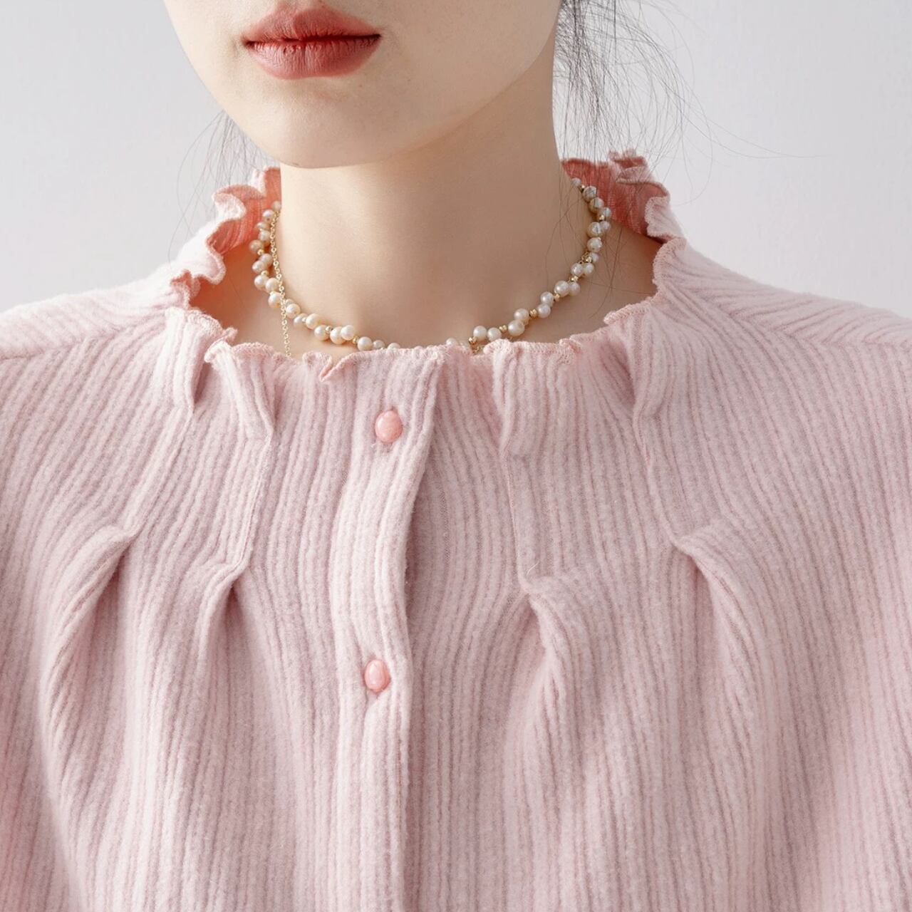 繊細なプリーツとフリルが首元を優しく彩るブラウス。