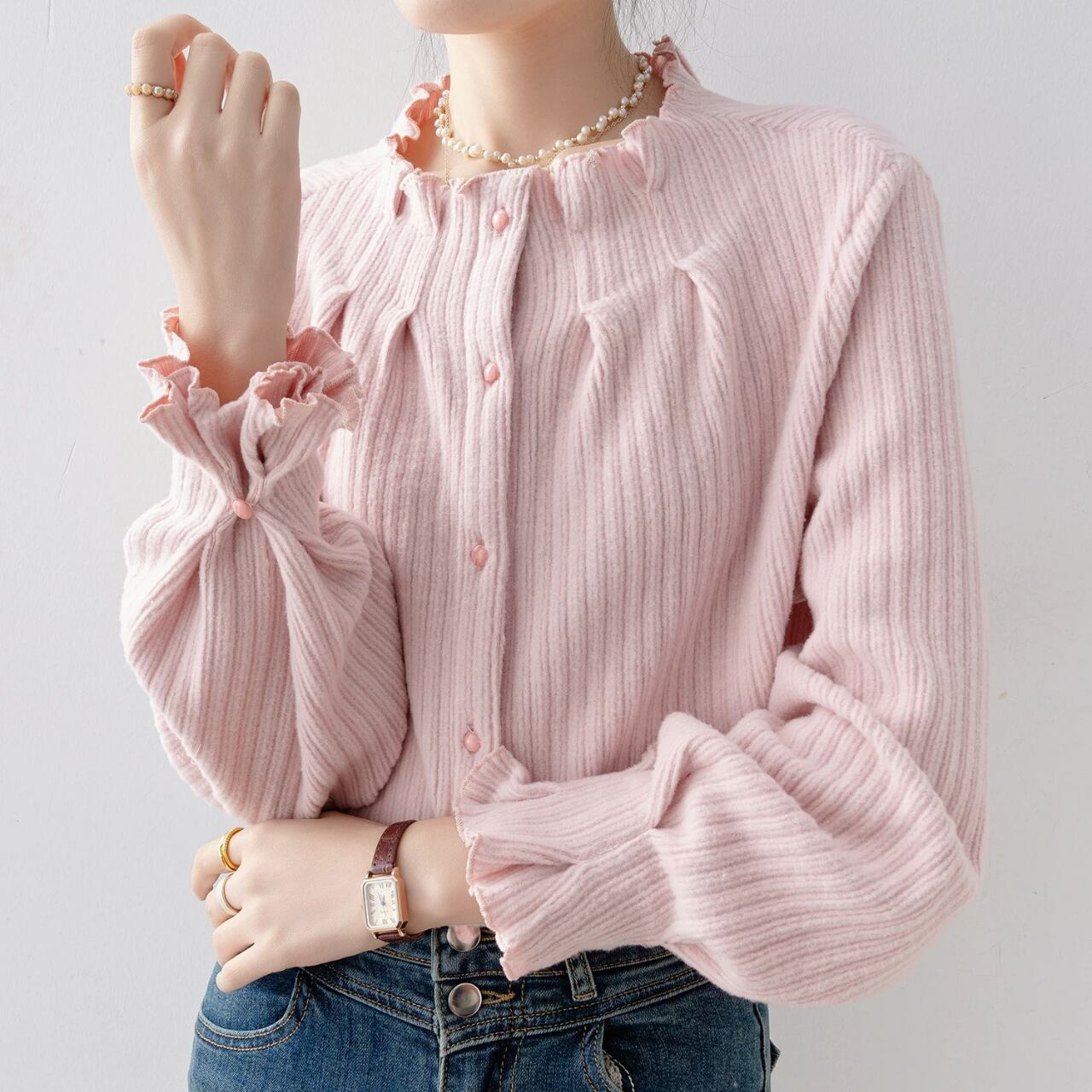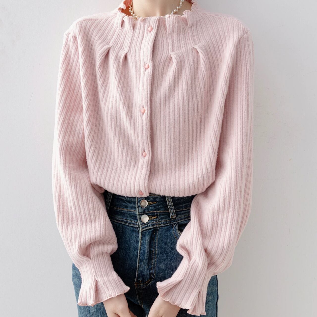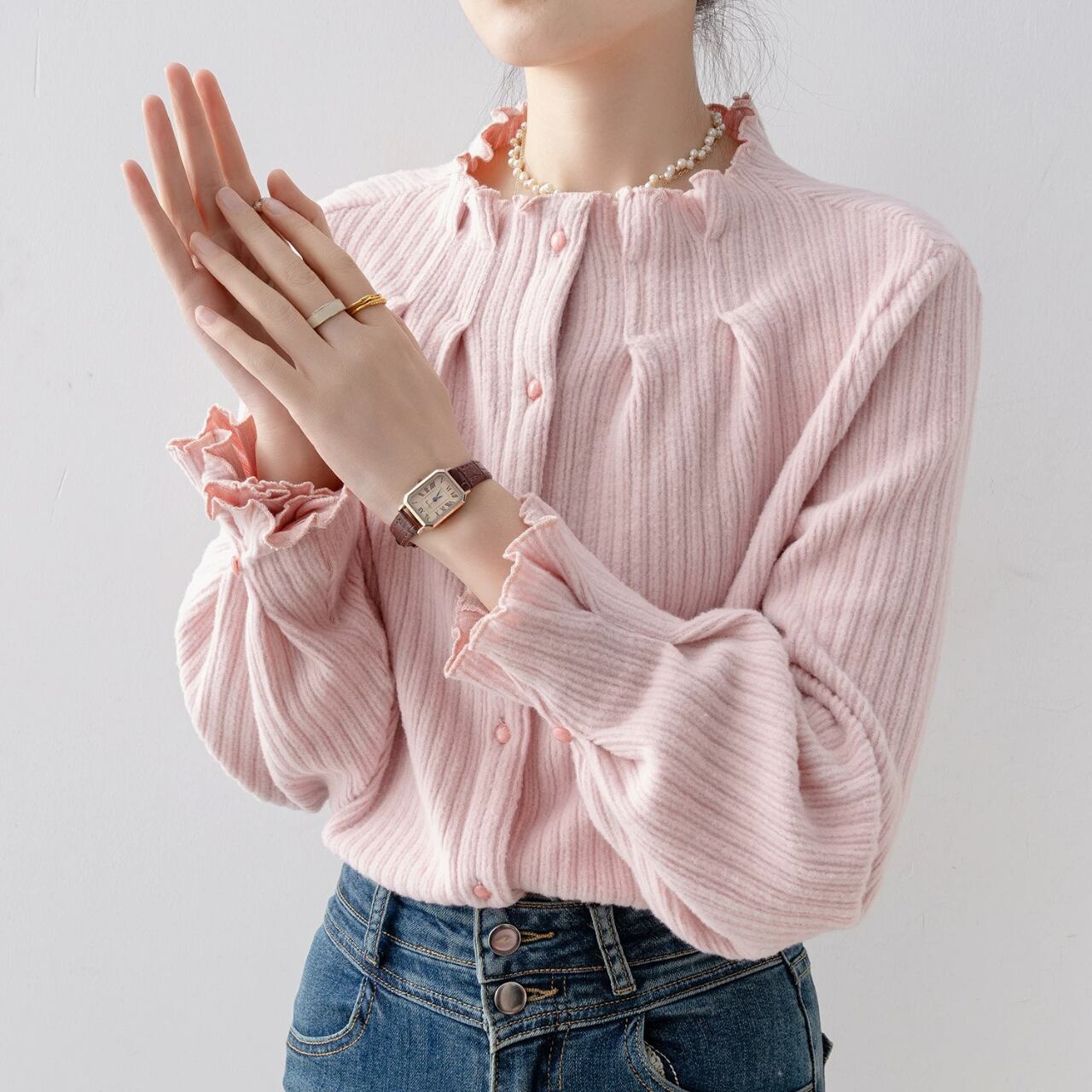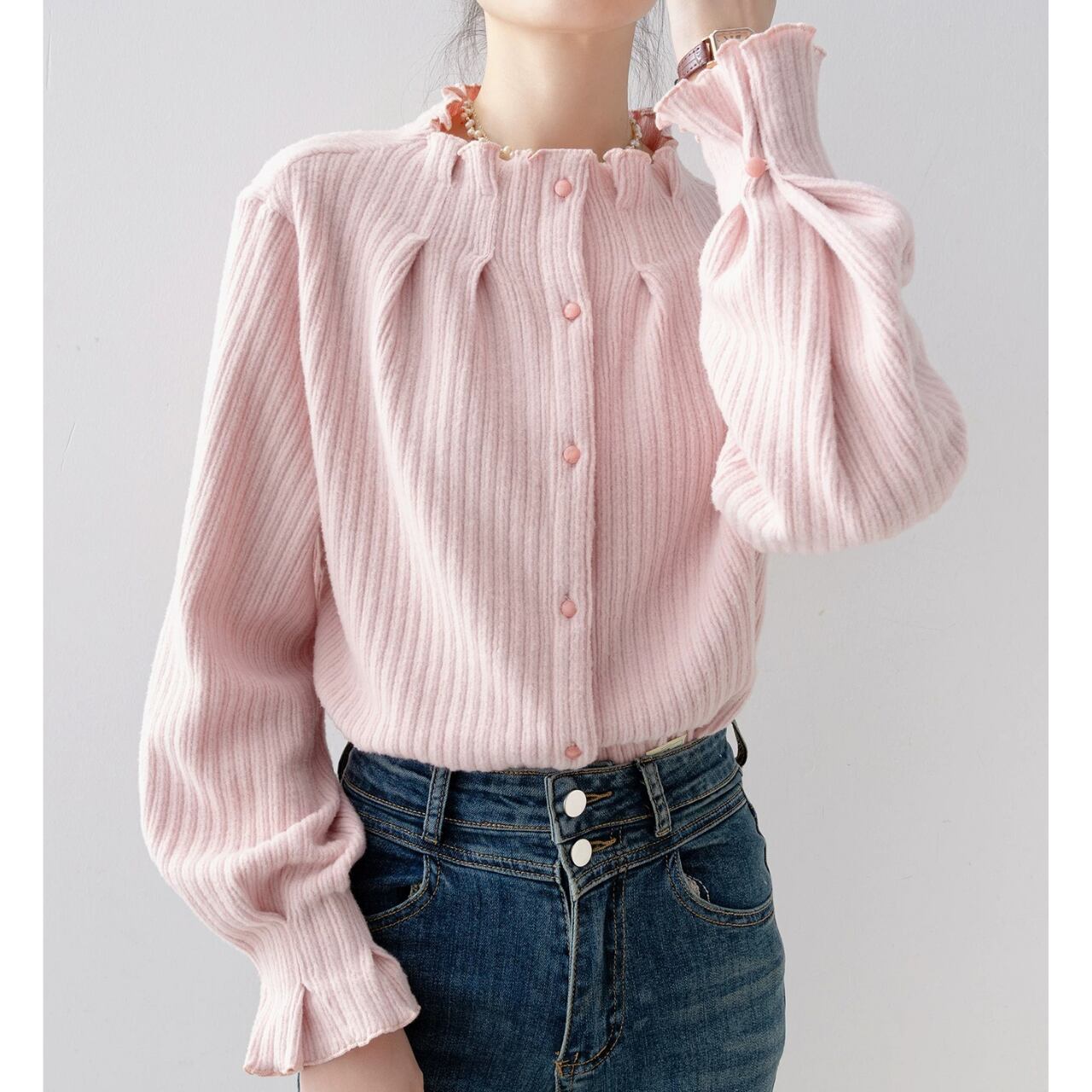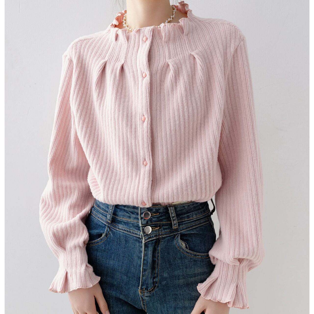 繊細なプリーツとフリルが首元を優しく彩るブラウス。