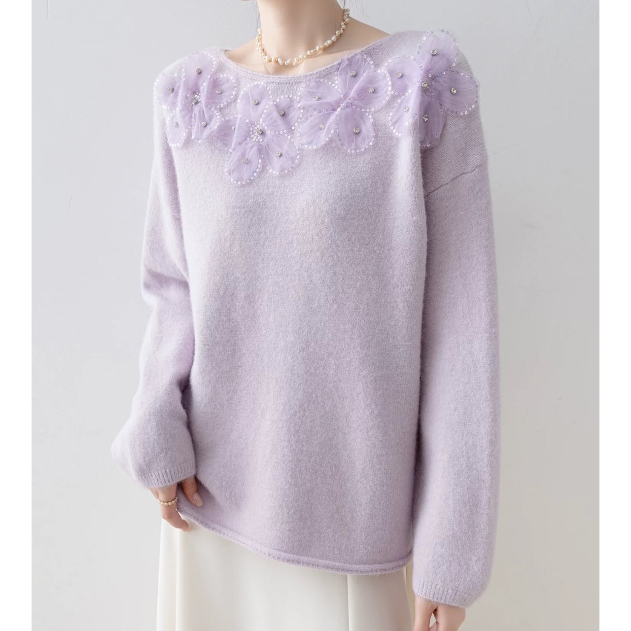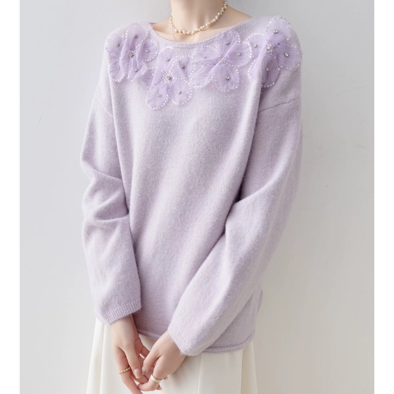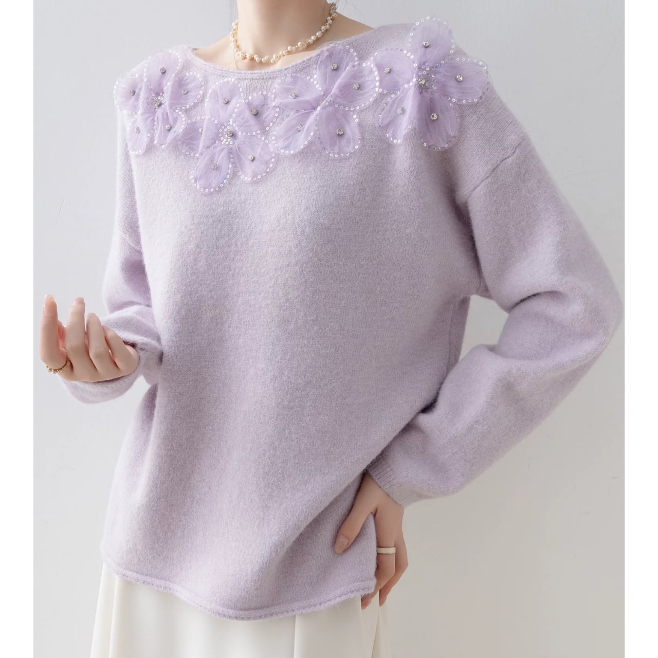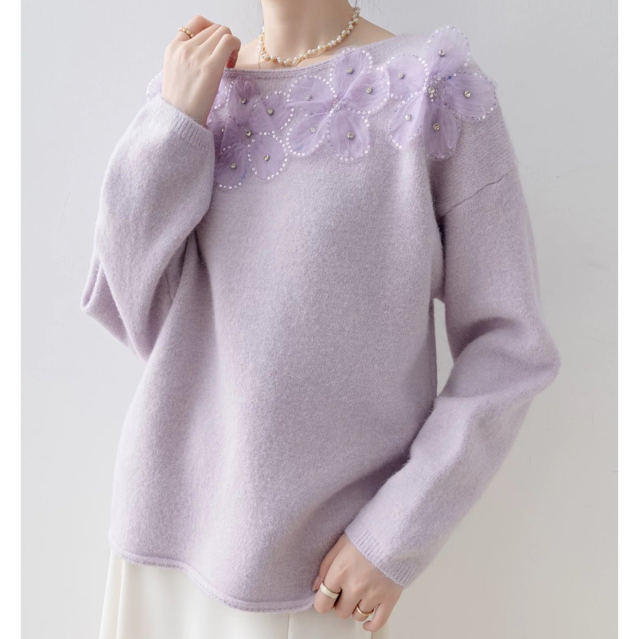 繊細なフラワーモチーフが胸元を彩る、優美なニットトップ。