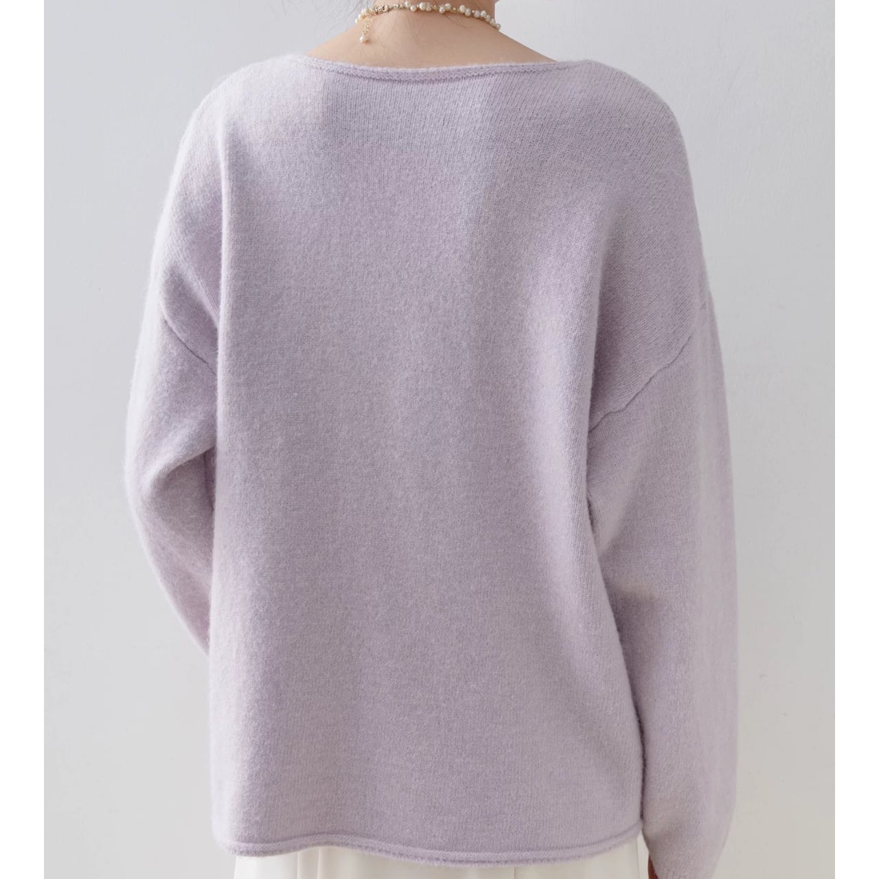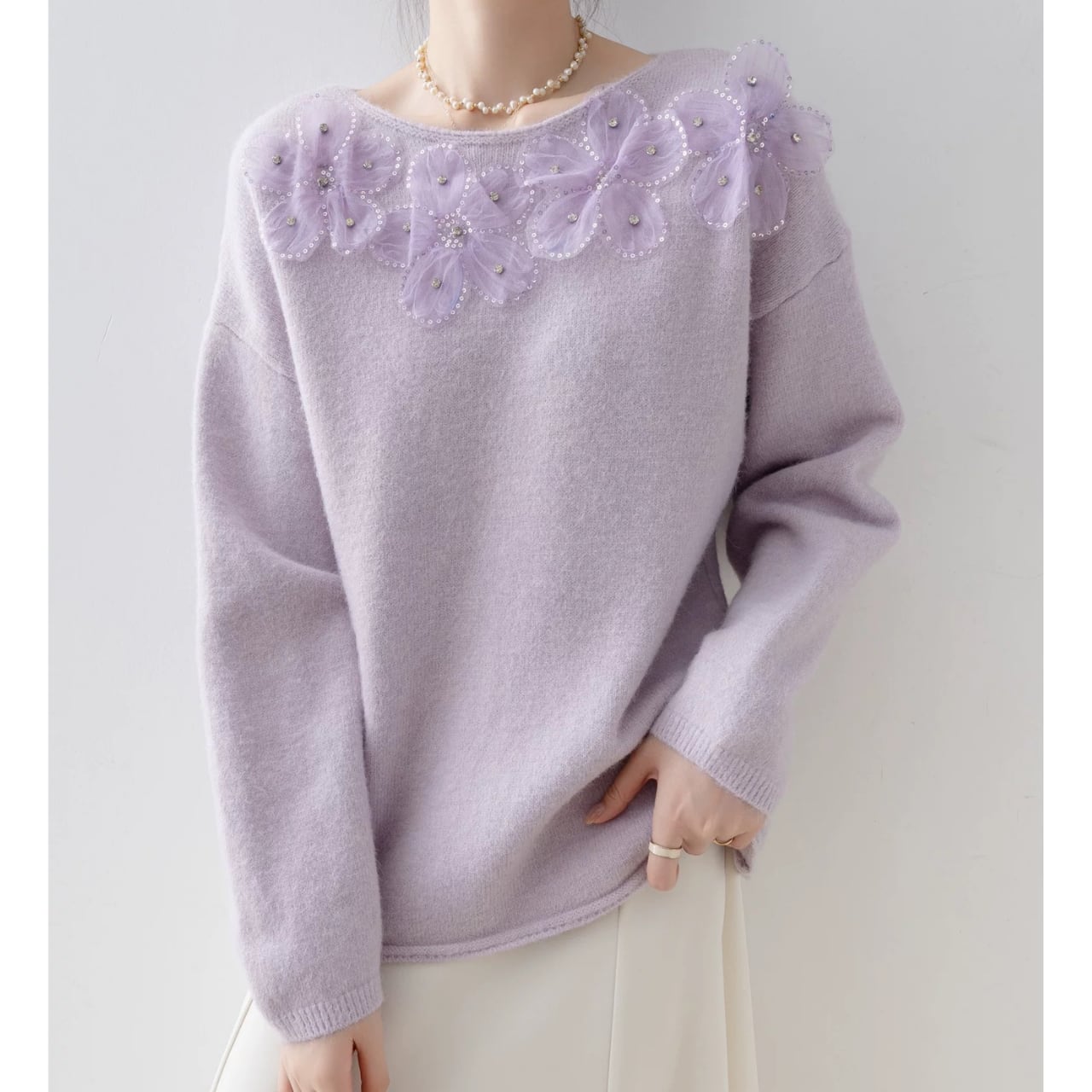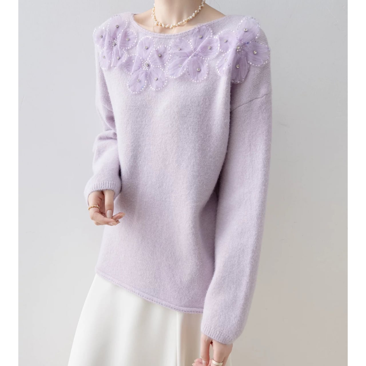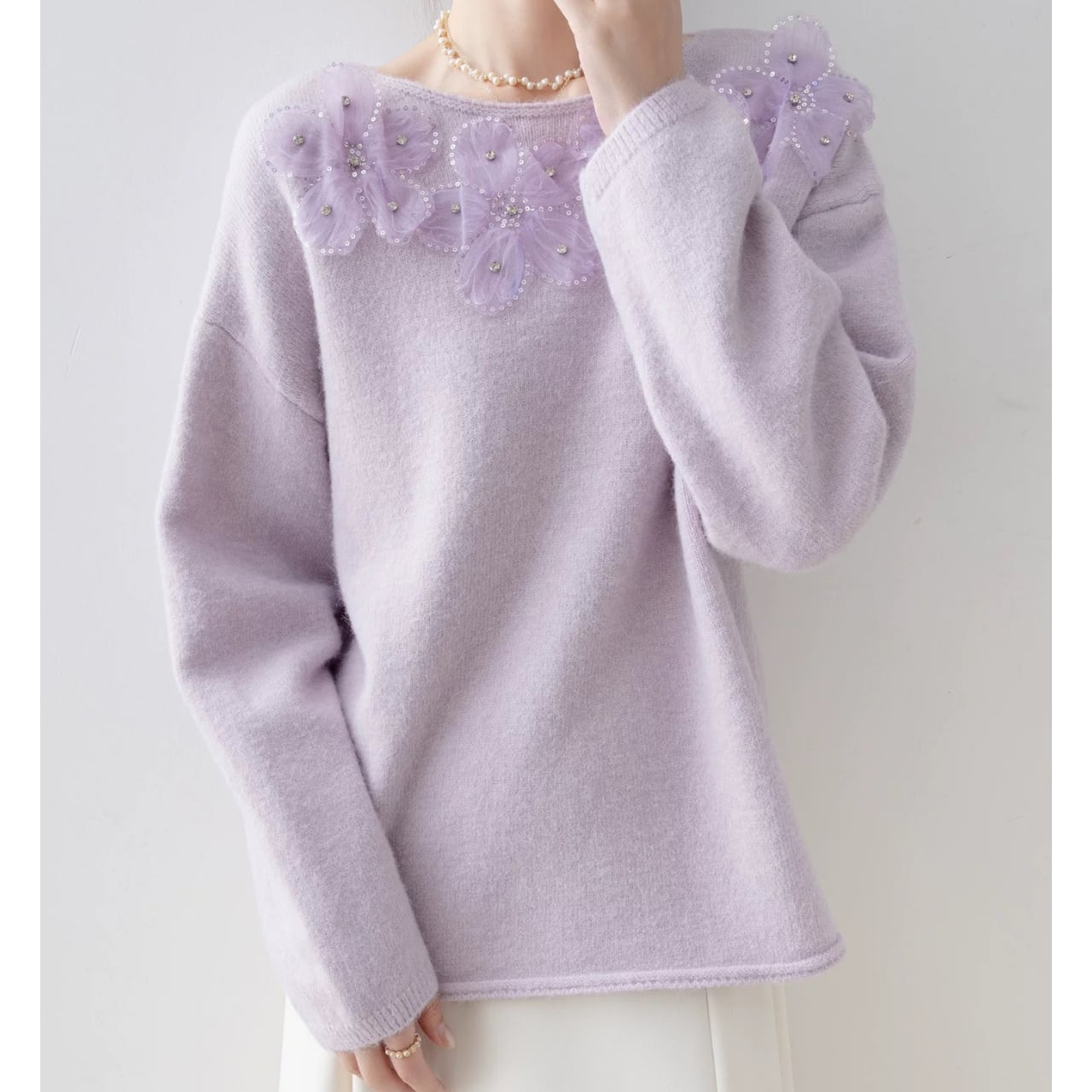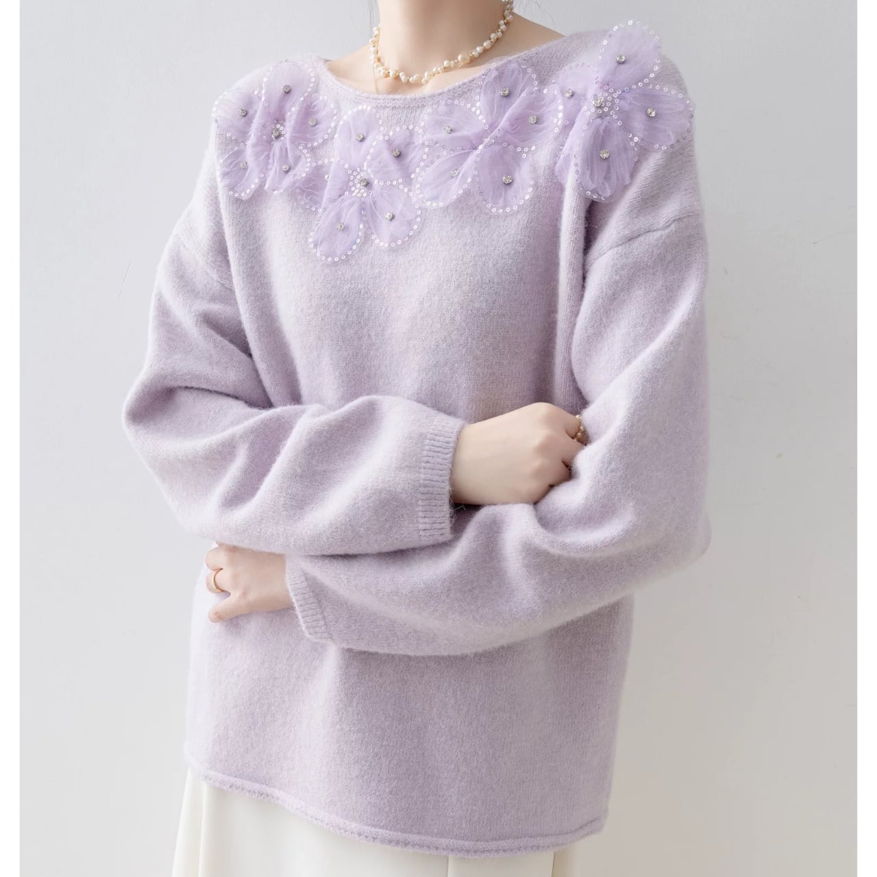 繊細なフラワーモチーフが胸元を彩る、優美なニットトップ。