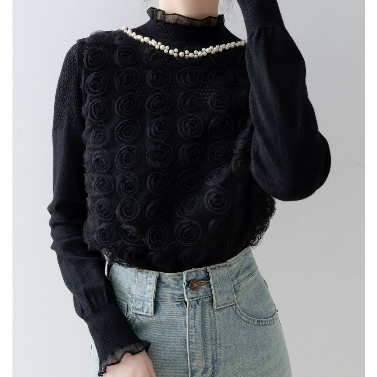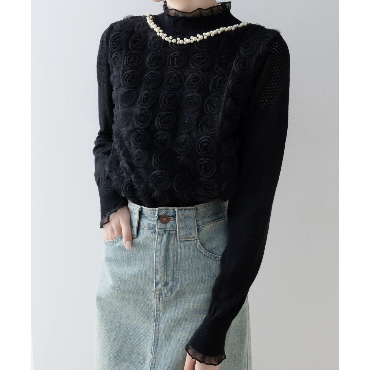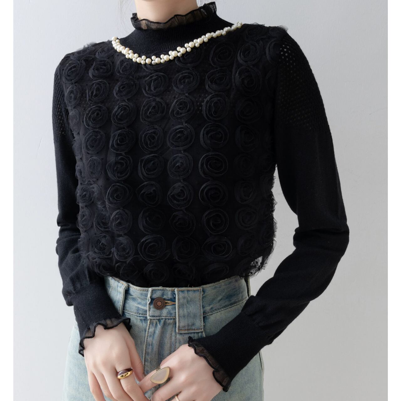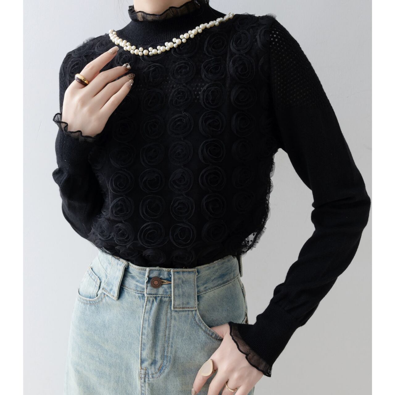立体的なローズモチーフが、奥行きのある表情を演出。