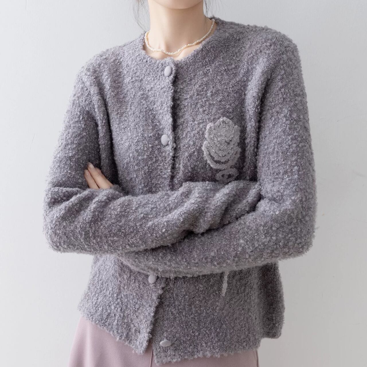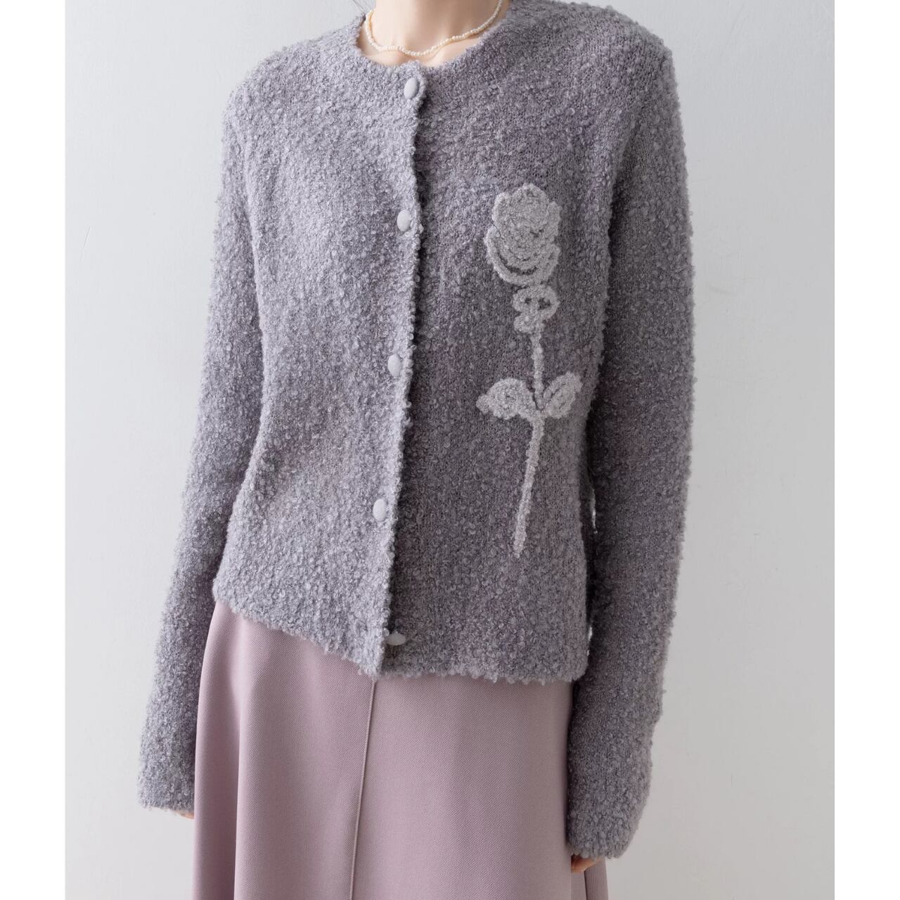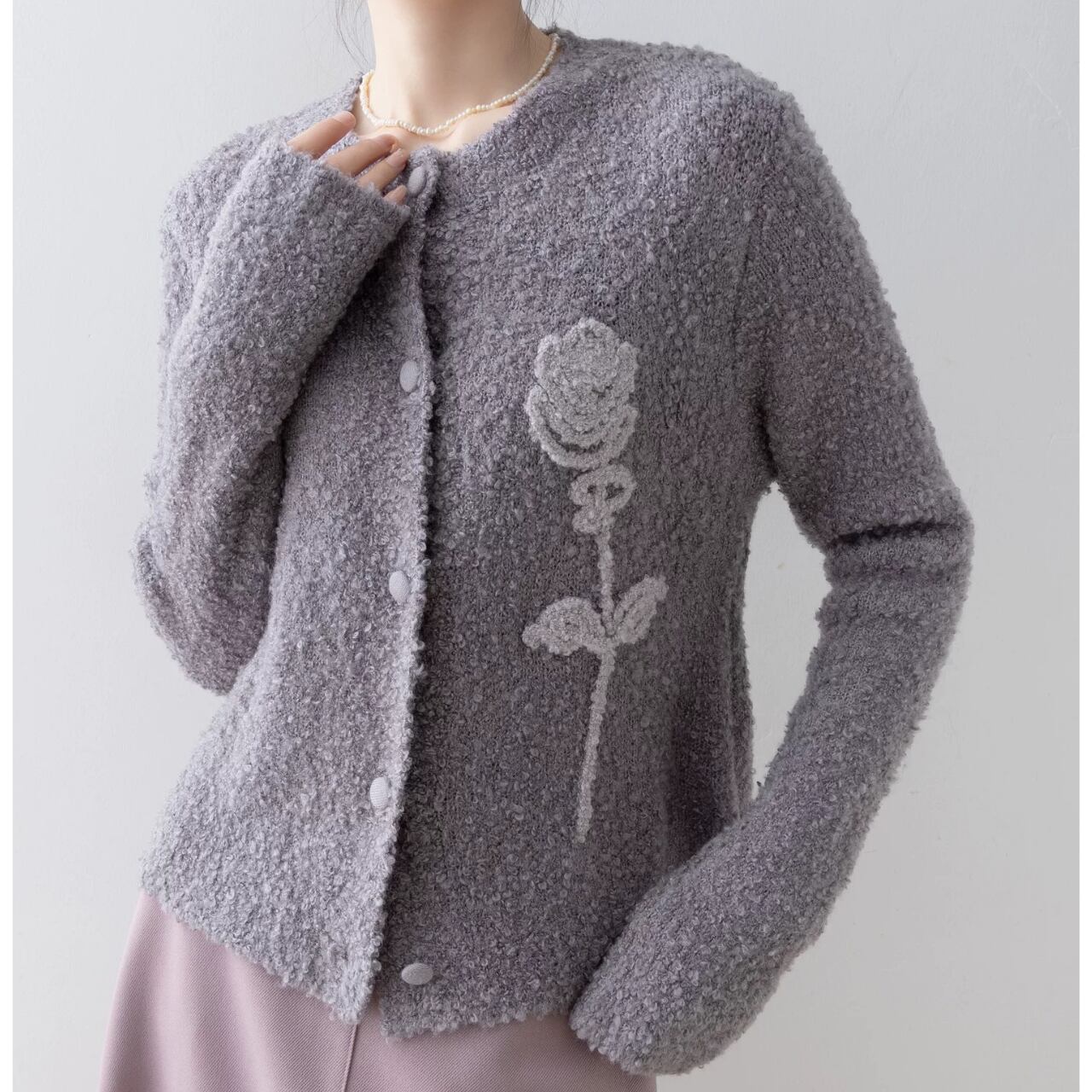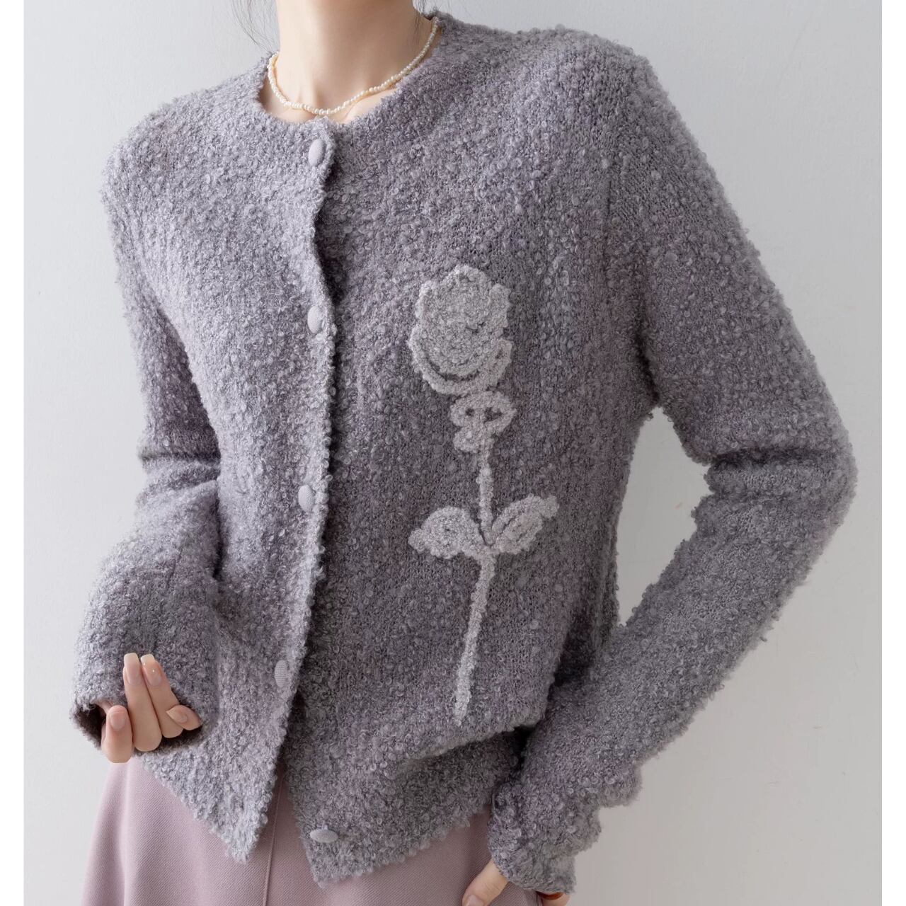 表情豊かなブークレ素材に、立体的なローズモチーフを添えた一着。