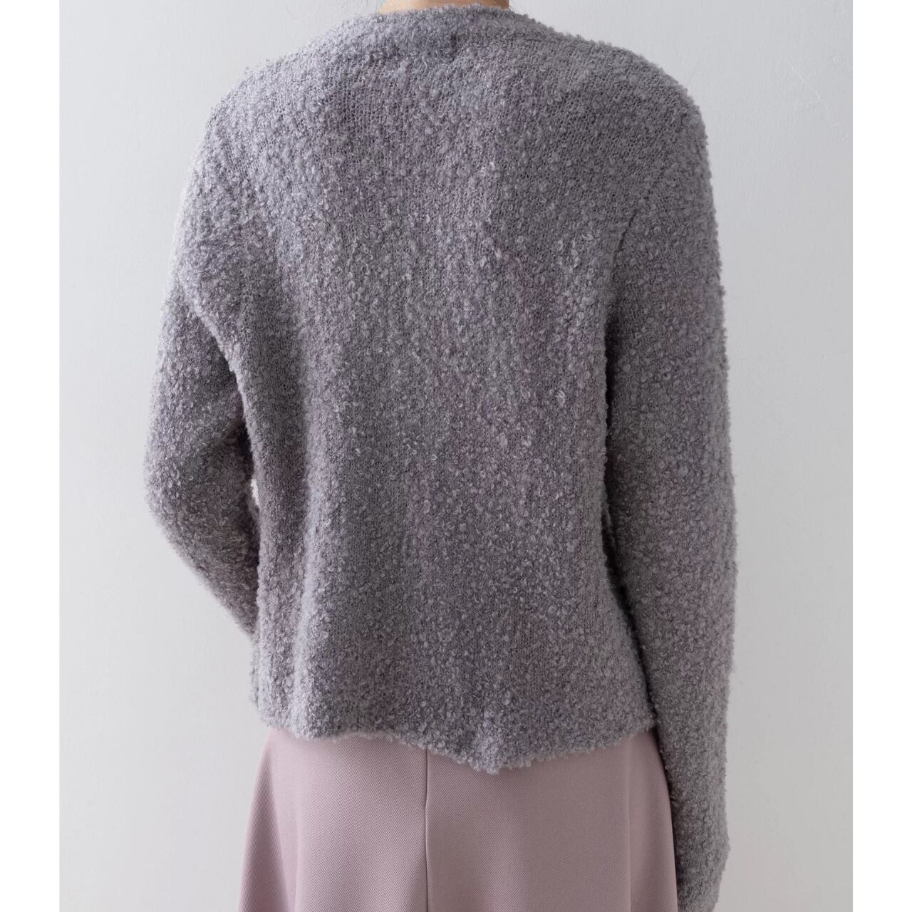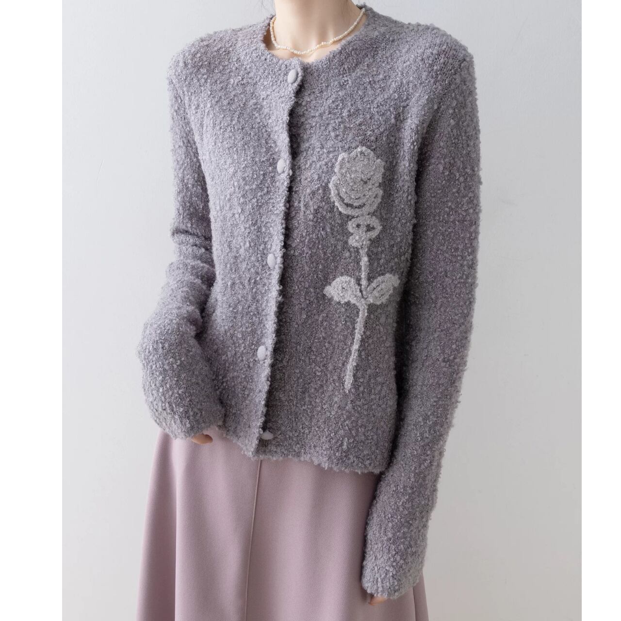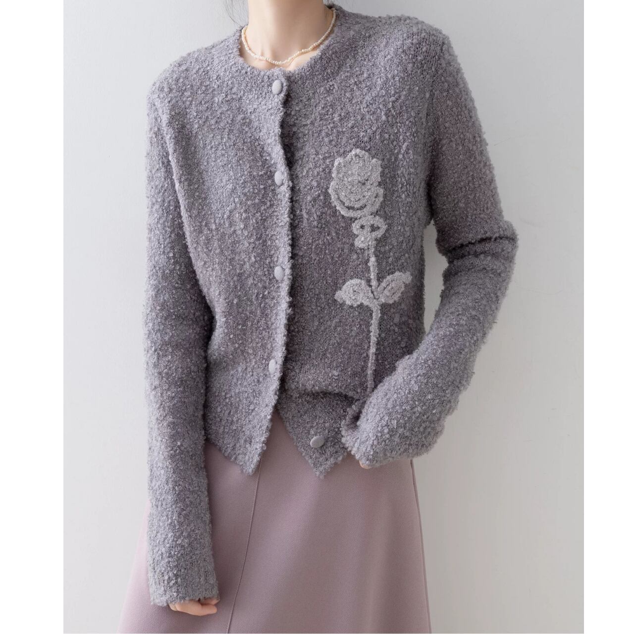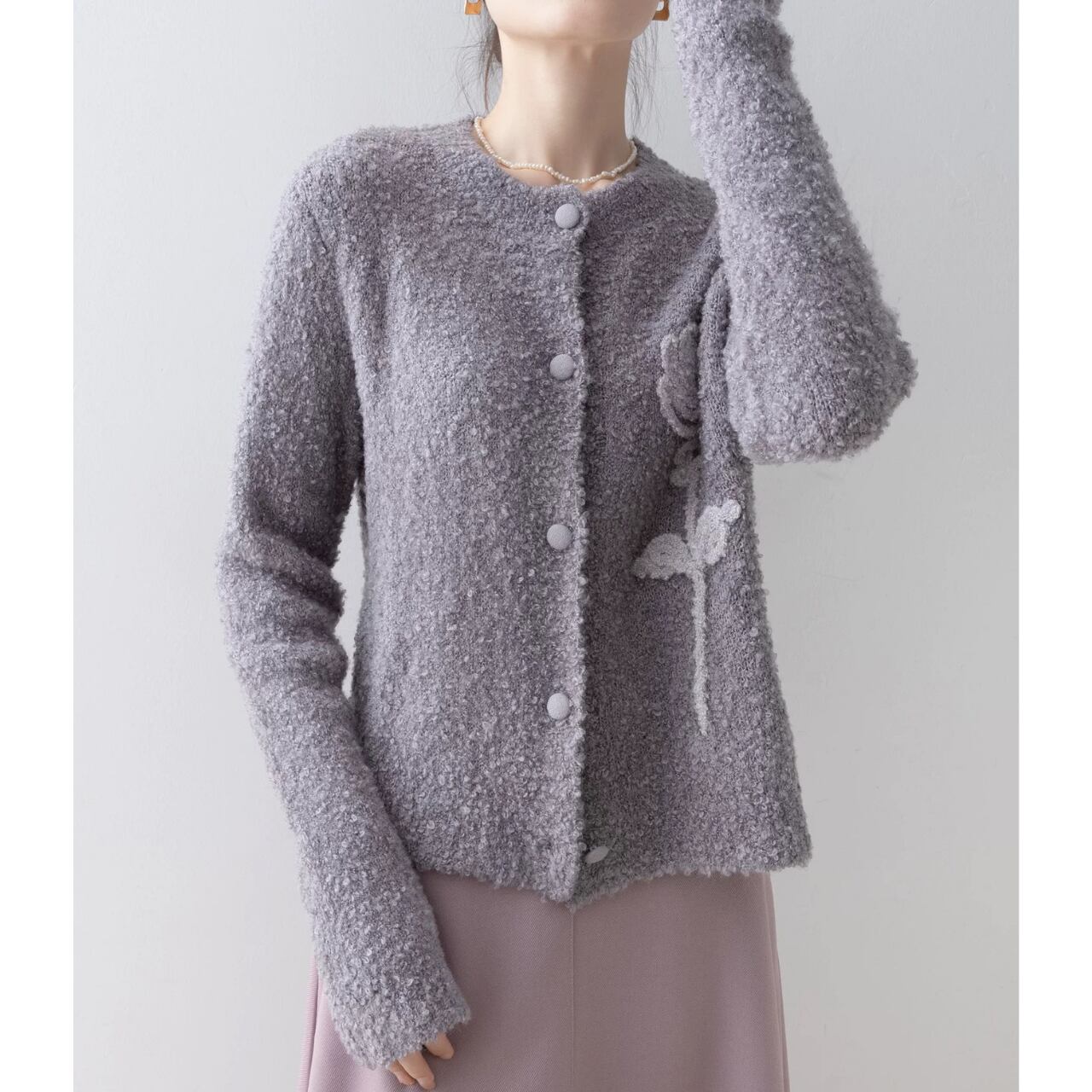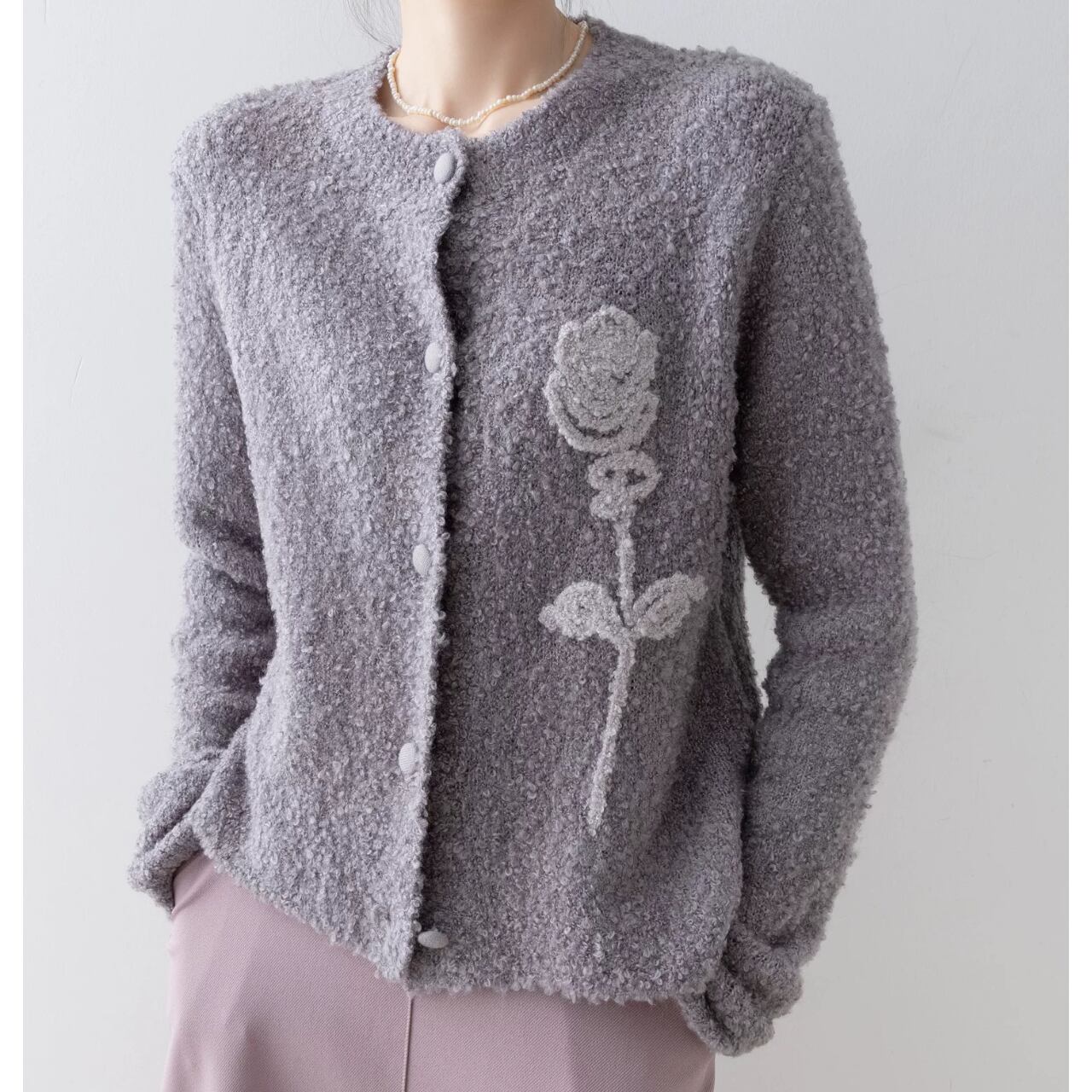 表情豊かなブークレ素材に、立体的なローズモチーフを添えた一着。