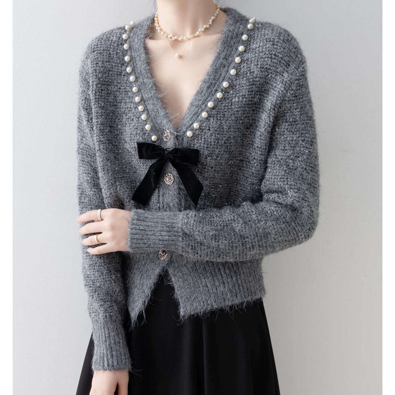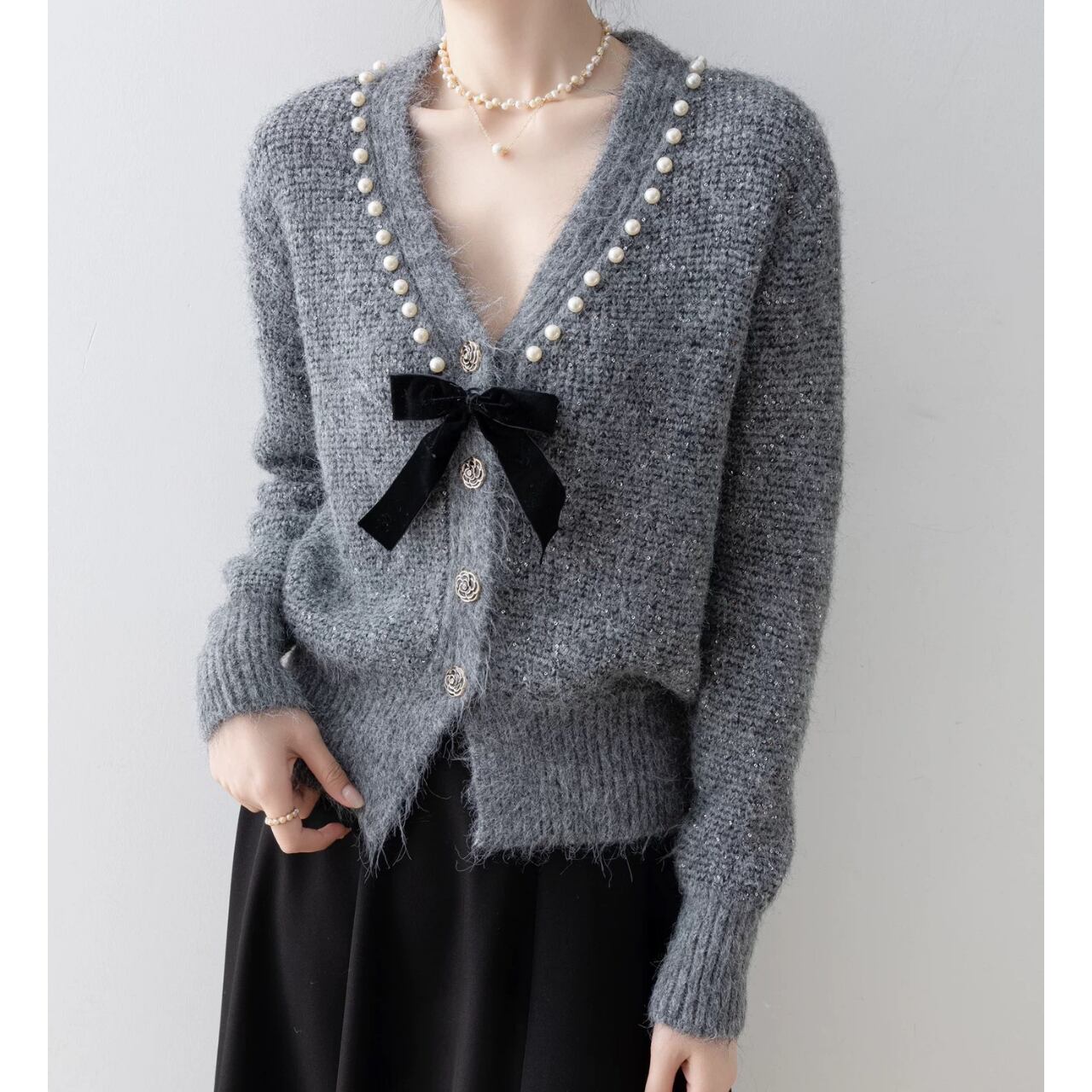ネックラインのパールとベルベットリボンが印象的なデザイン。
