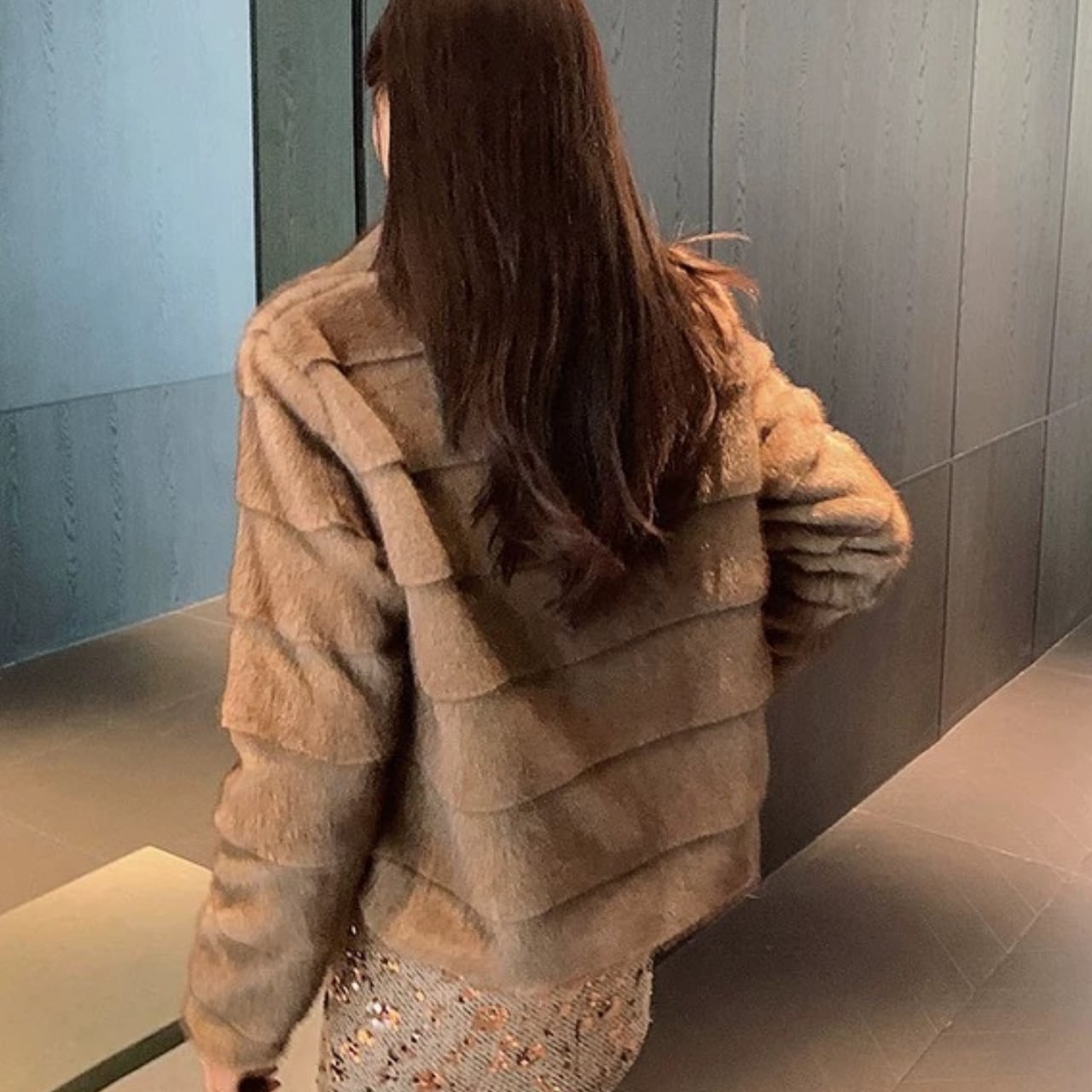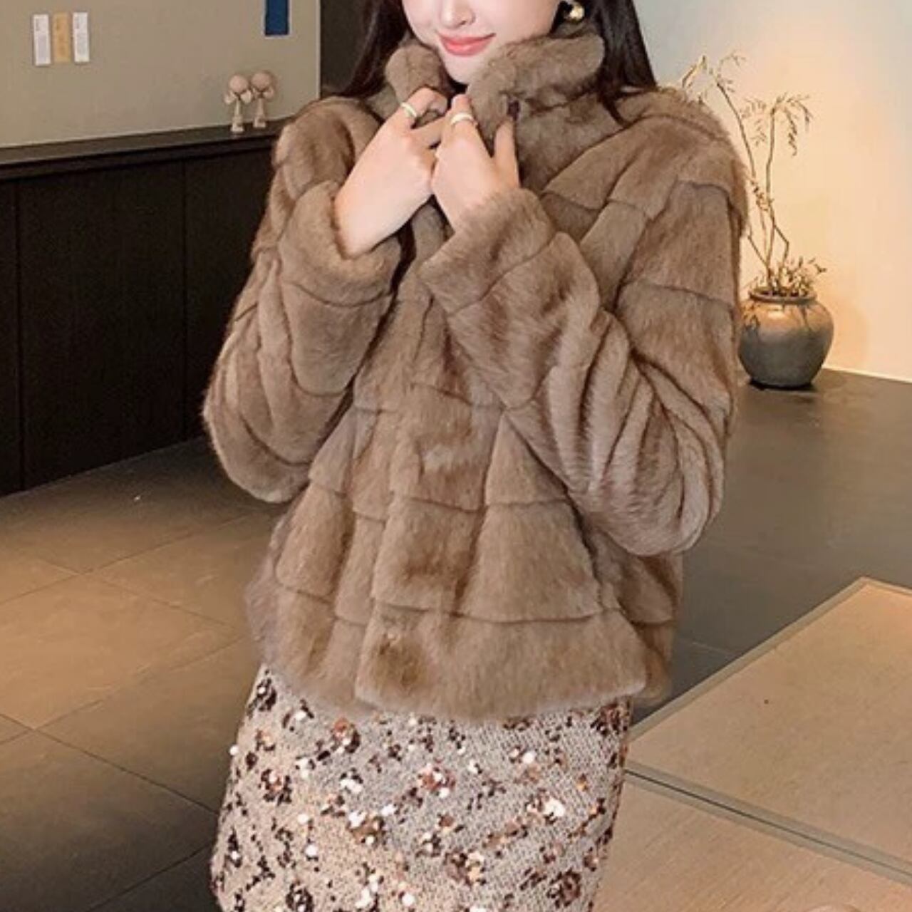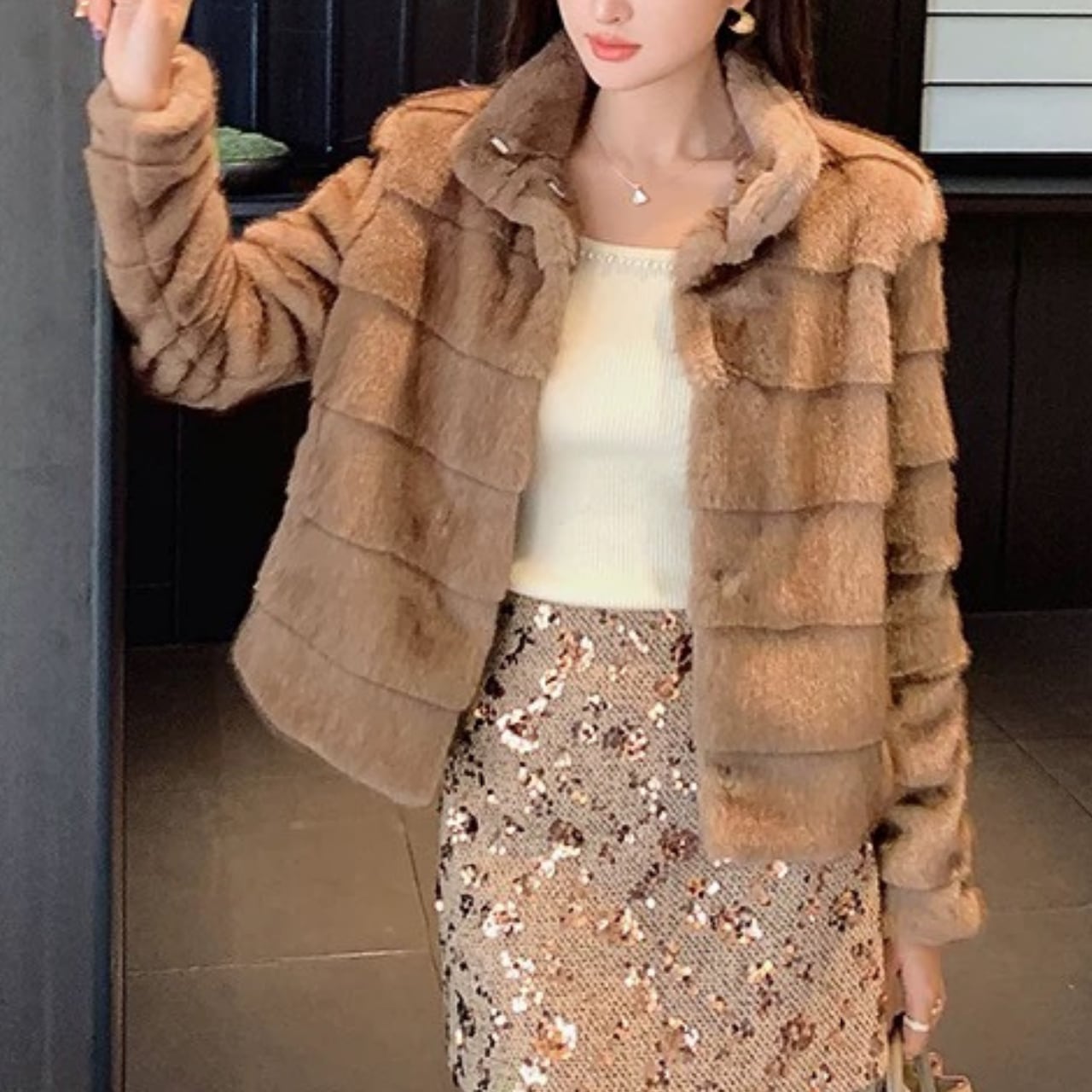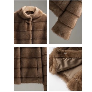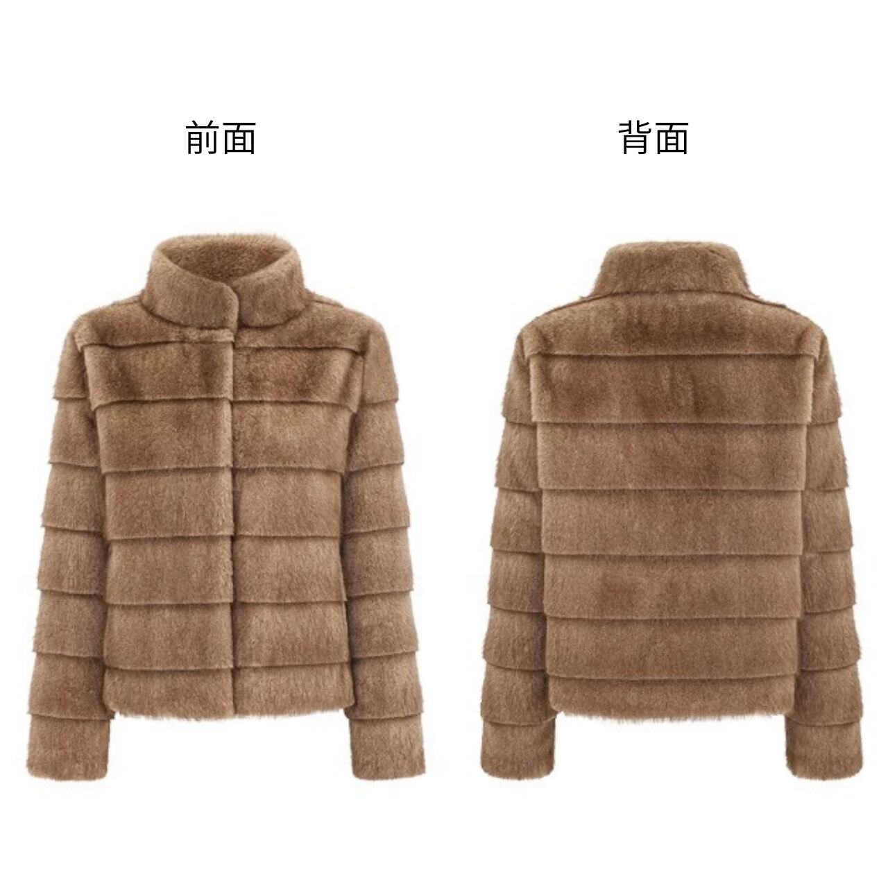 上質感のあるフェイクファーで仕立てたショート丈ジャケット。