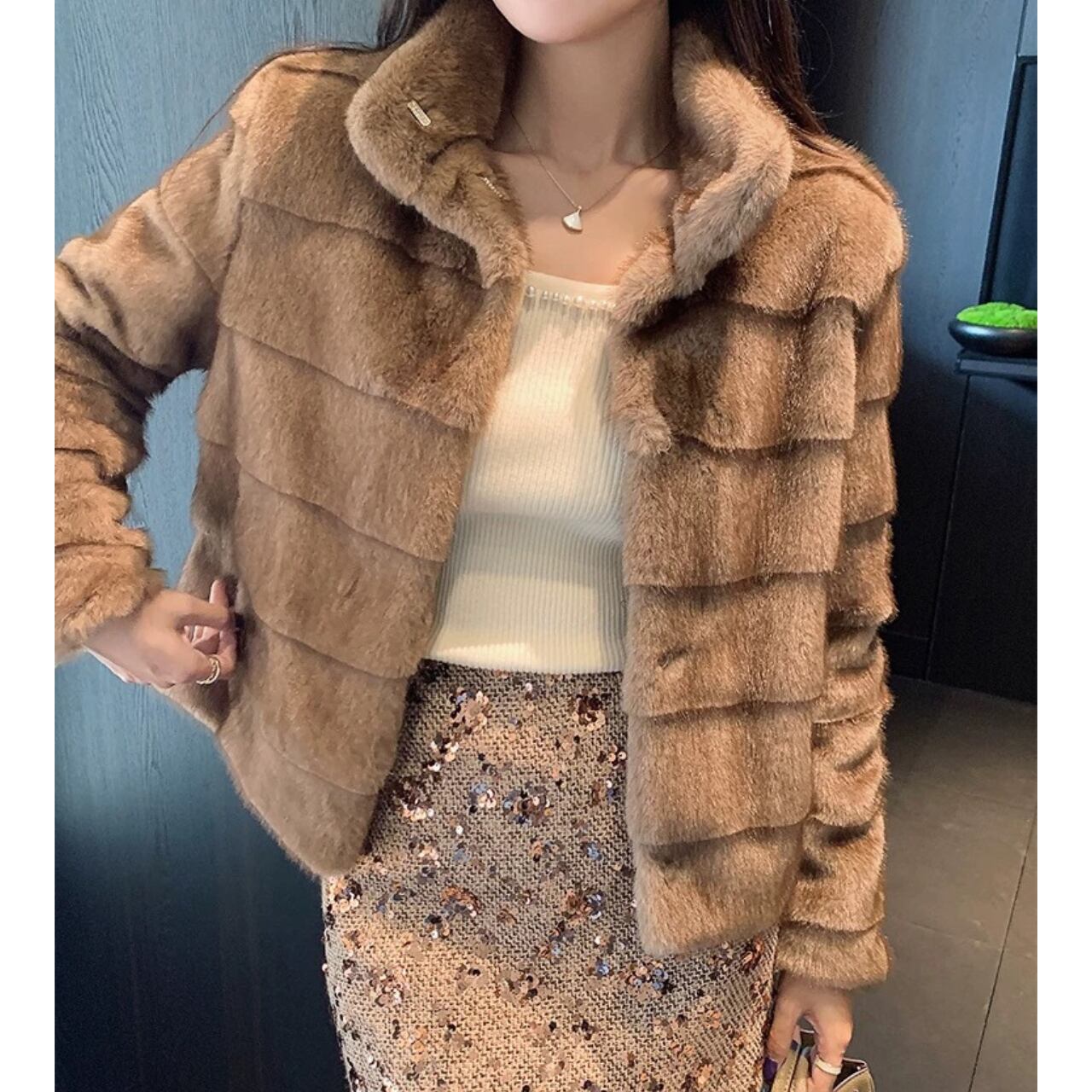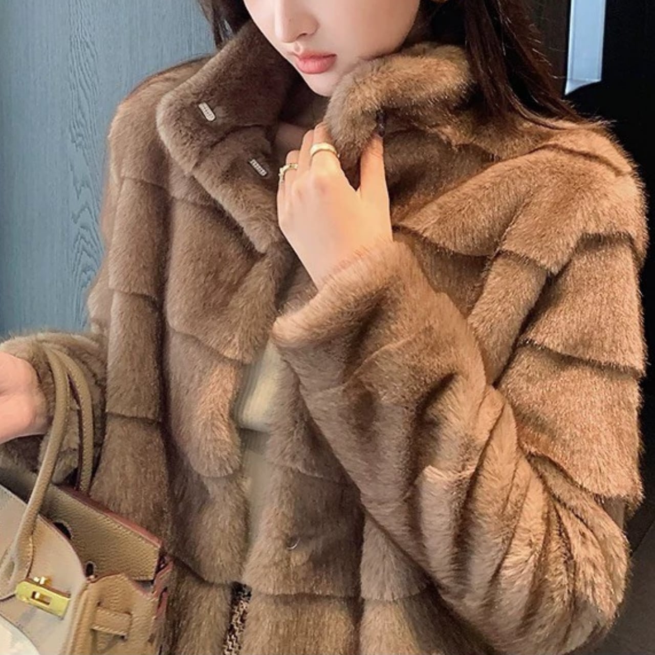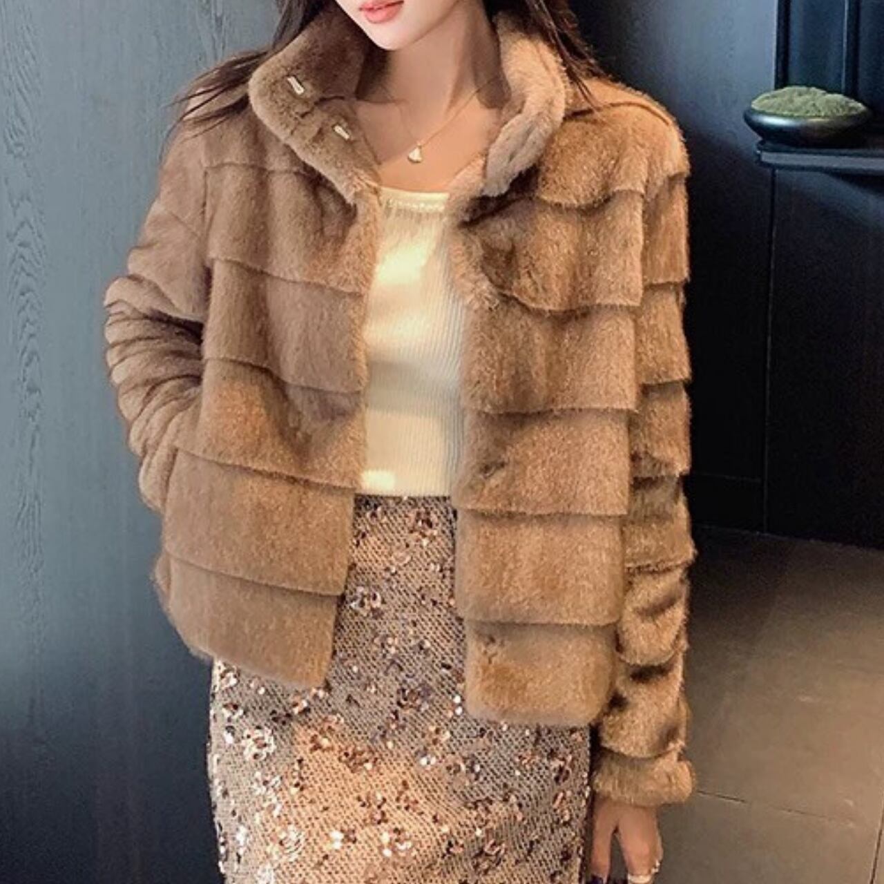上質感のあるフェイクファーで仕立てたショート丈ジャケット。