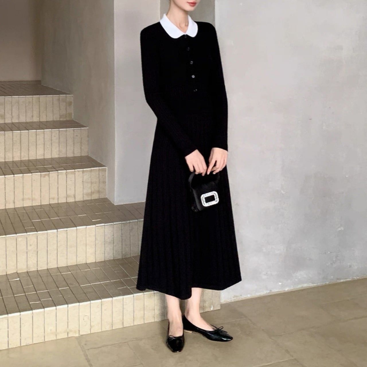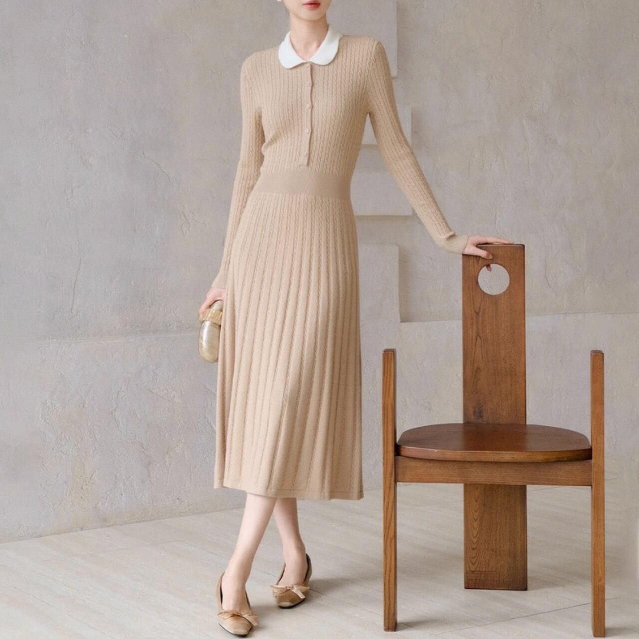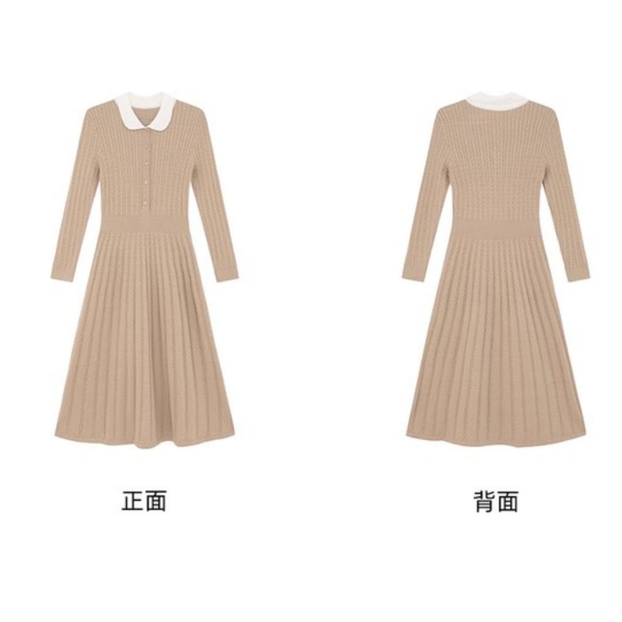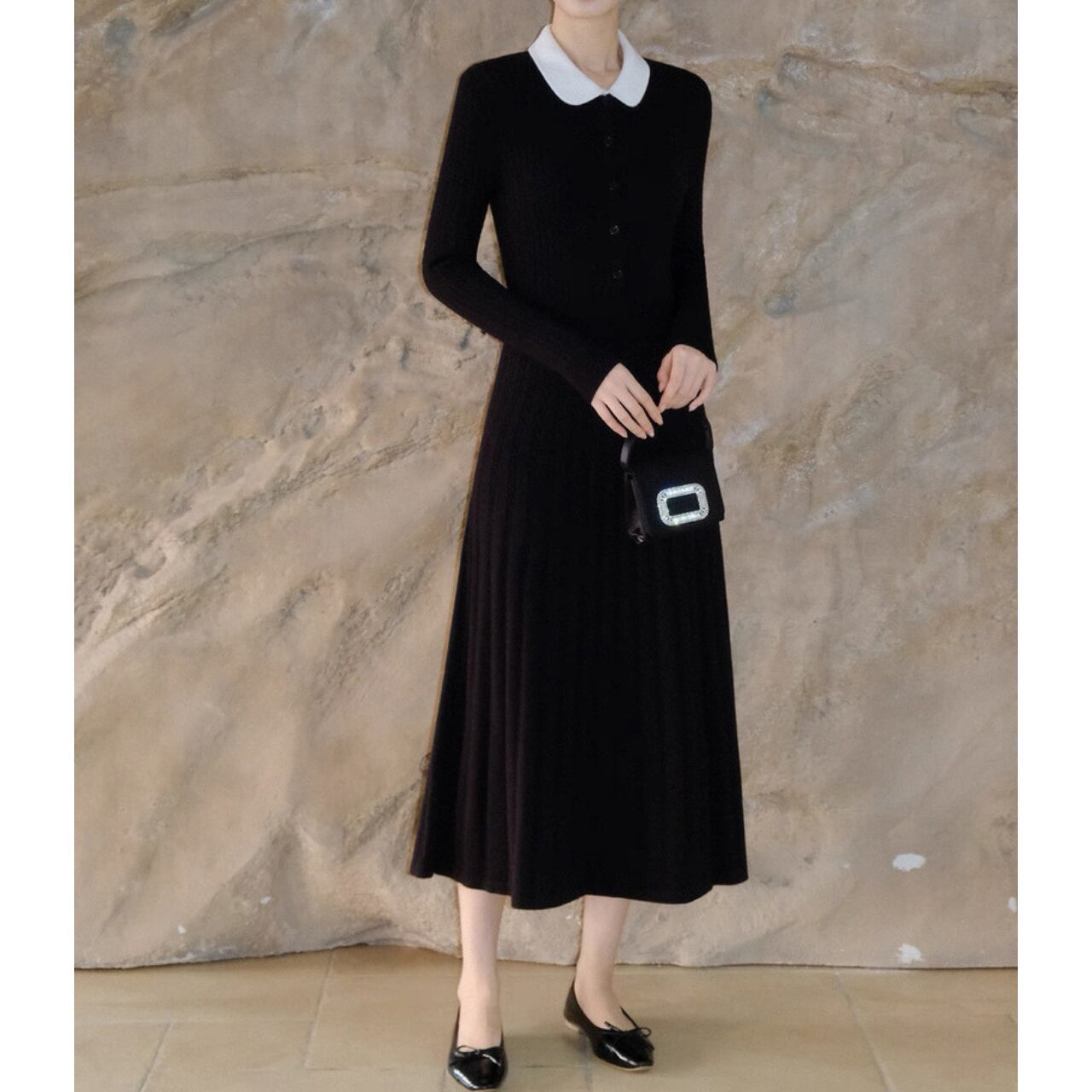 クラシック丸襟リブニットワンピース W00385