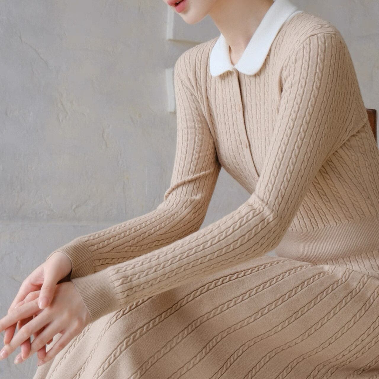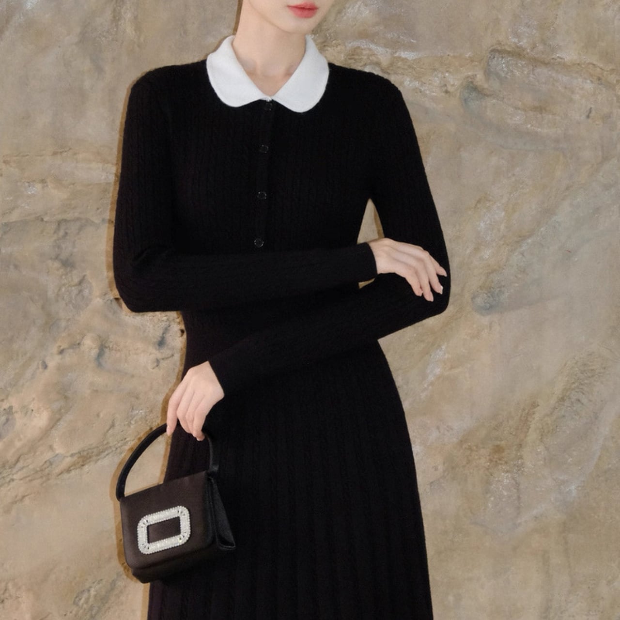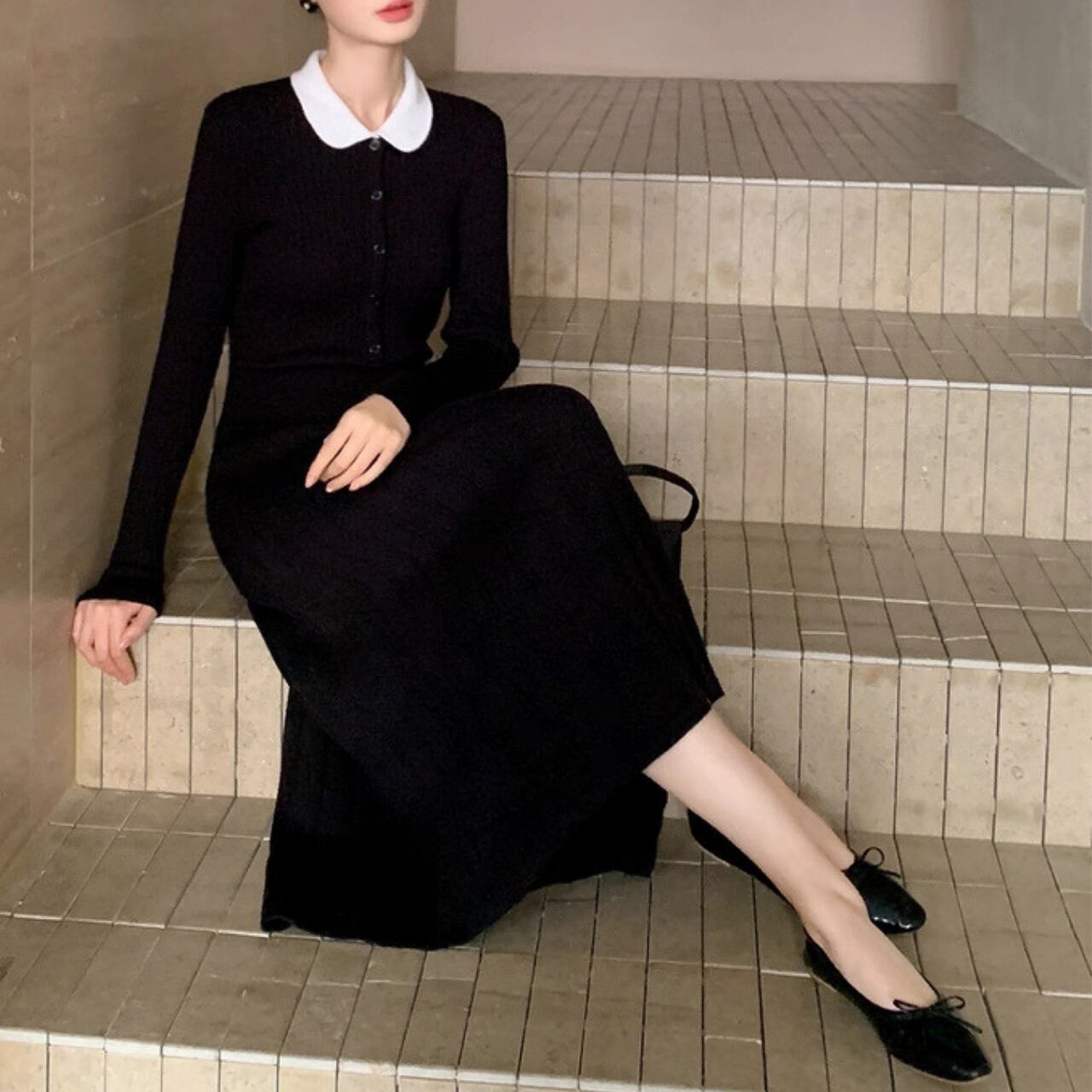 クラシック丸襟リブニットワンピース W00385