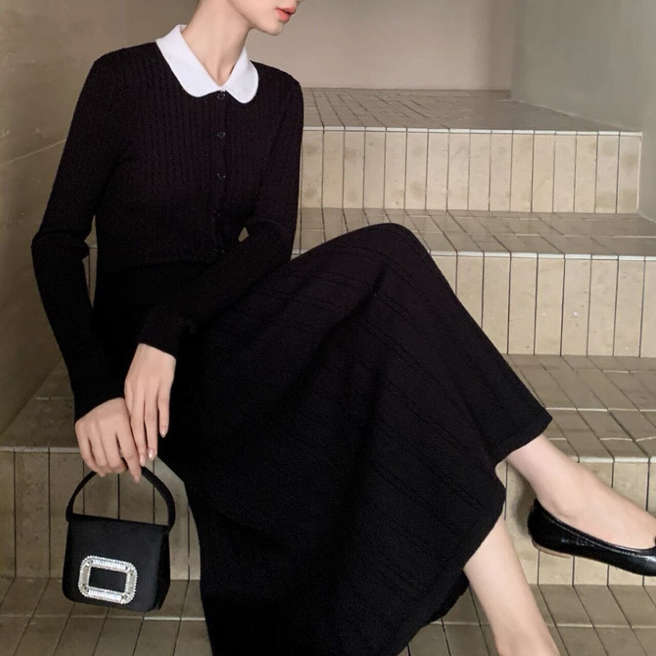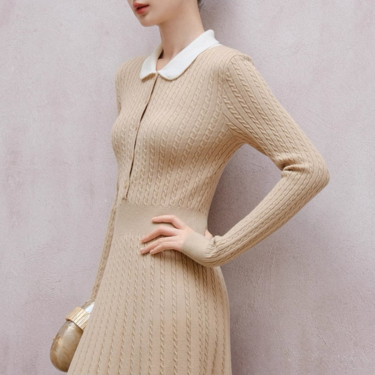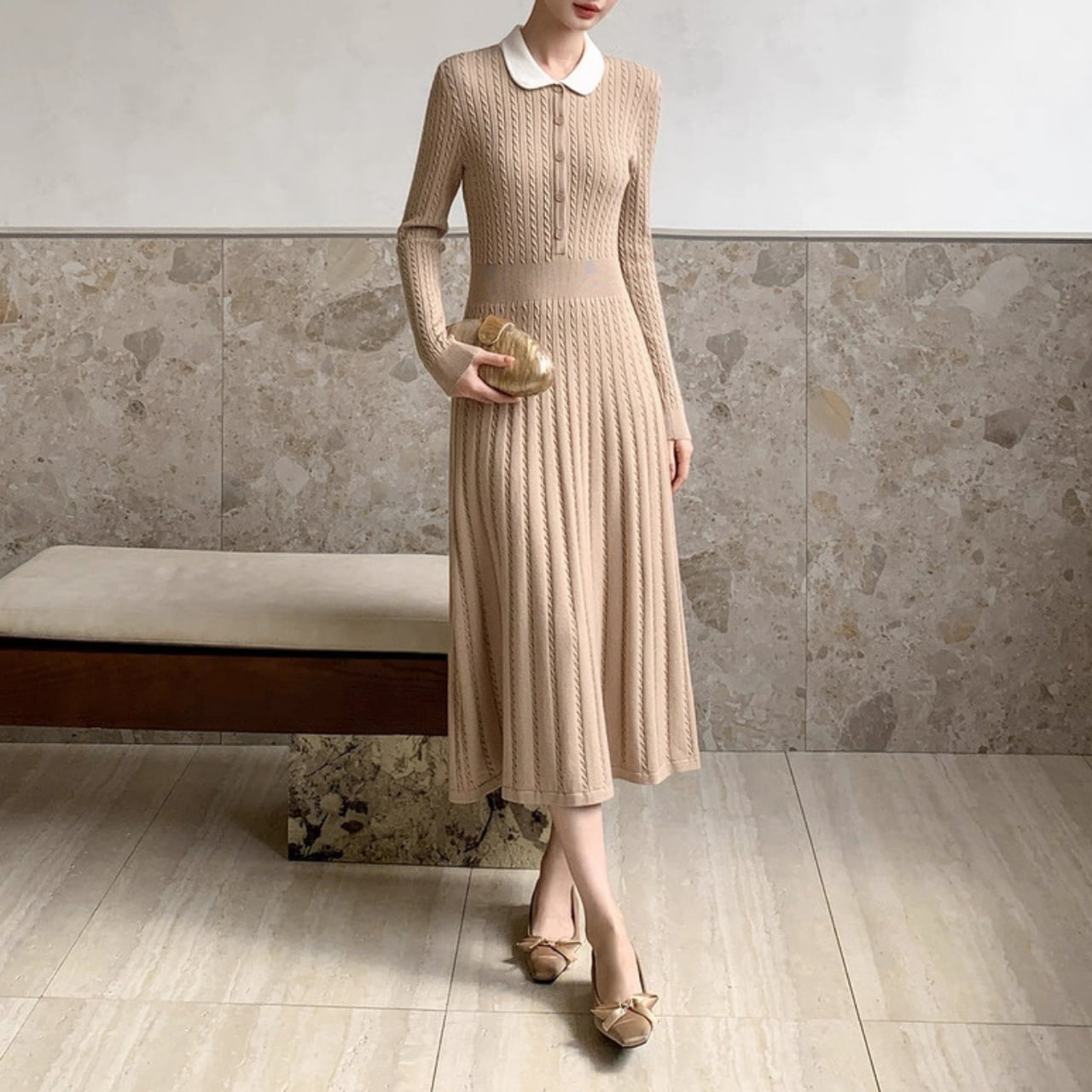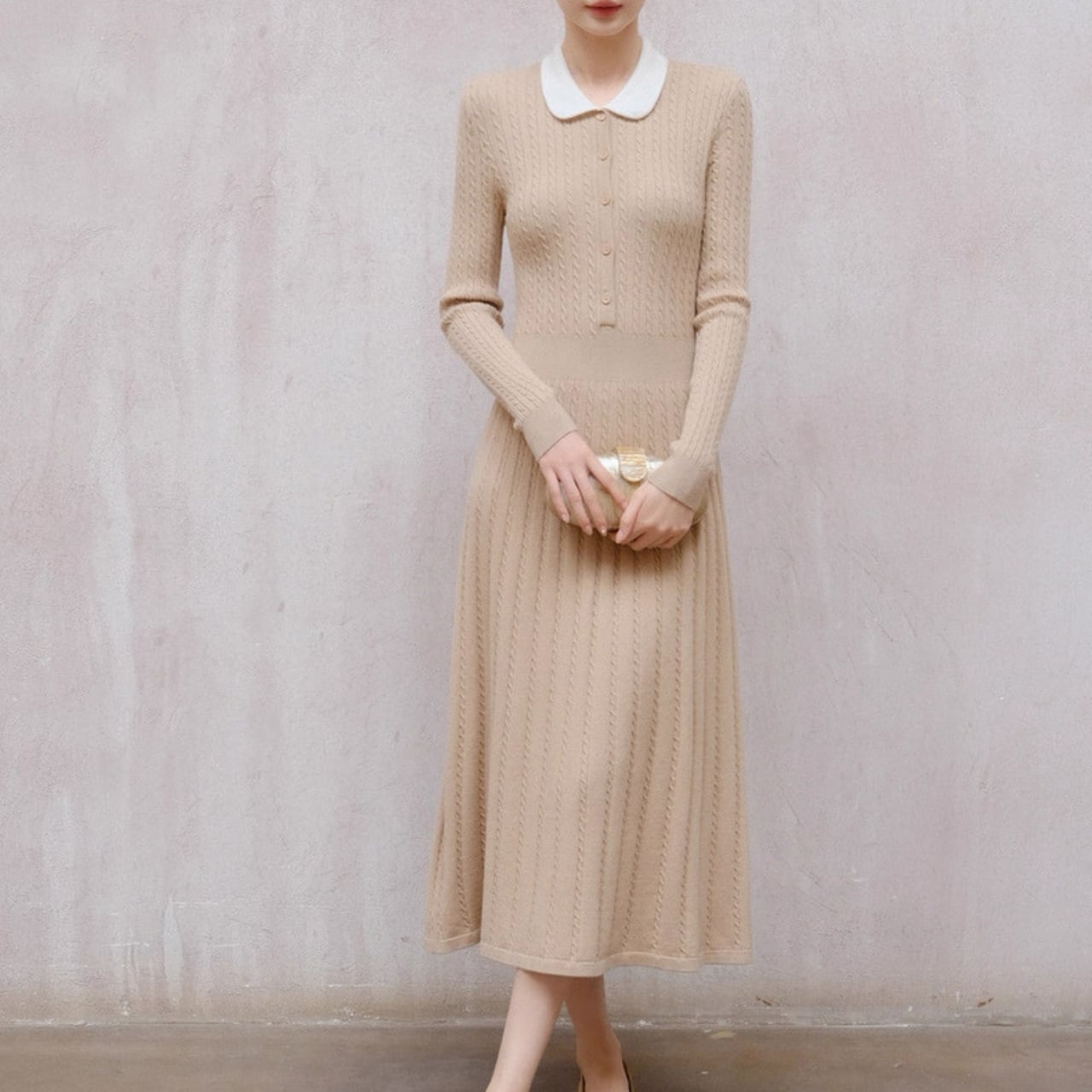 クラシック丸襟リブニットワンピース W00385