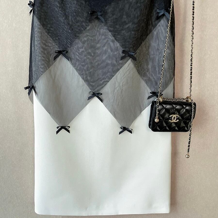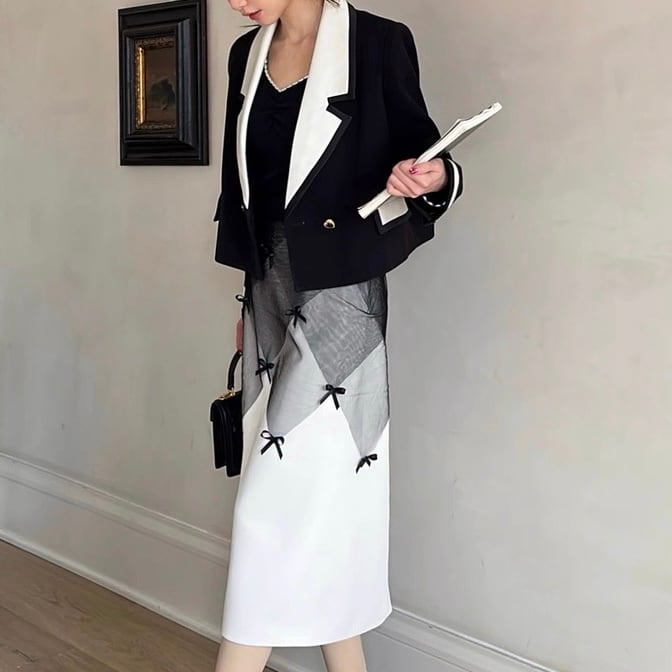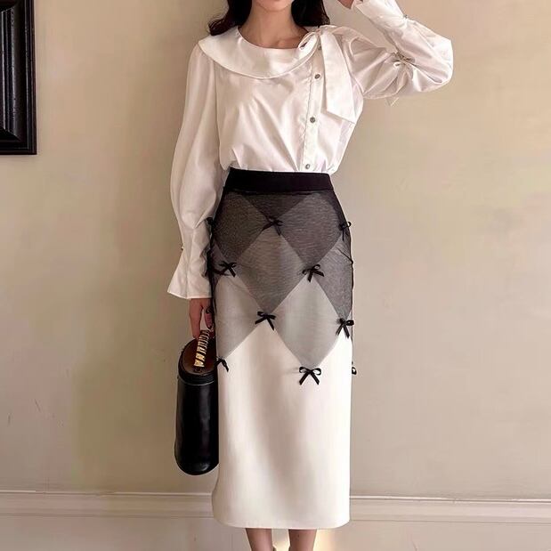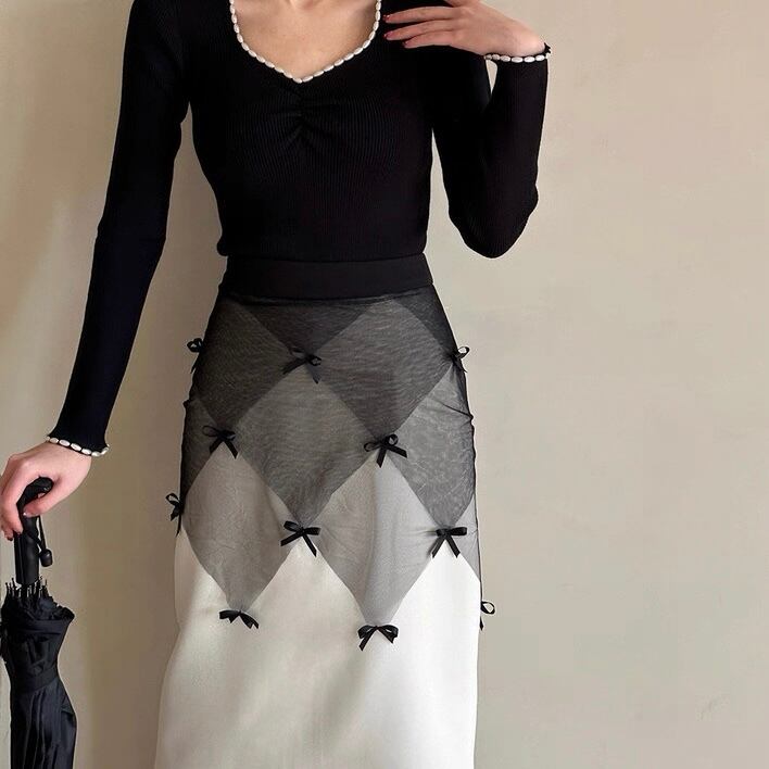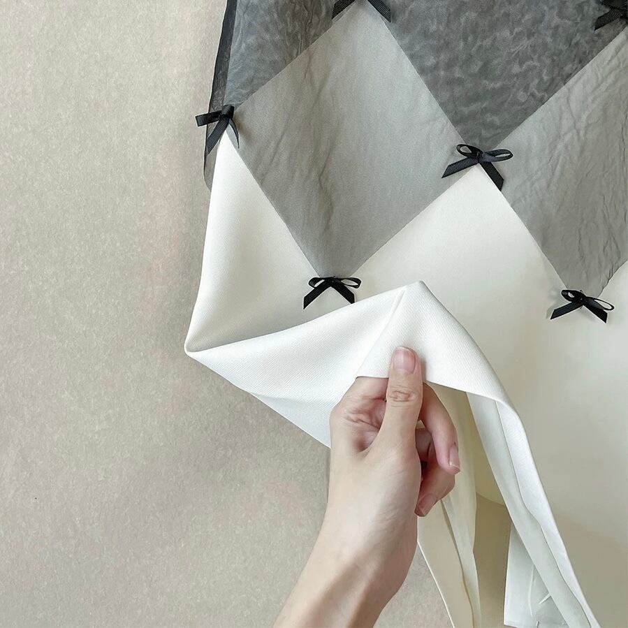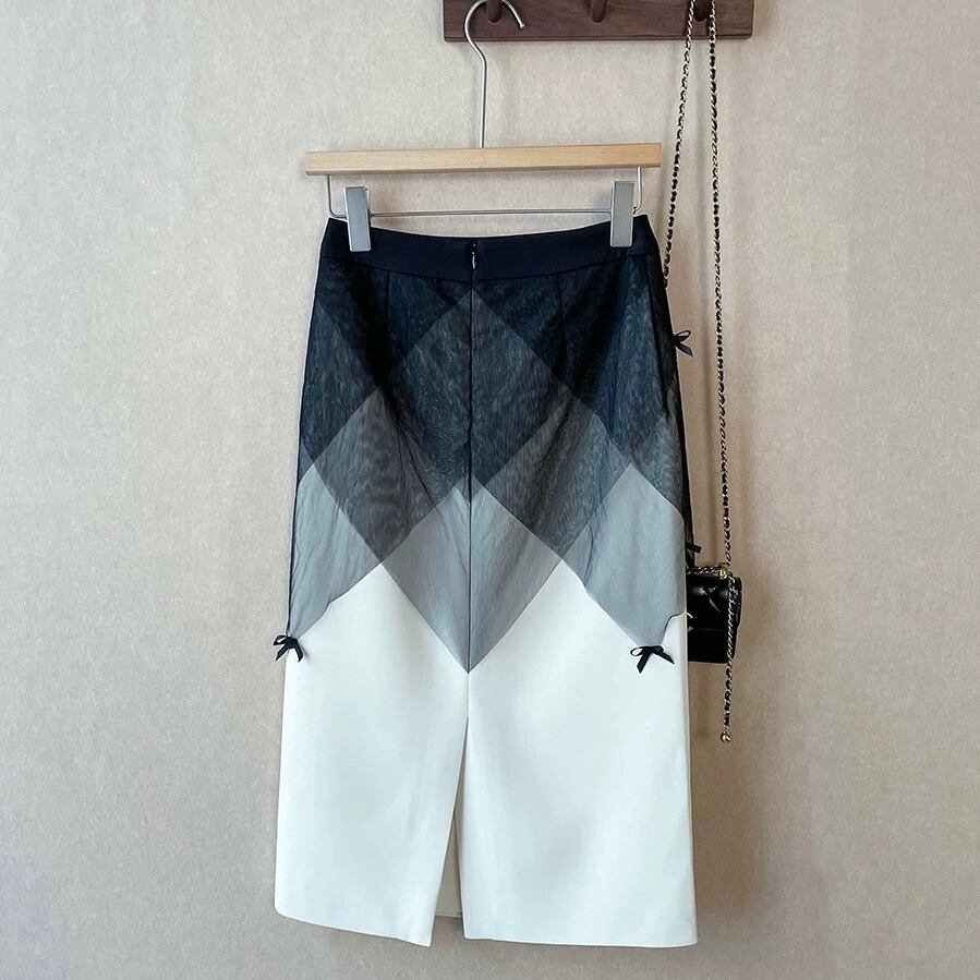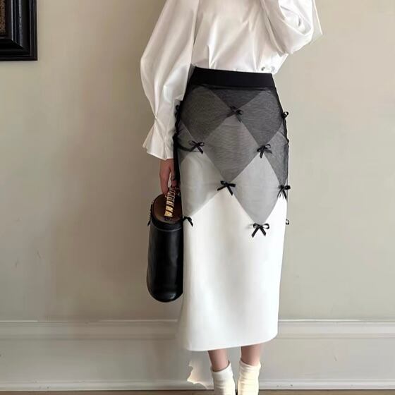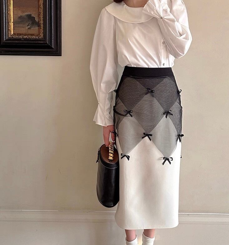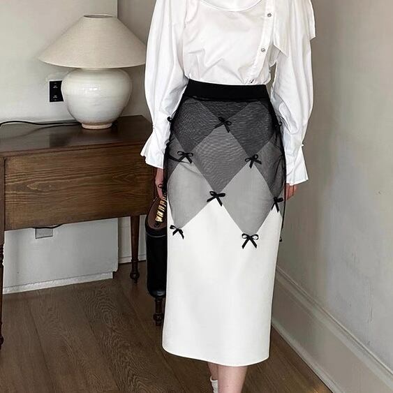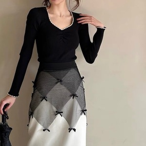立体感のあるメッシュデザインとミニリボンが連なる、エレガントなミディスカートです。
