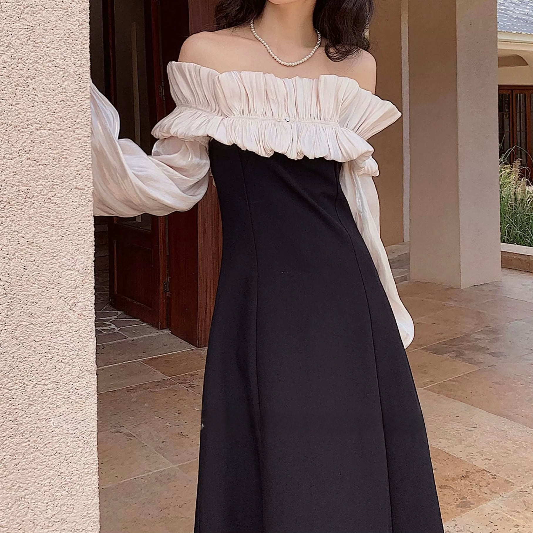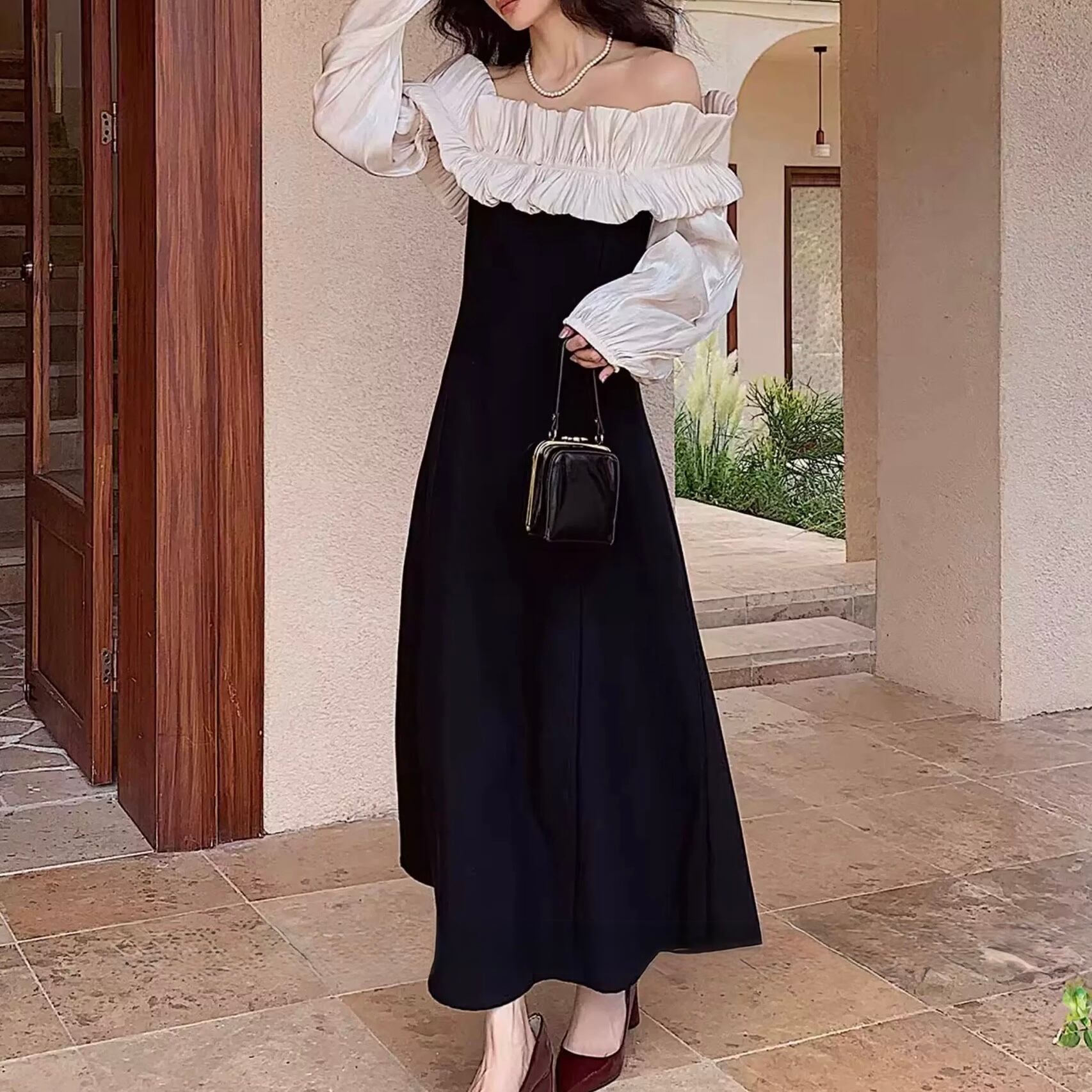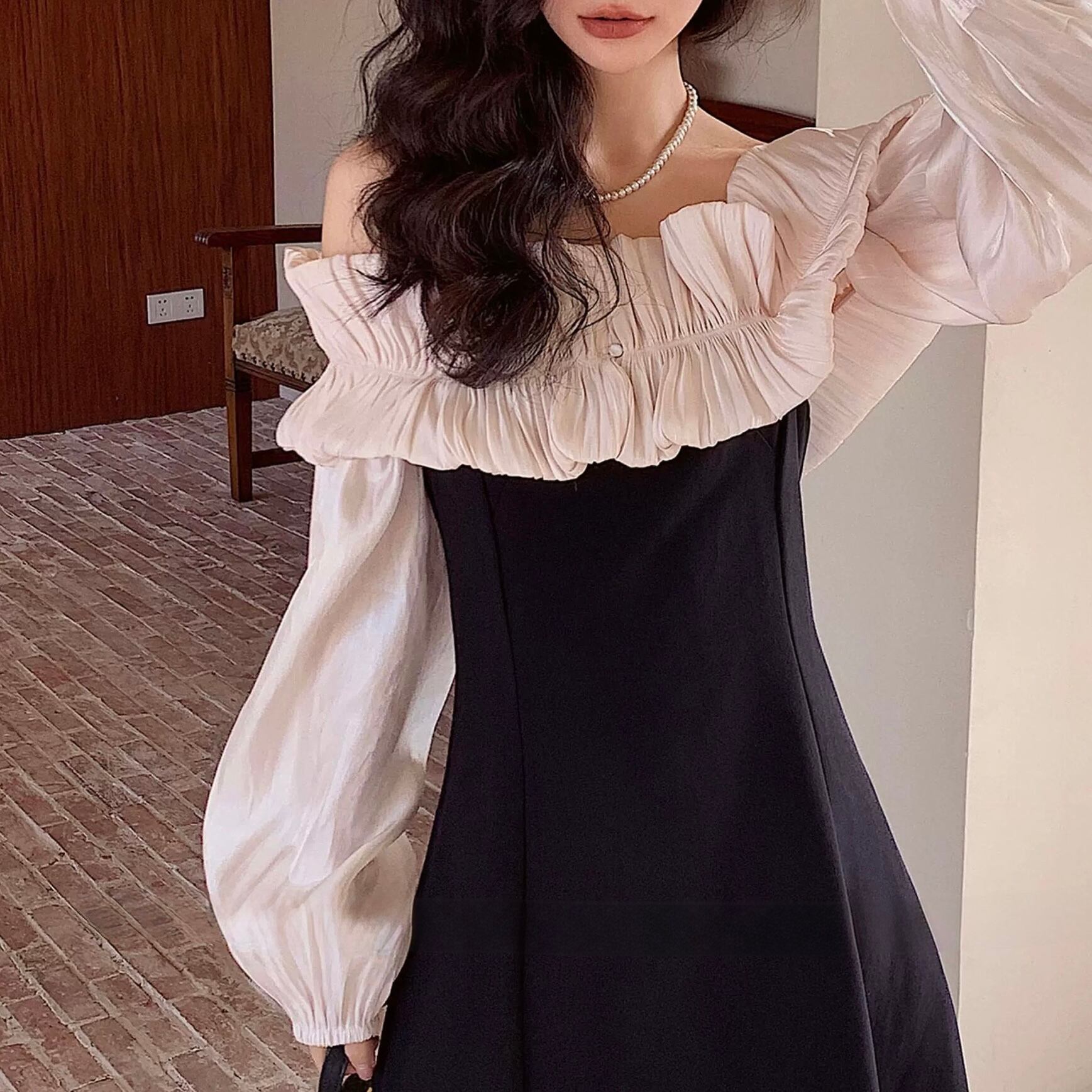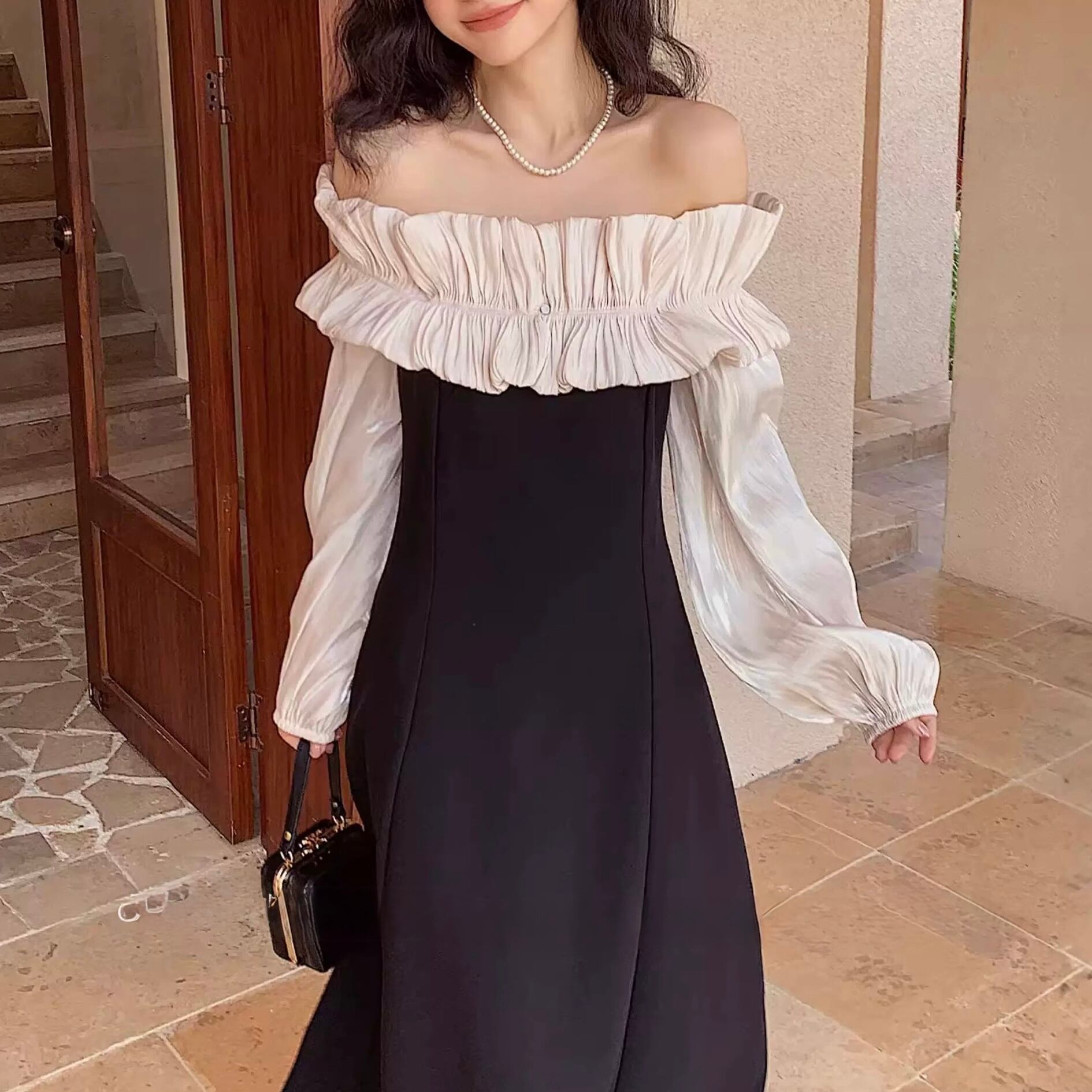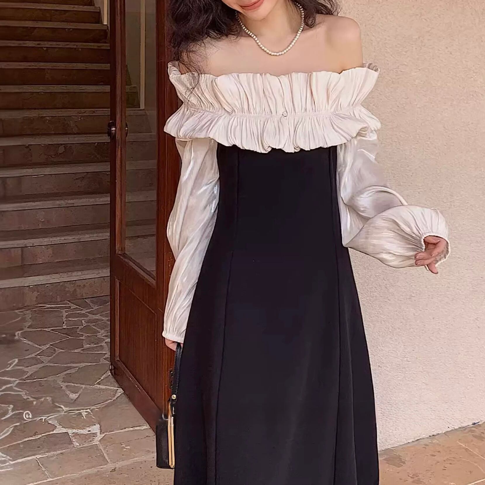 デコルテを美しく引き立てるオフショルダーに、繊細なフリルを添えた一着。