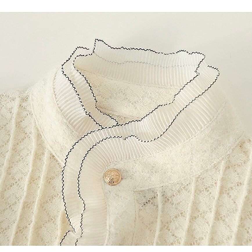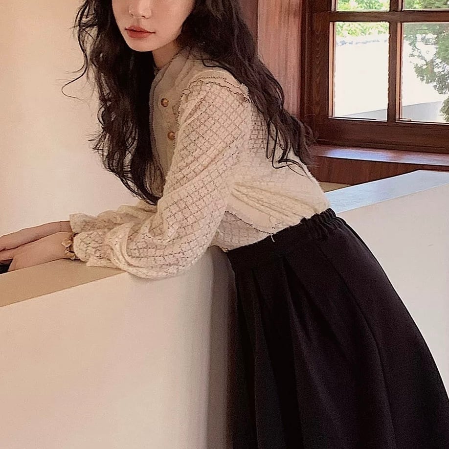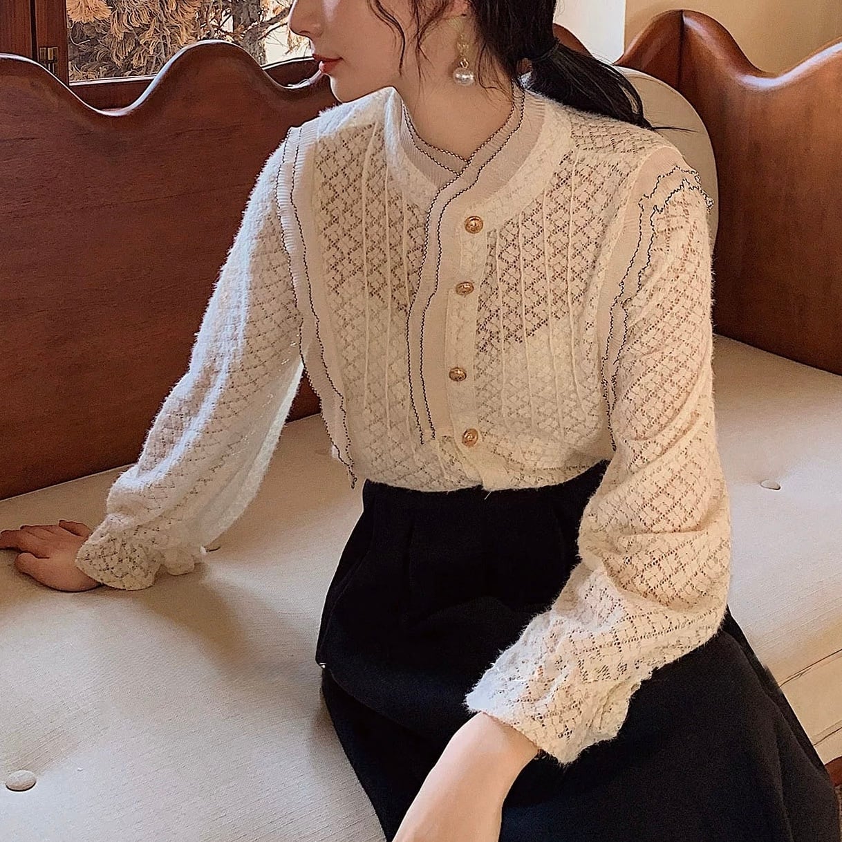 クラシカルなレースと縦ラインのディテールが上品な印象に。