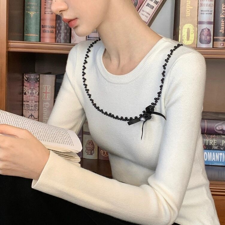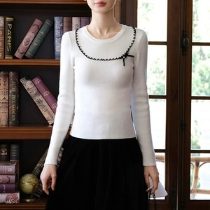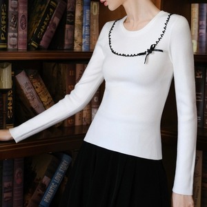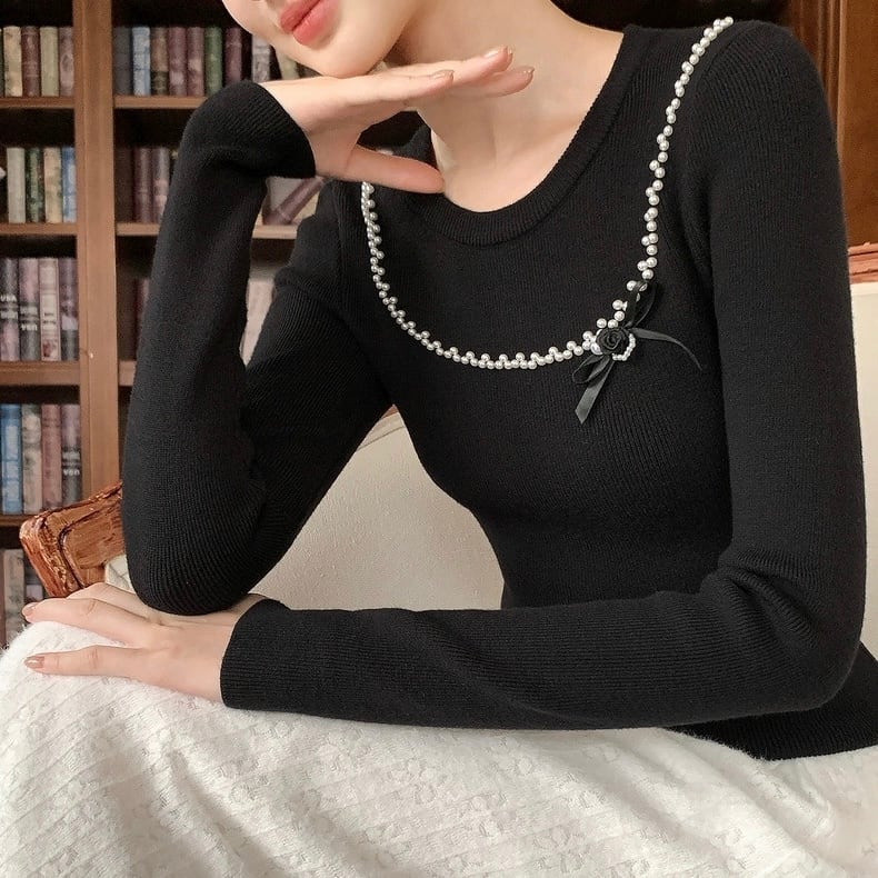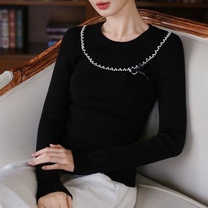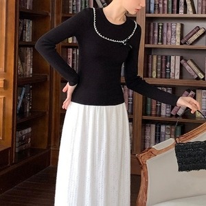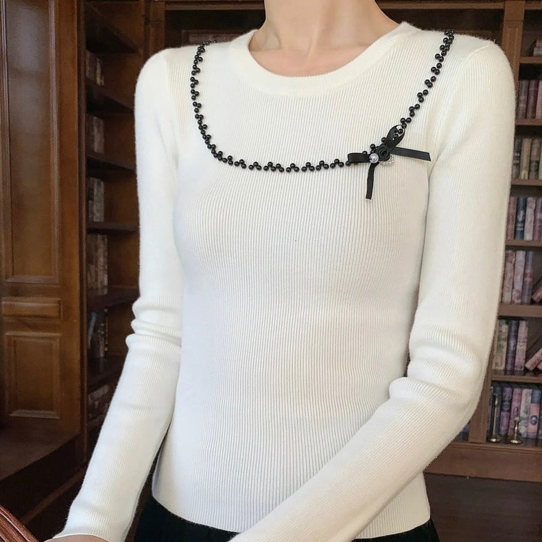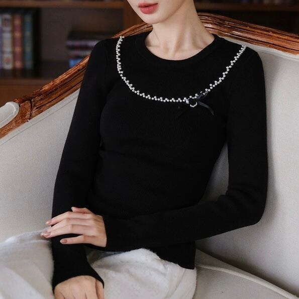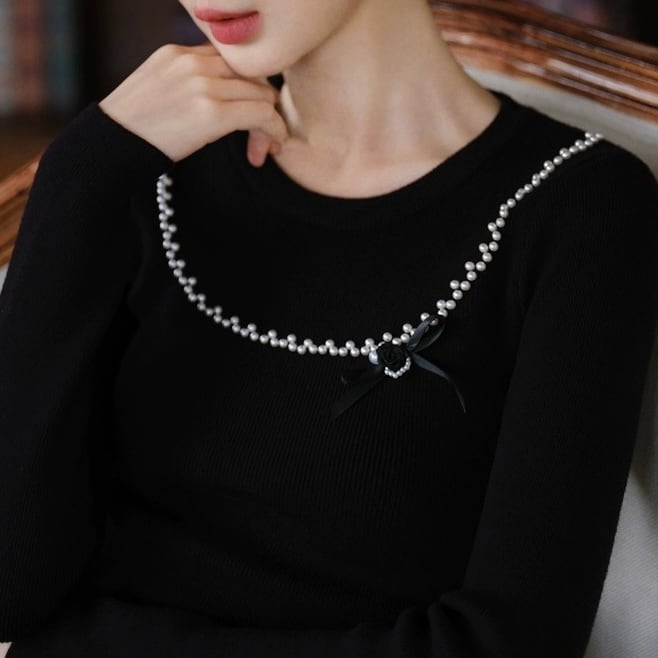 ネックラインに施したビーズとリボンがさりげないアクセント。