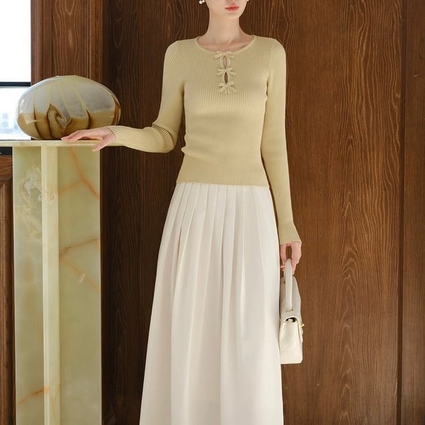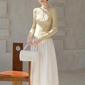 胸元に配したリボンが、控えめな華やぎを添えるデザイン。