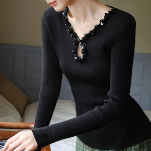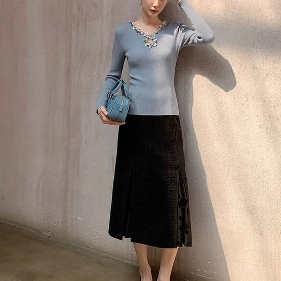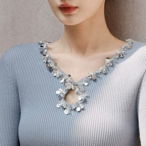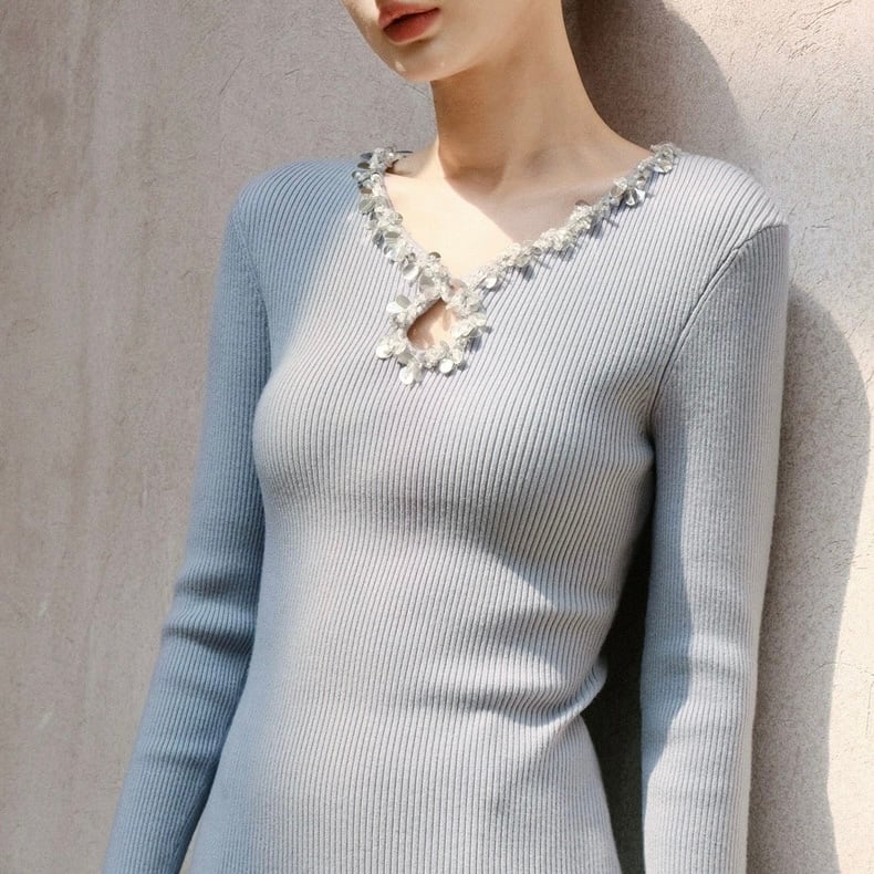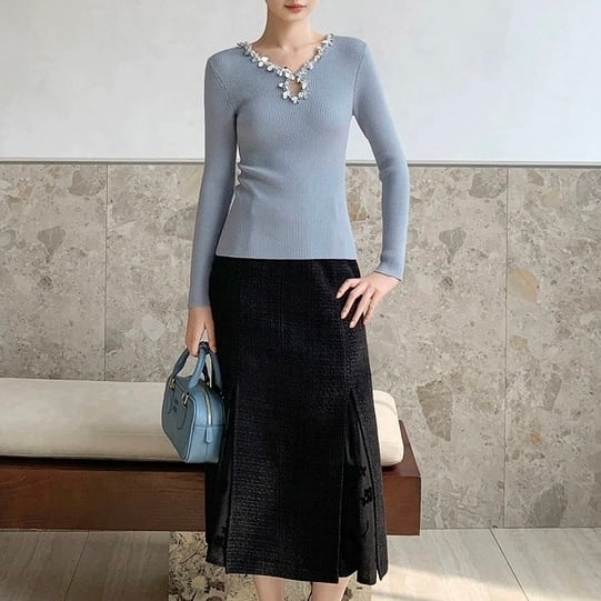 ネックラインを縁取るビジューの装飾が、装いに奥行きをプラス。