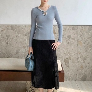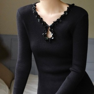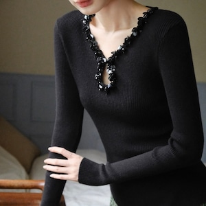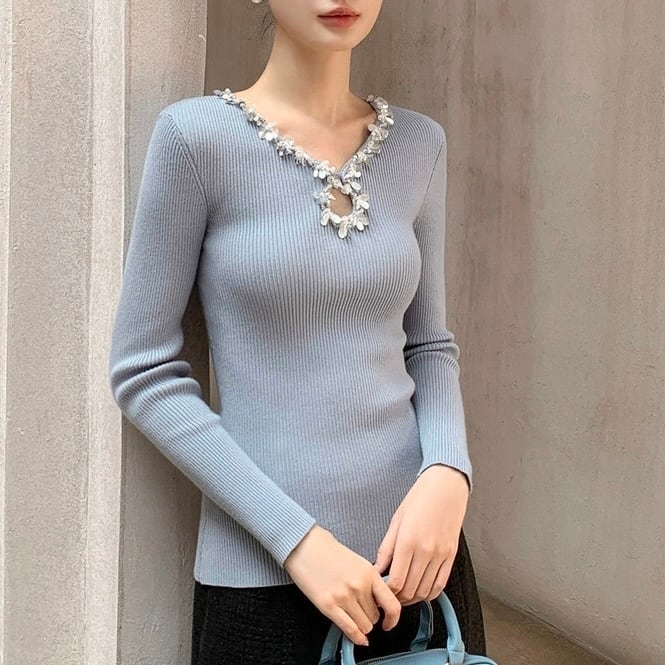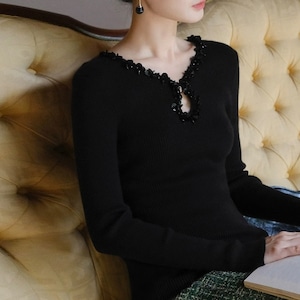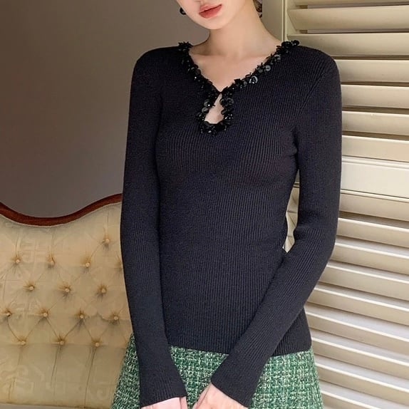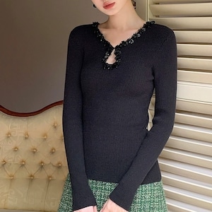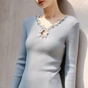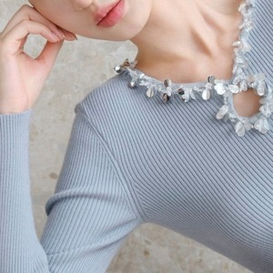 ビジューネックリブトップス W00429