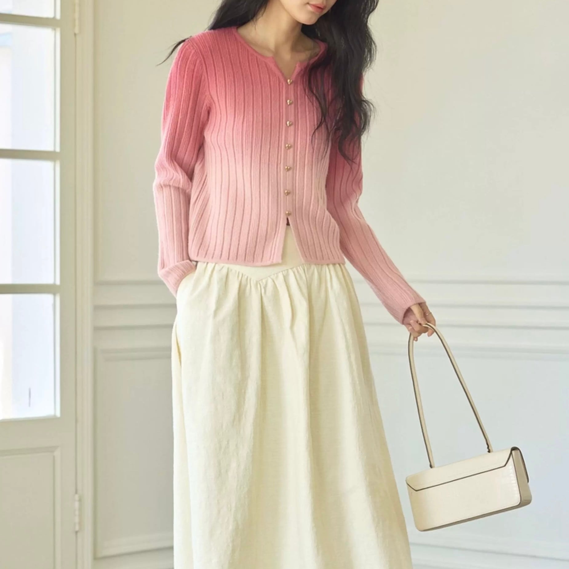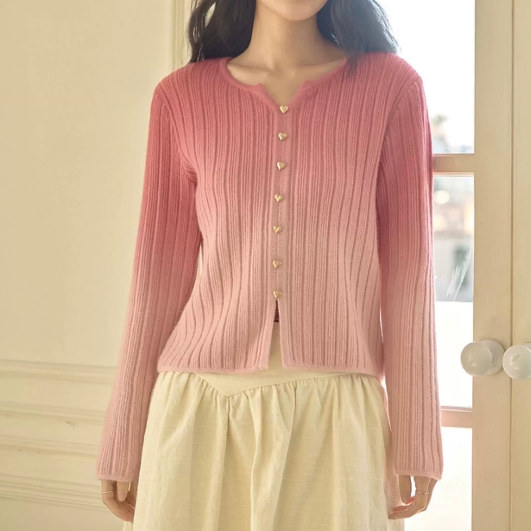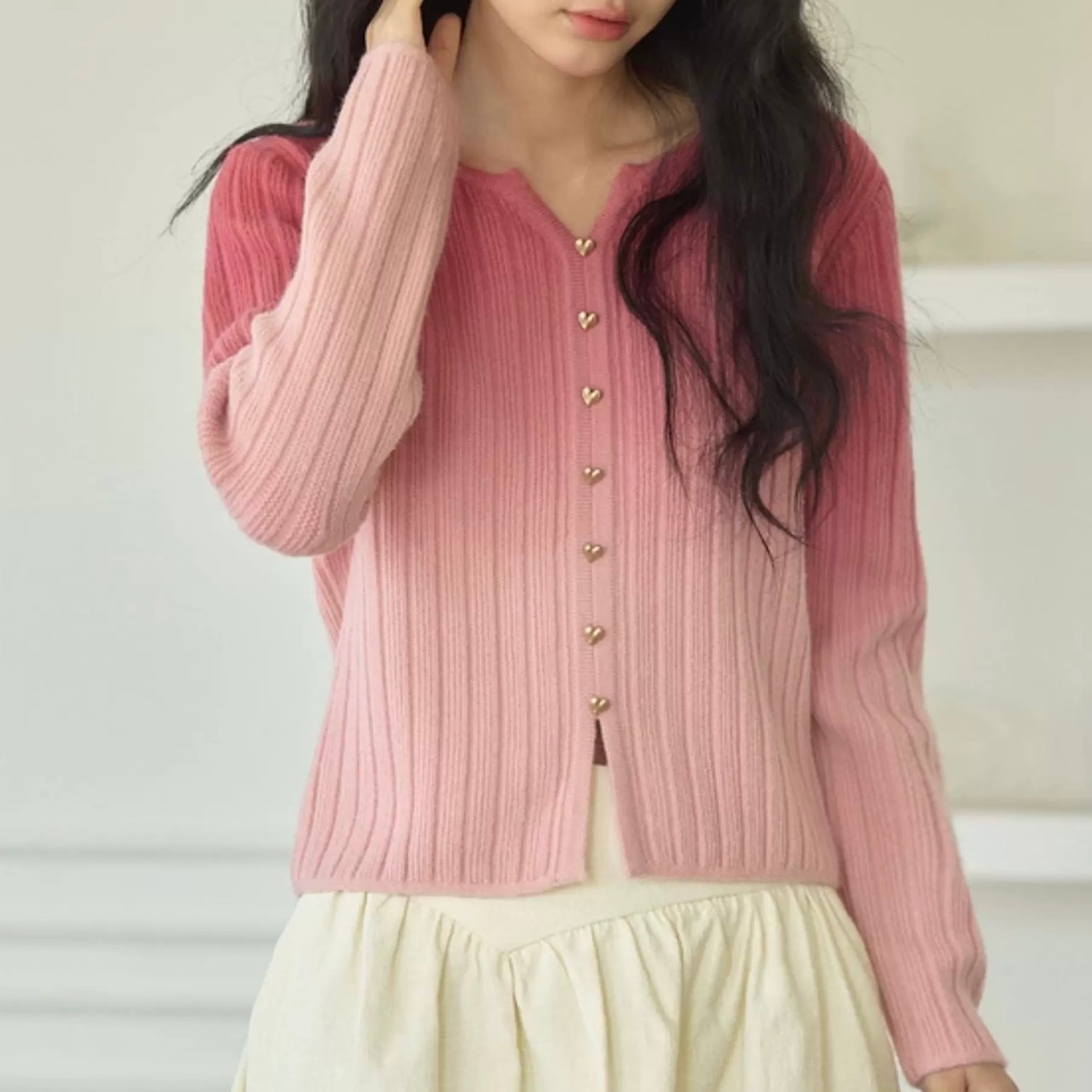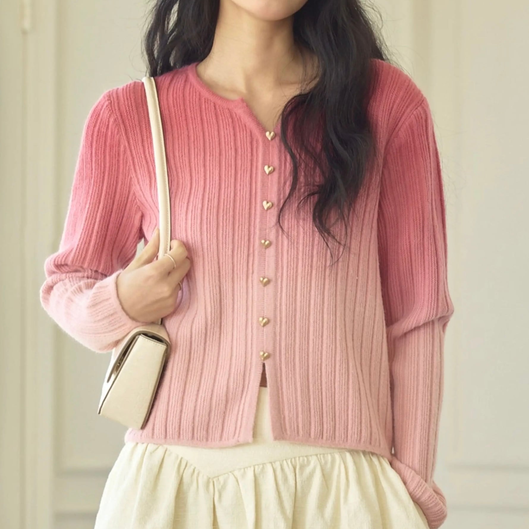 グラデーションカラーとさりげないハートボタンのディテールが視線を惹きつけるカーディガン。