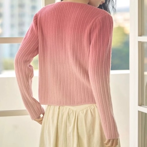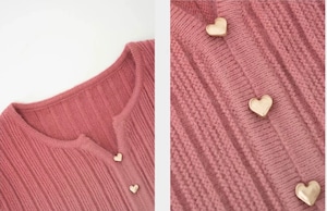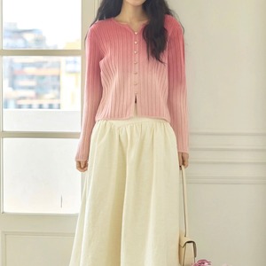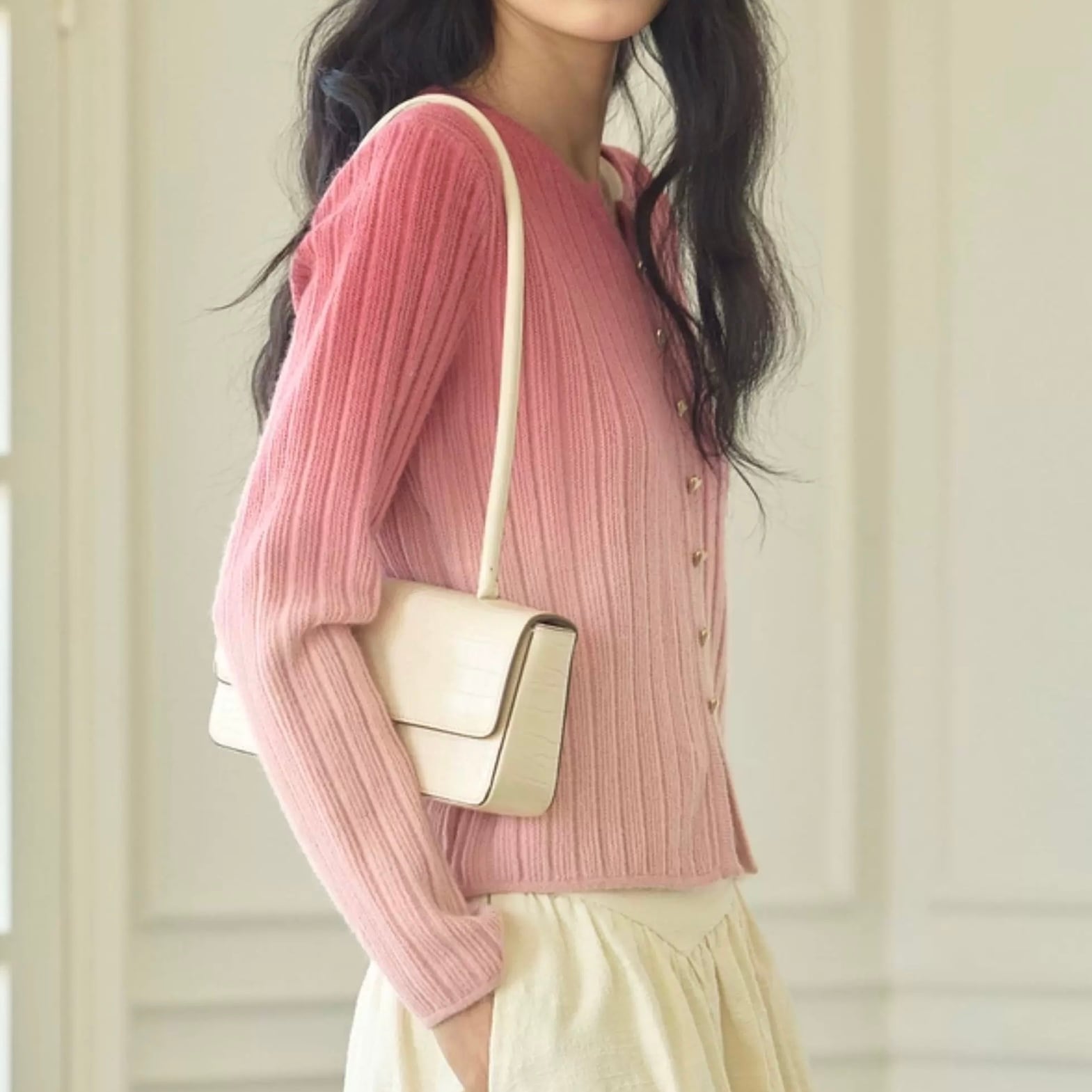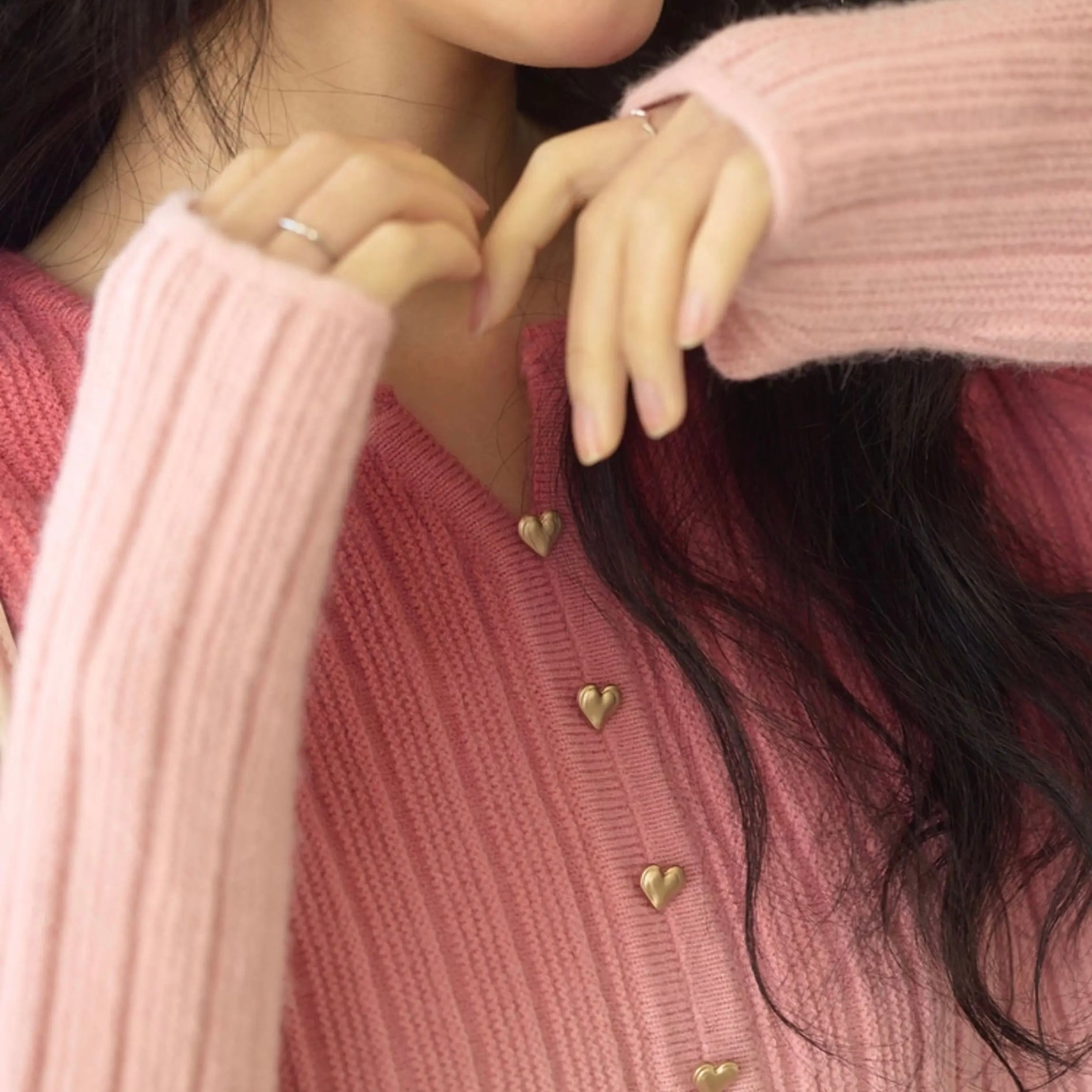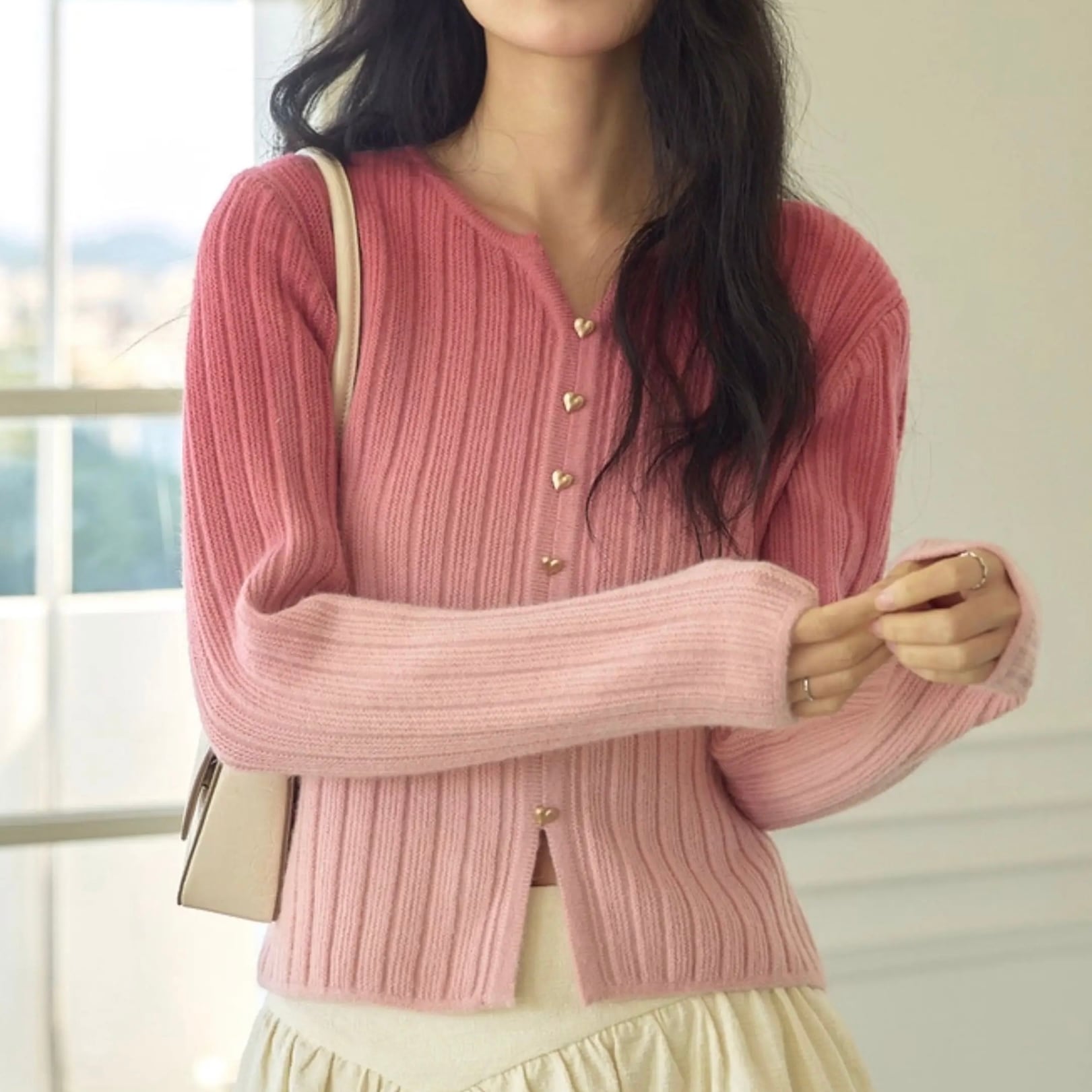 グラデーションカラーとさりげないハートボタンのディテールが視線を惹きつけるカーディガン。