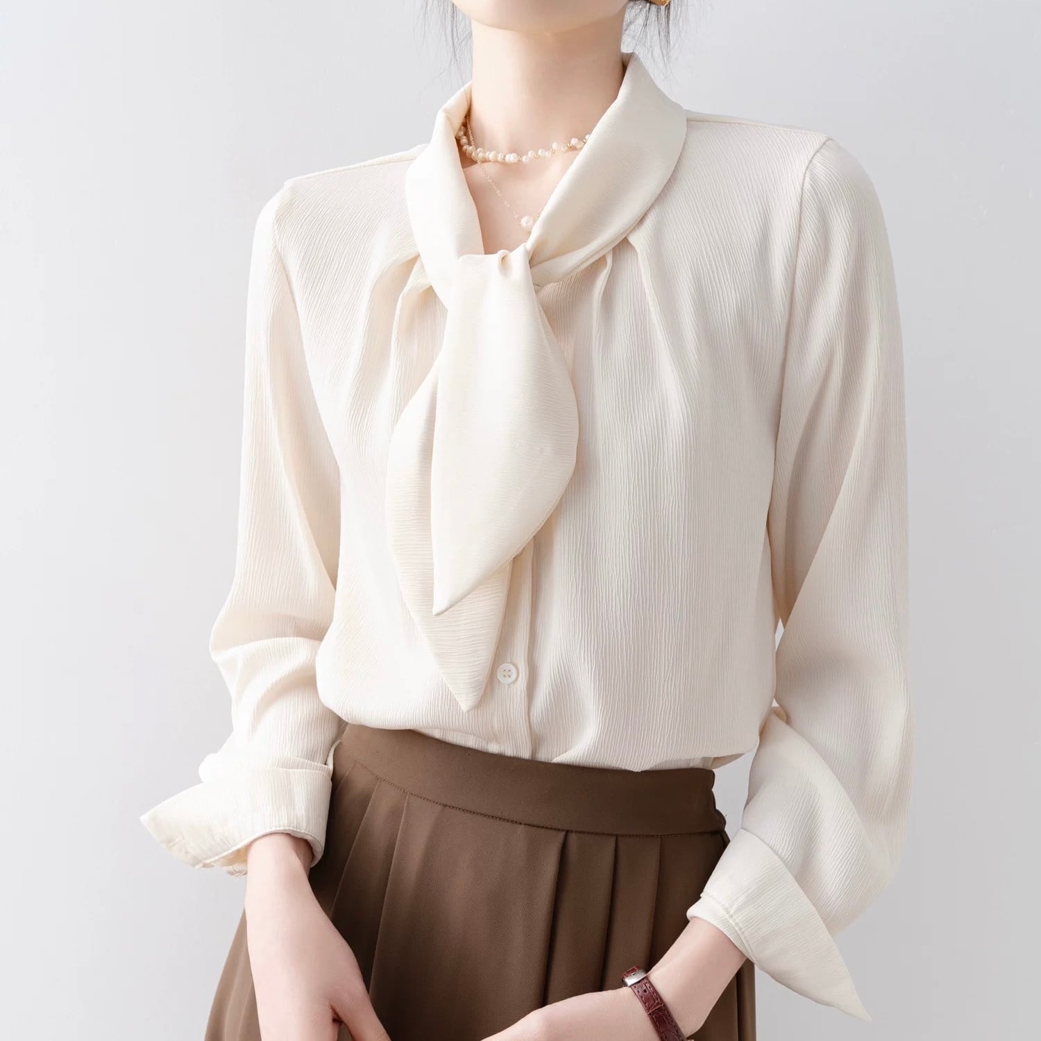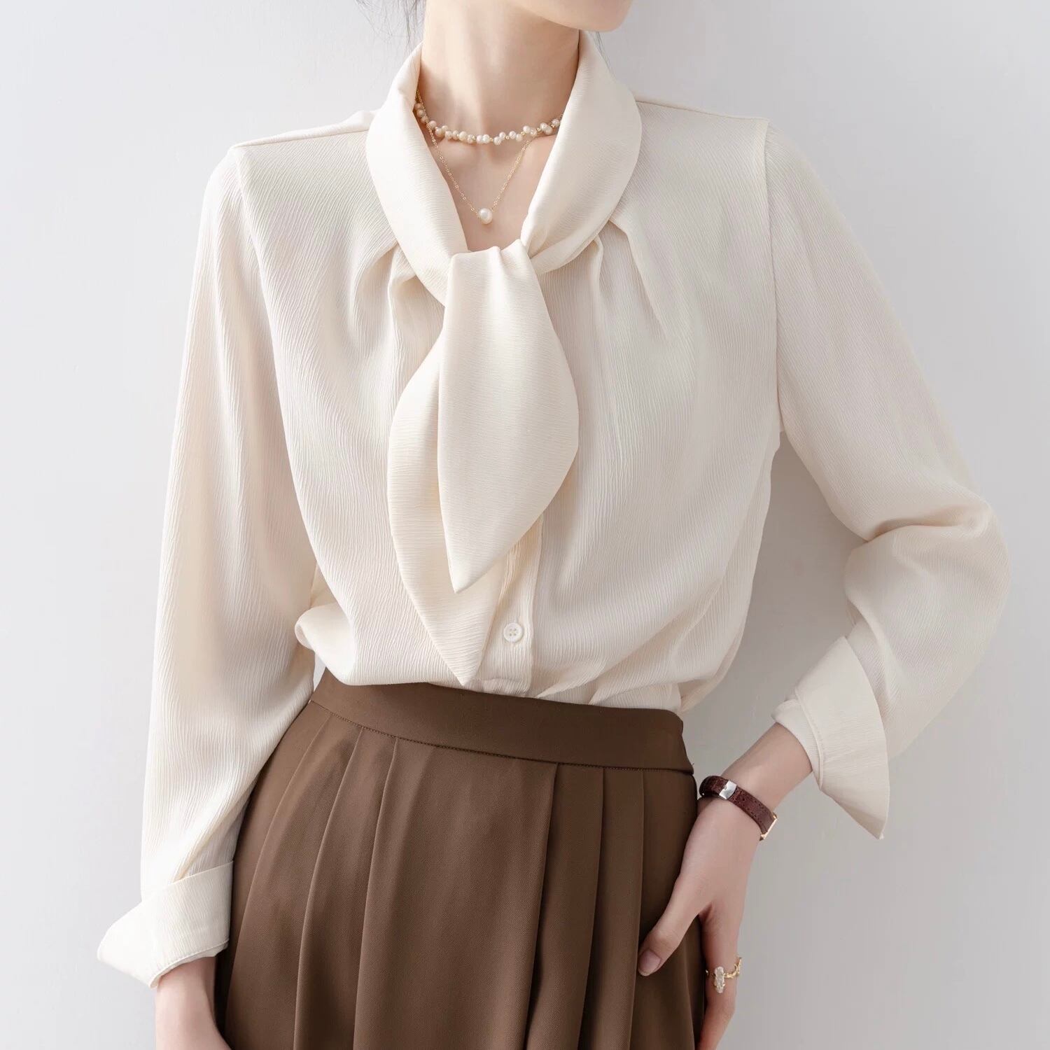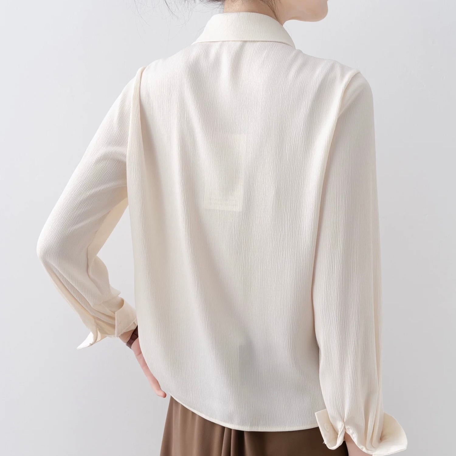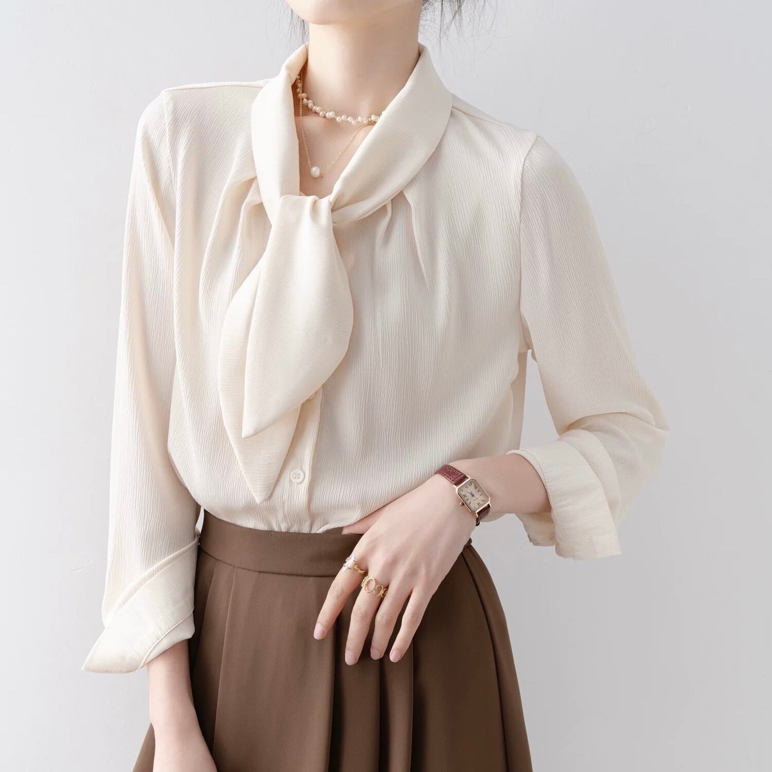首元のデザインが、顔まわりを美しく演出するブラウス。