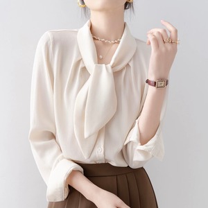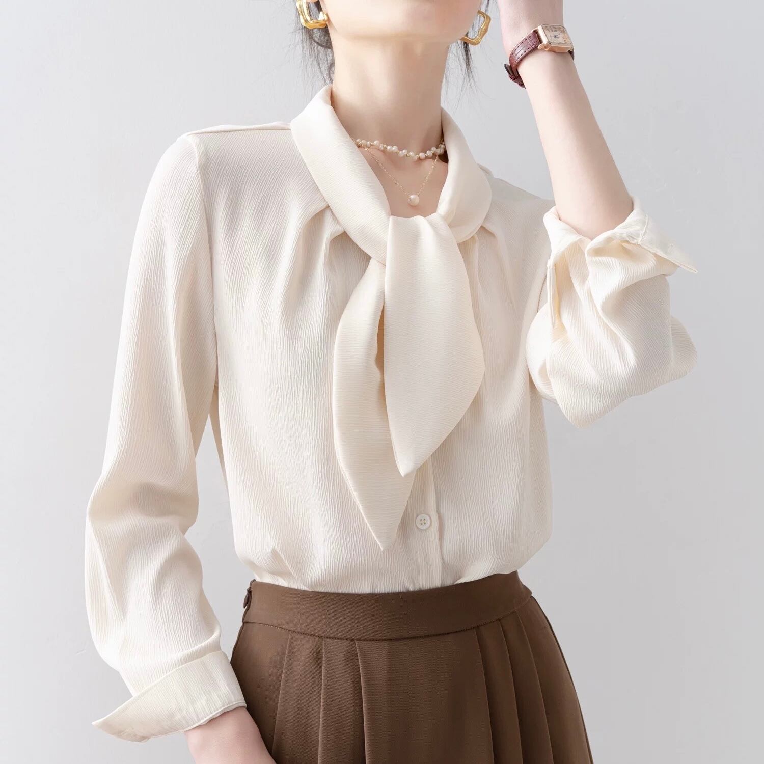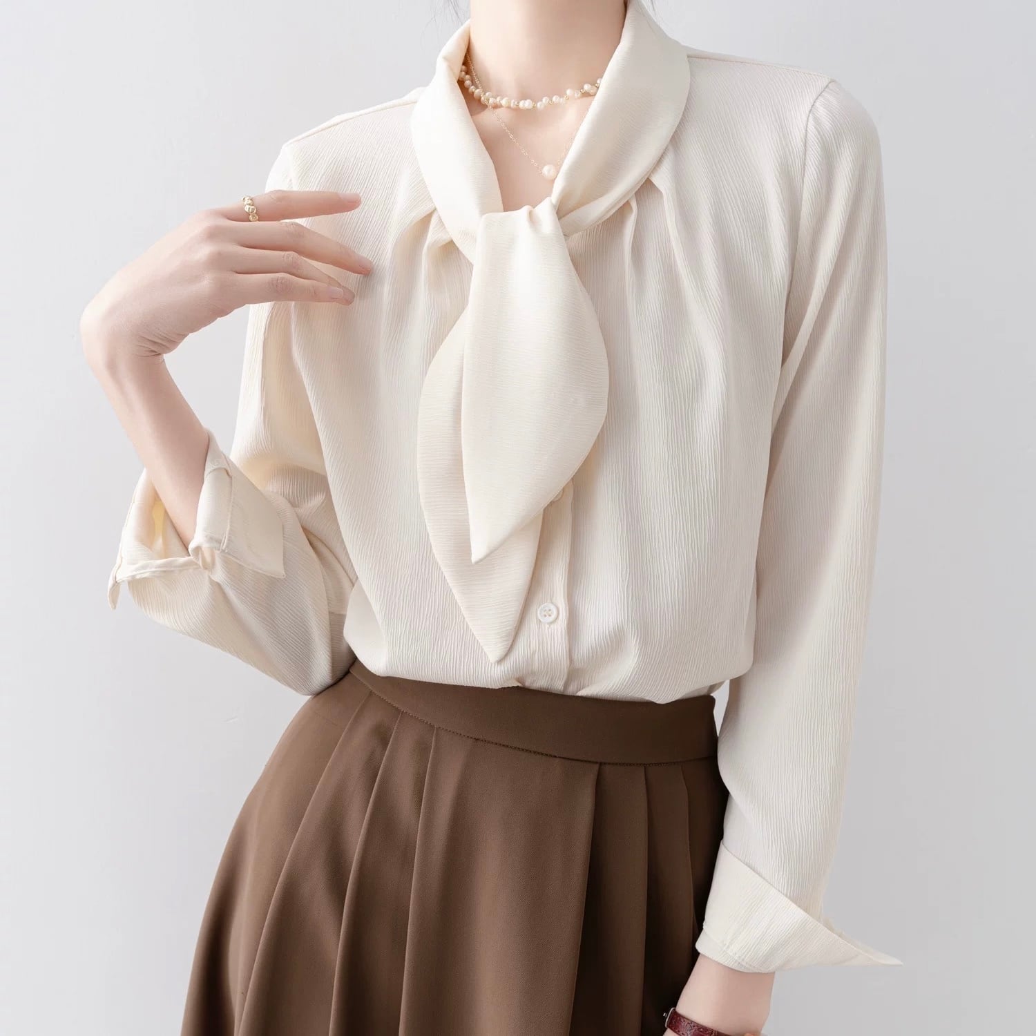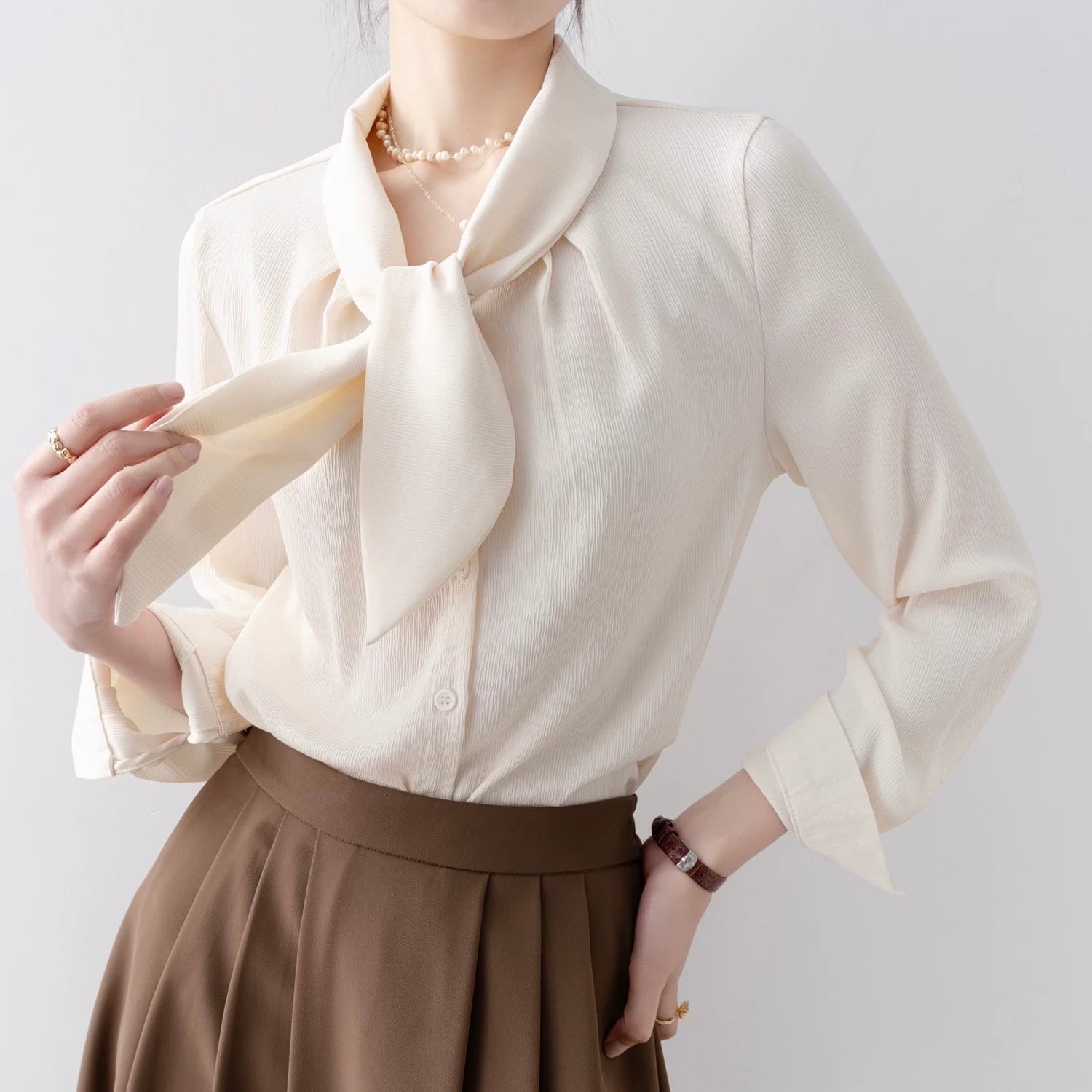 首元のデザインが、顔まわりを美しく演出するブラウス。