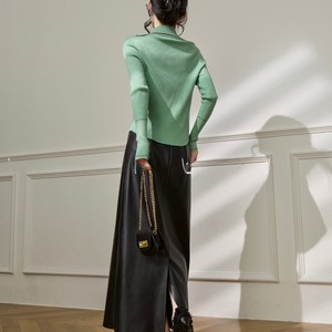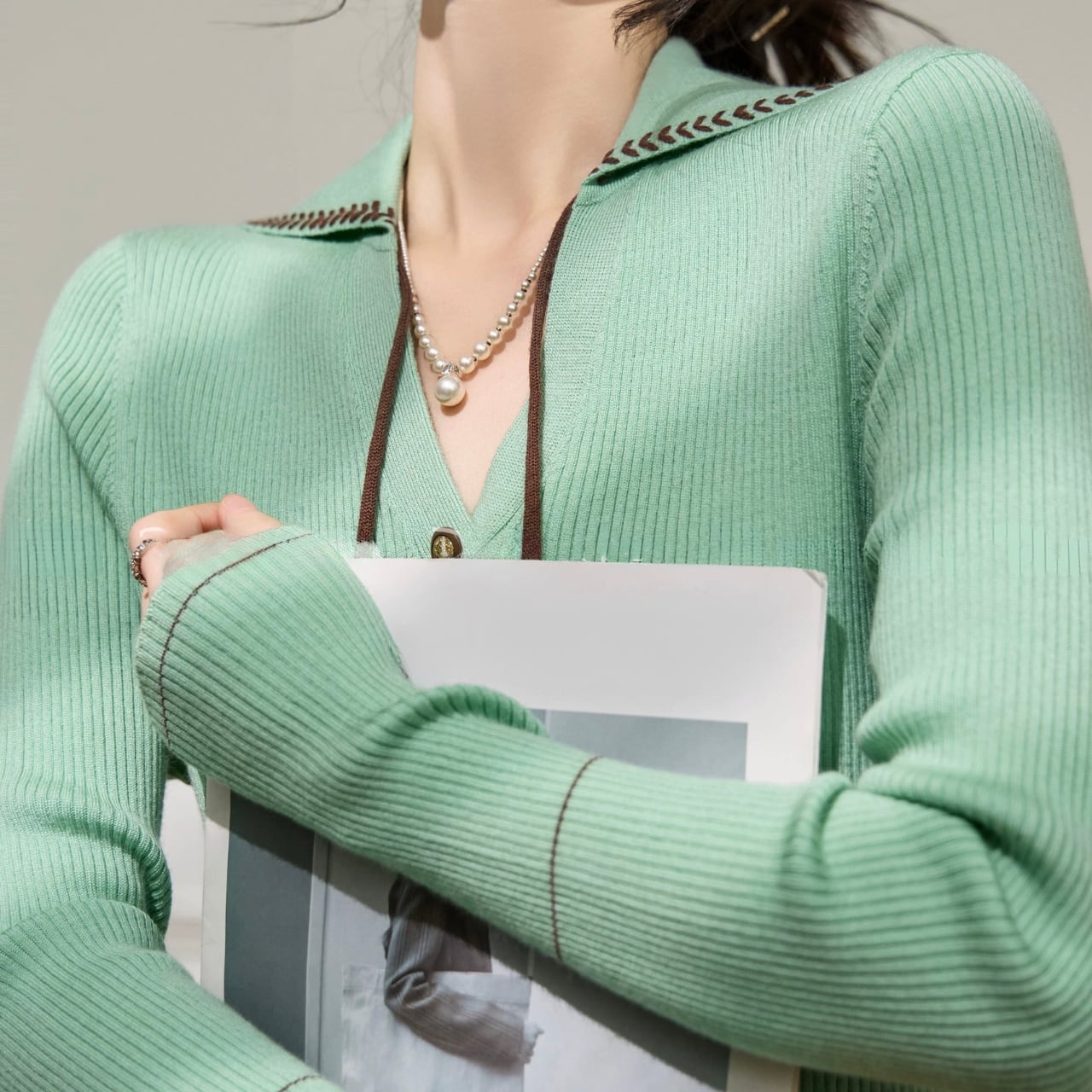 襟元とVネックのバランスが、顔まわりをすっきりと演出。