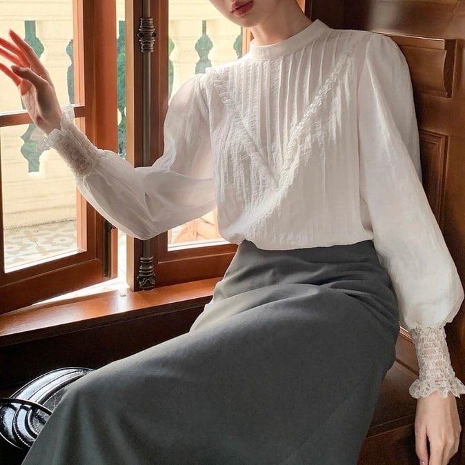 袖口のレースディテールが手元まで美しく演出。