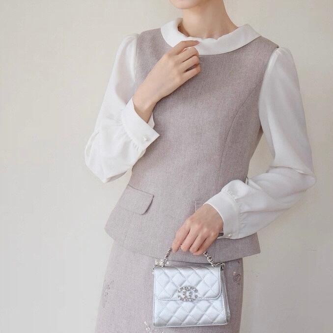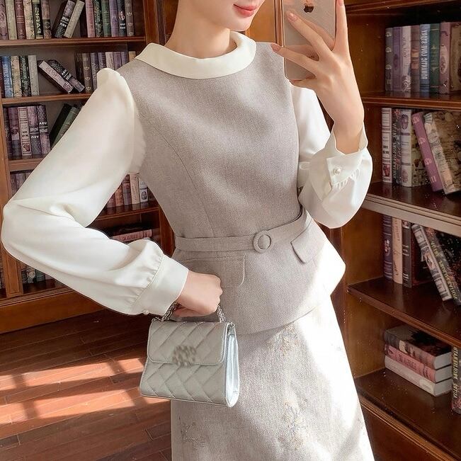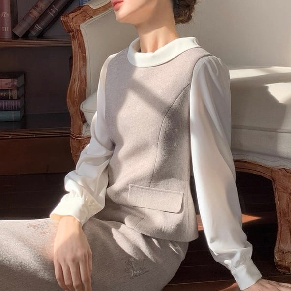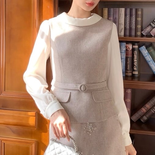 ブラウスとのレイヤードで、きちんと感のある装いが完成します。