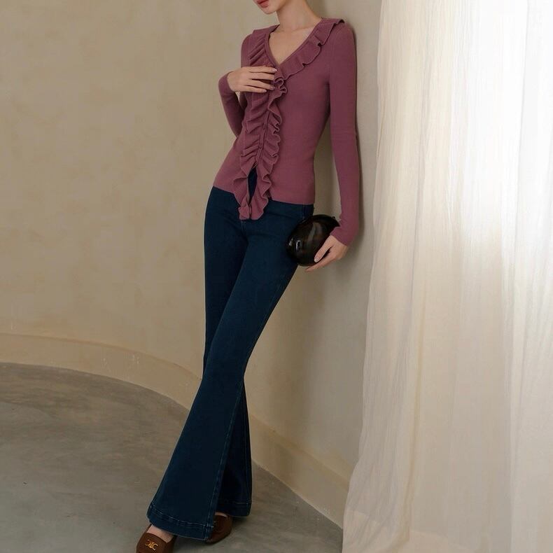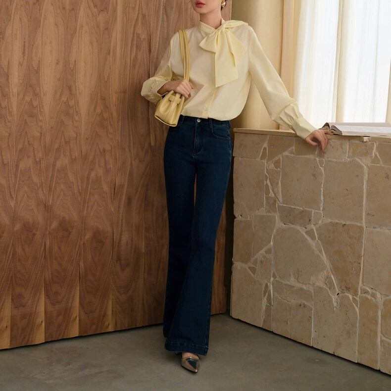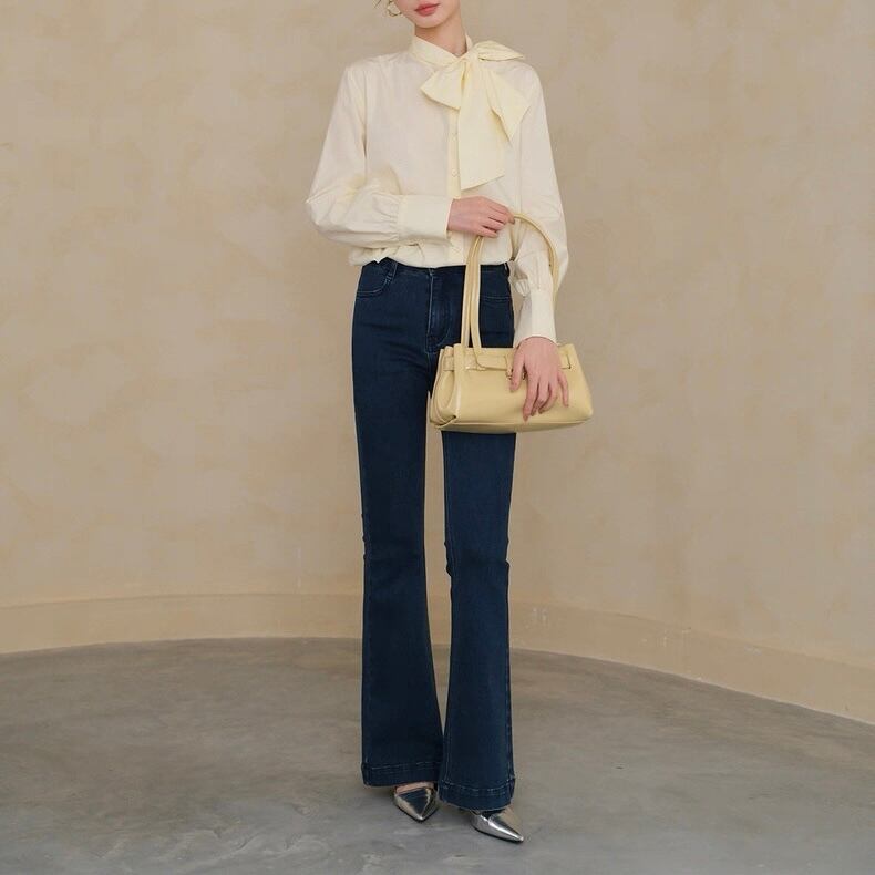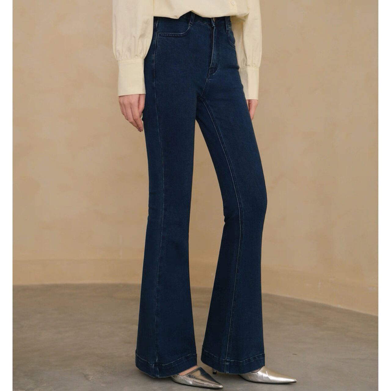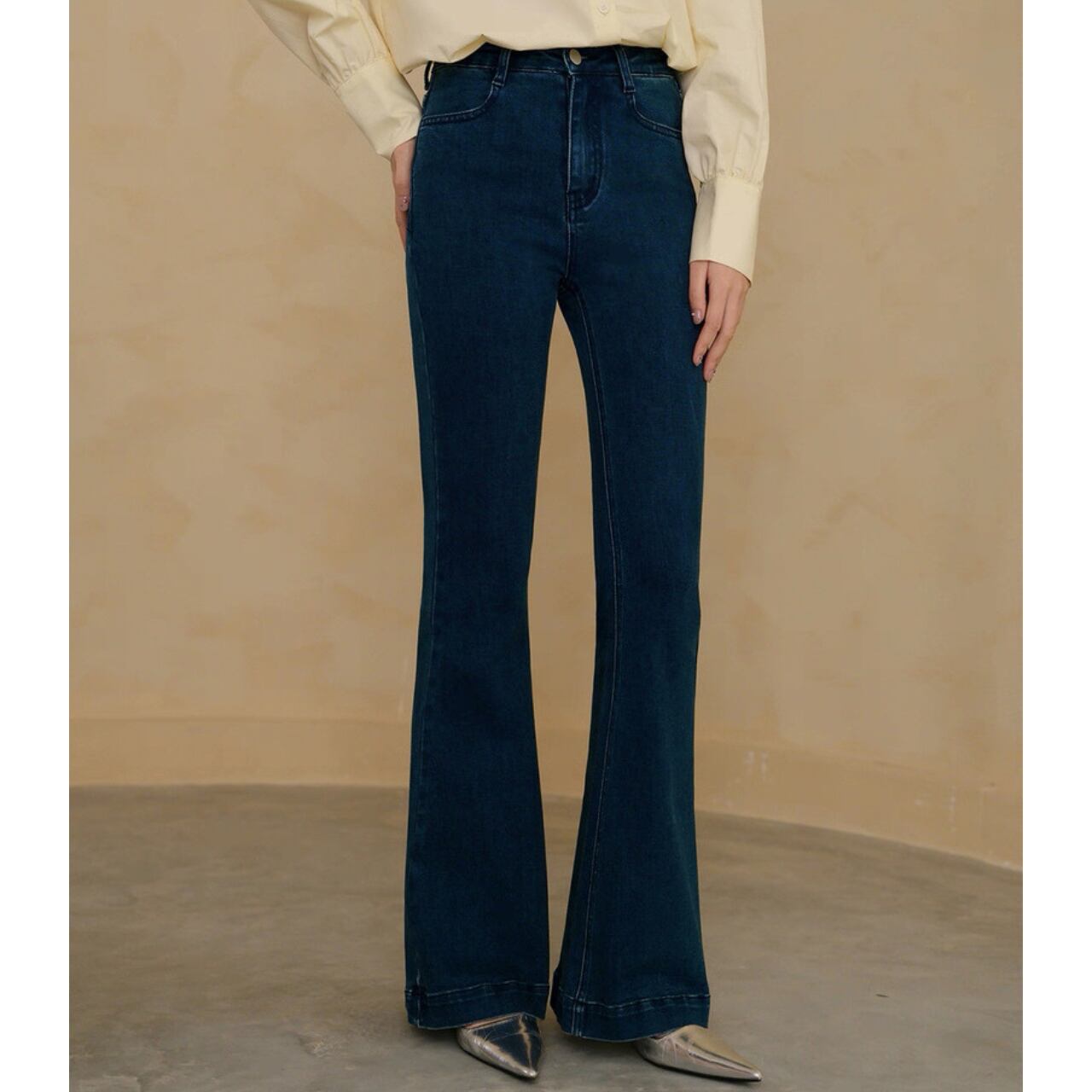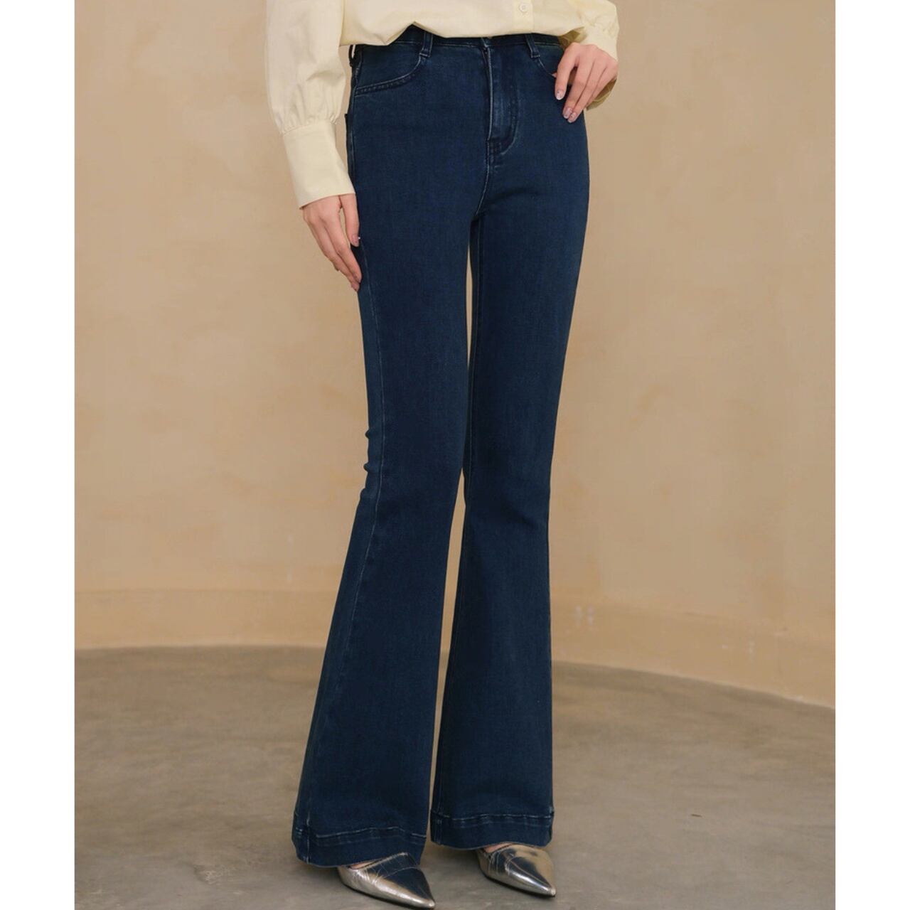 膝下から広がるシルエットで脚長効果を演出。