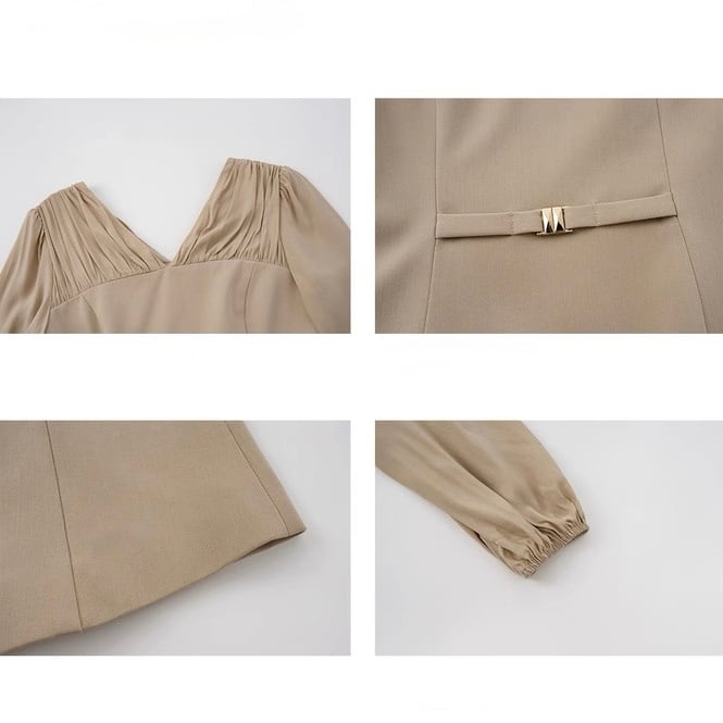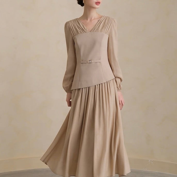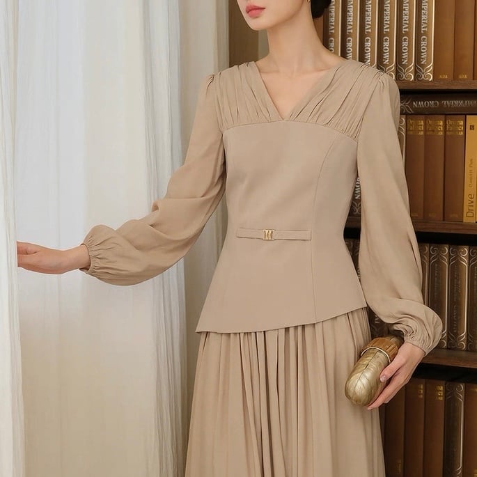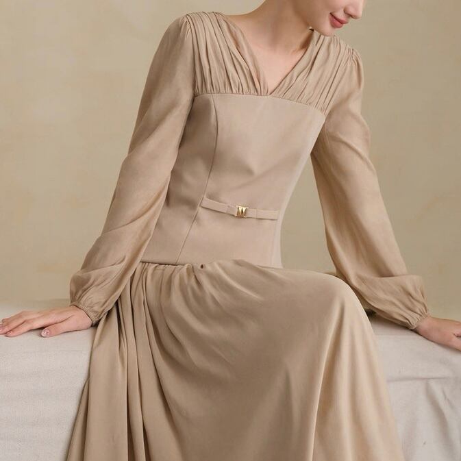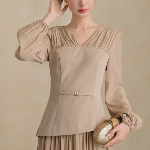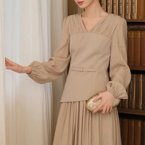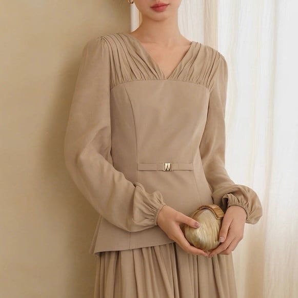 胸元のタックとウエストマークで自然なメリハリを。