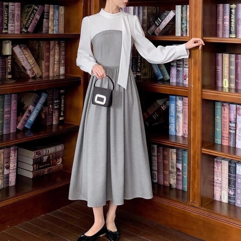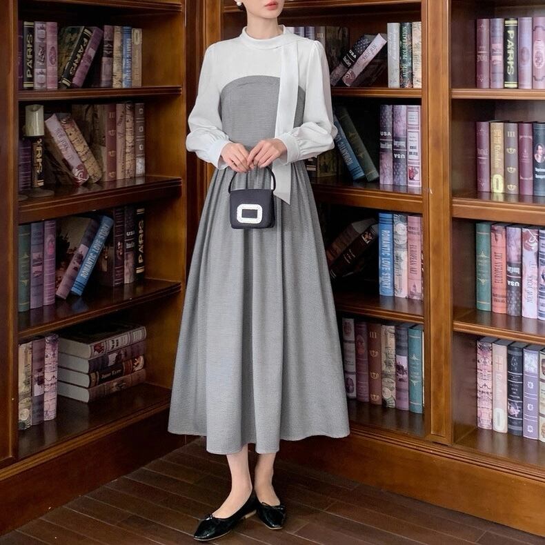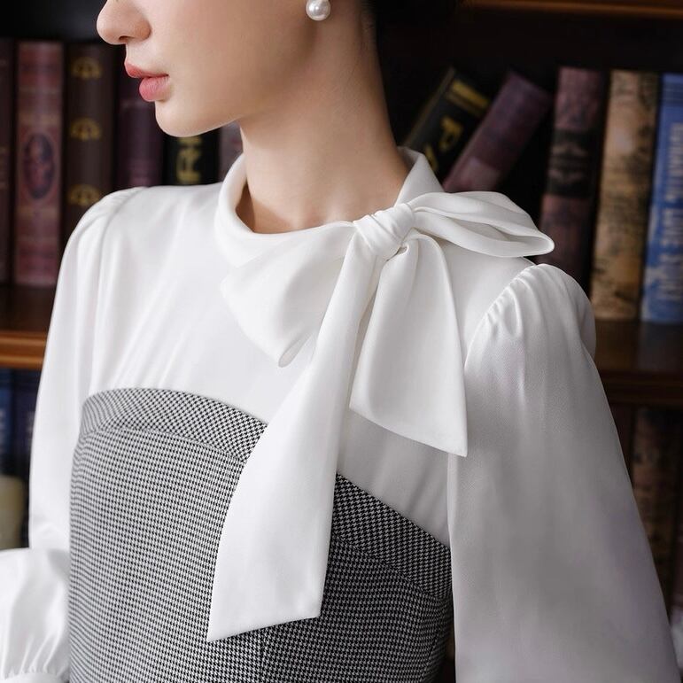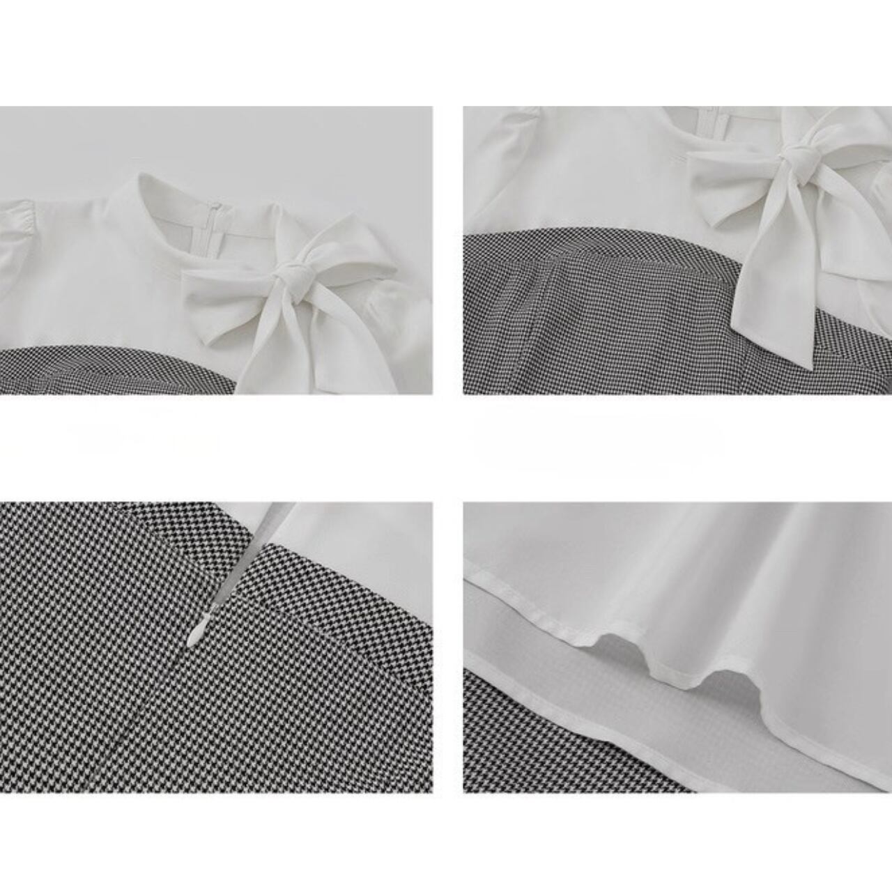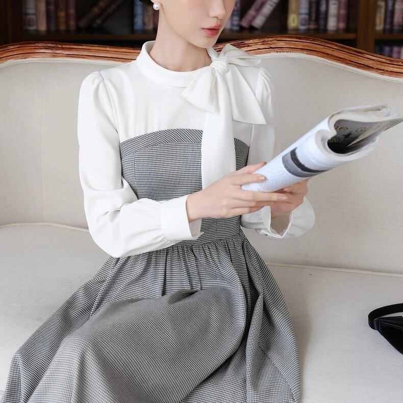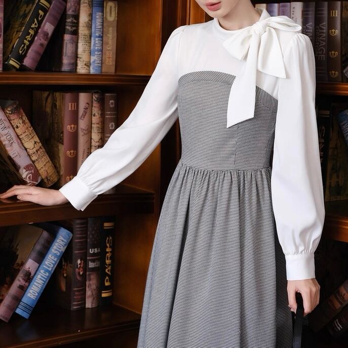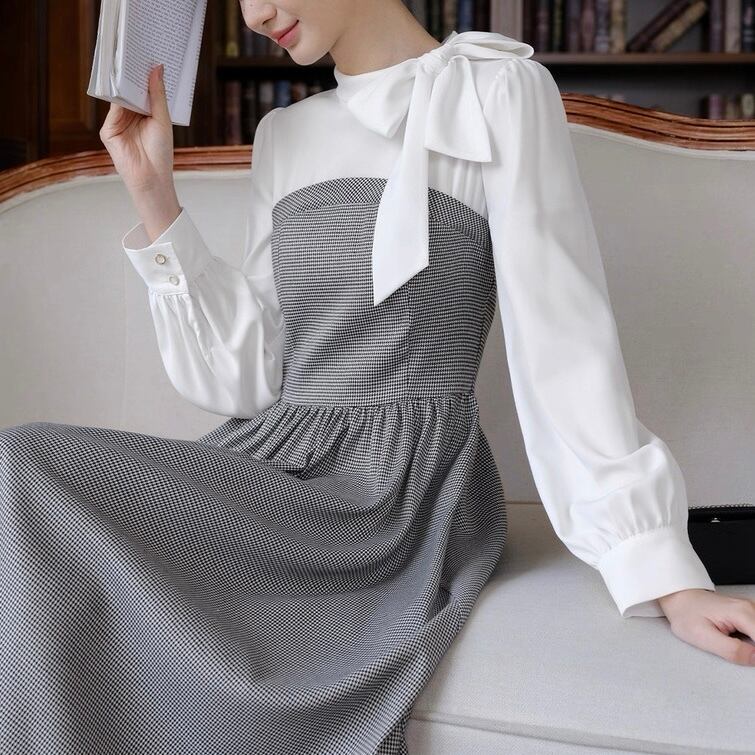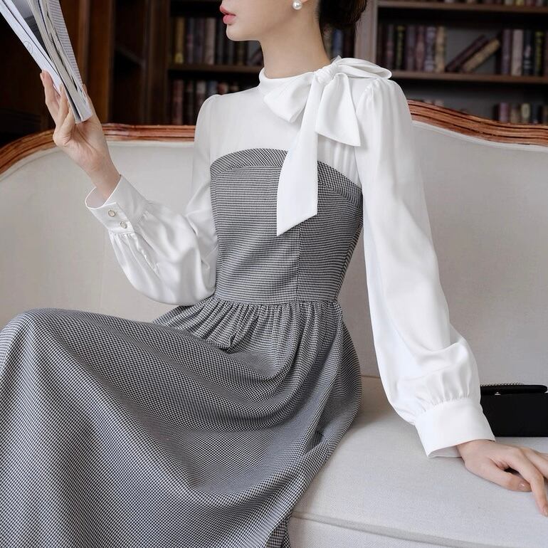 ブラウスを重ねたようなデザインで、一枚で品よく決まるワンピース。