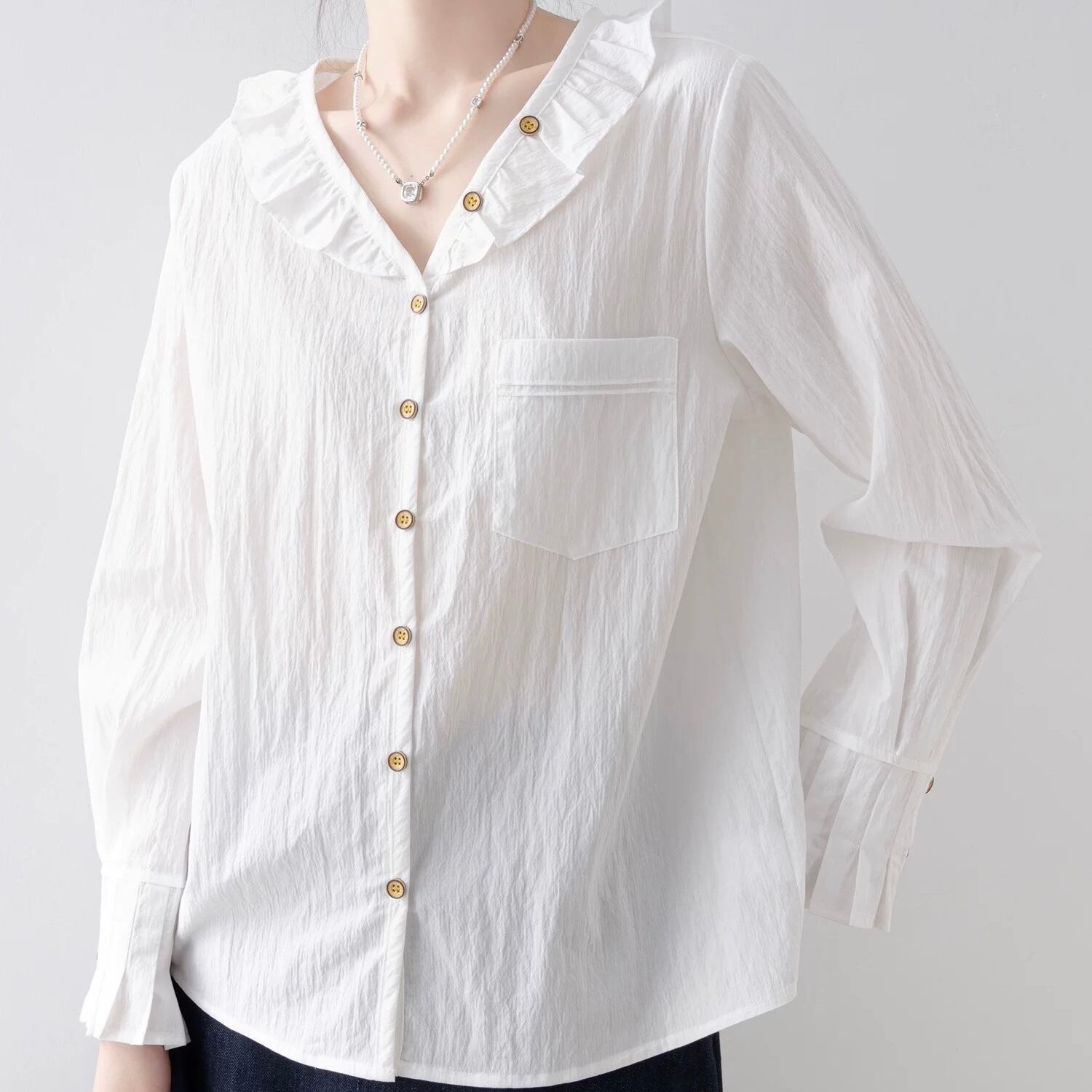 やわらかなフリル襟が顔まわりを優しく演出。