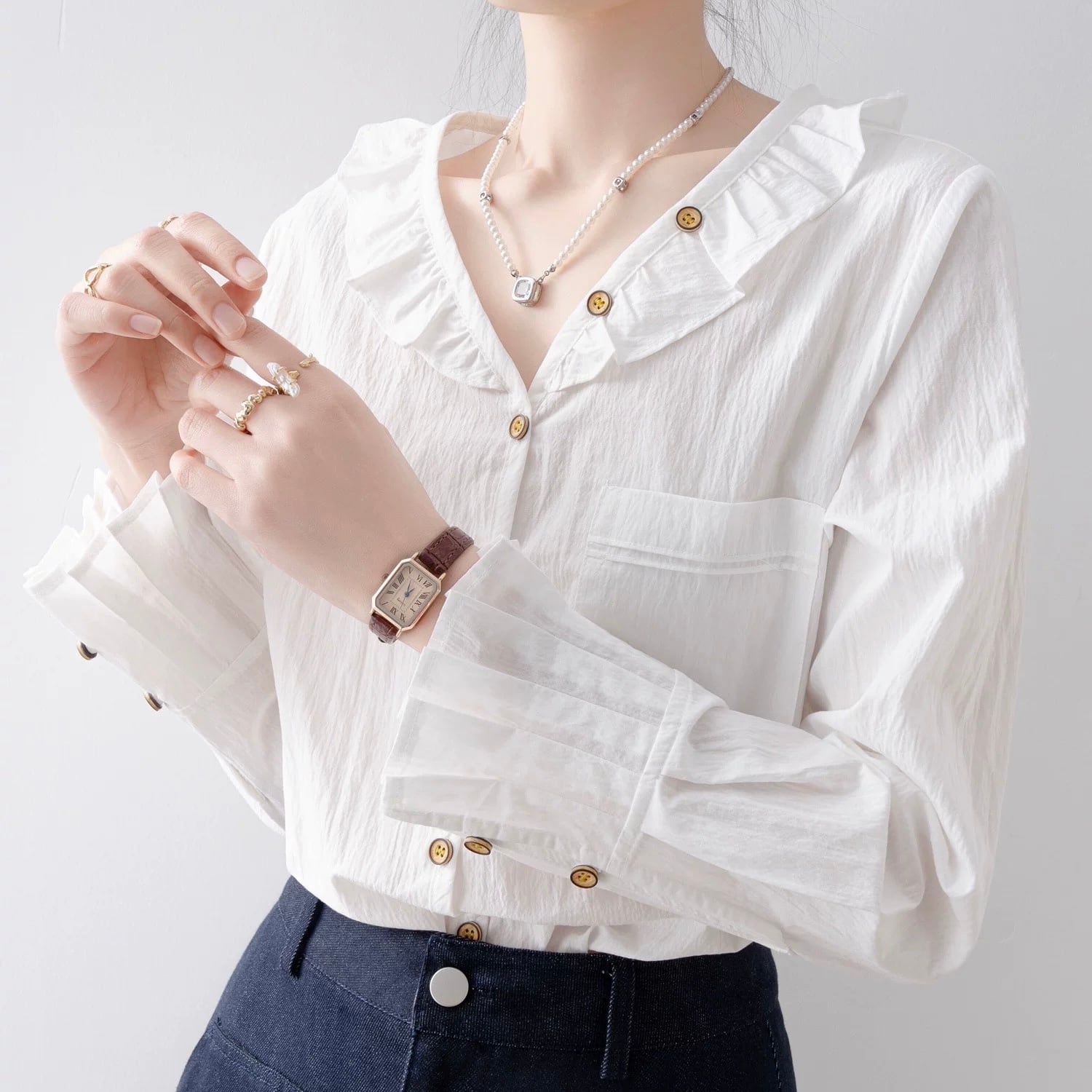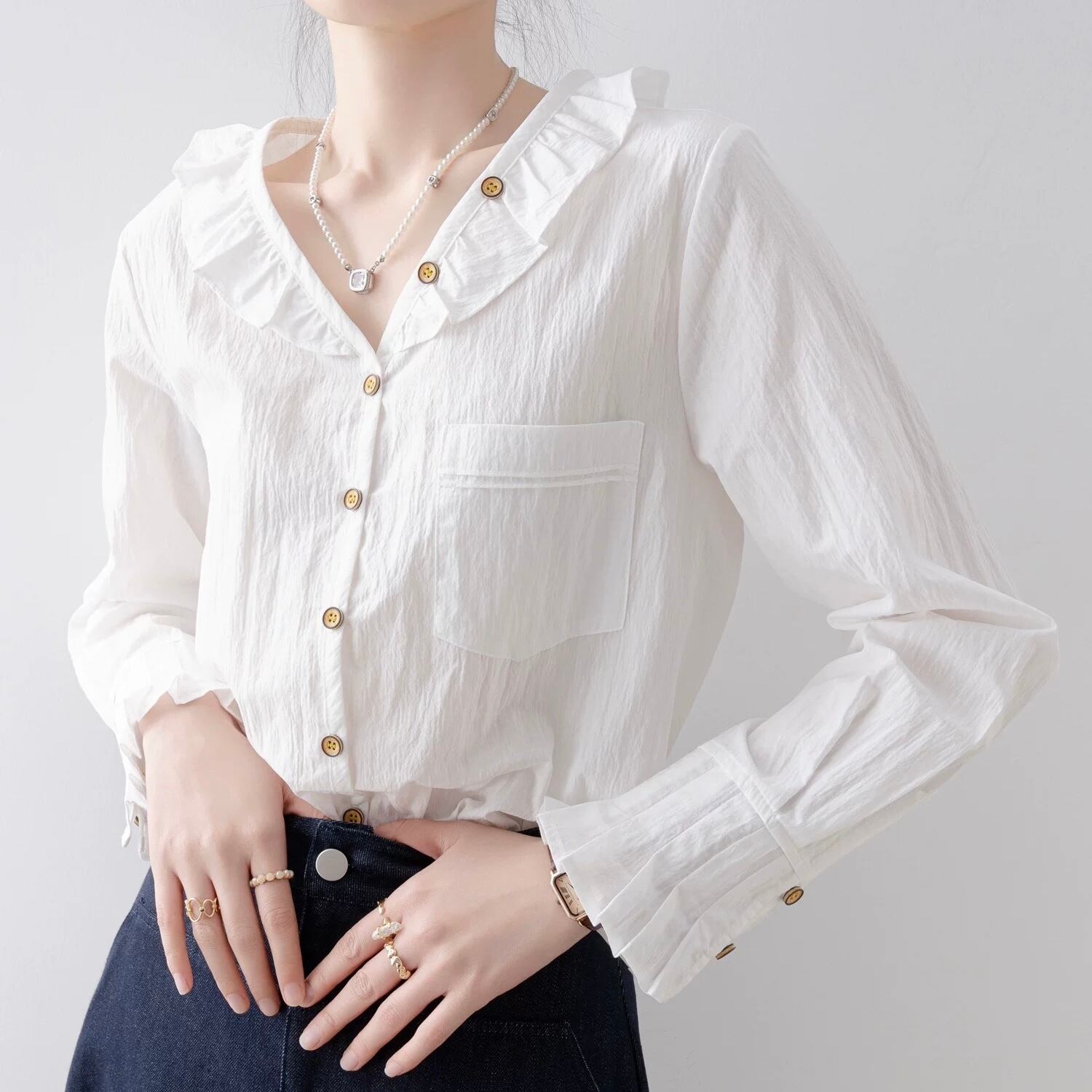 一枚でも羽織りとしても使える万能ブラウスです。