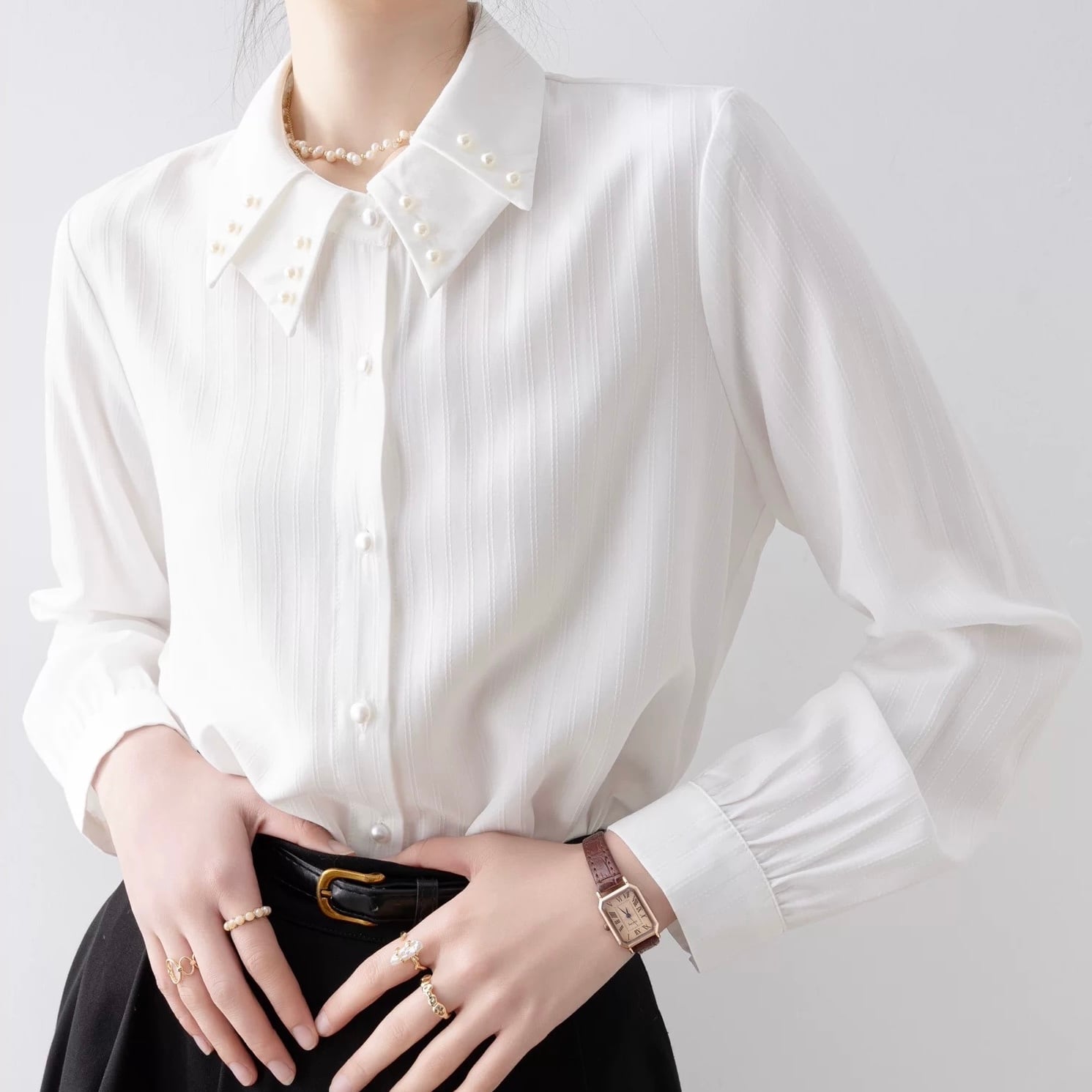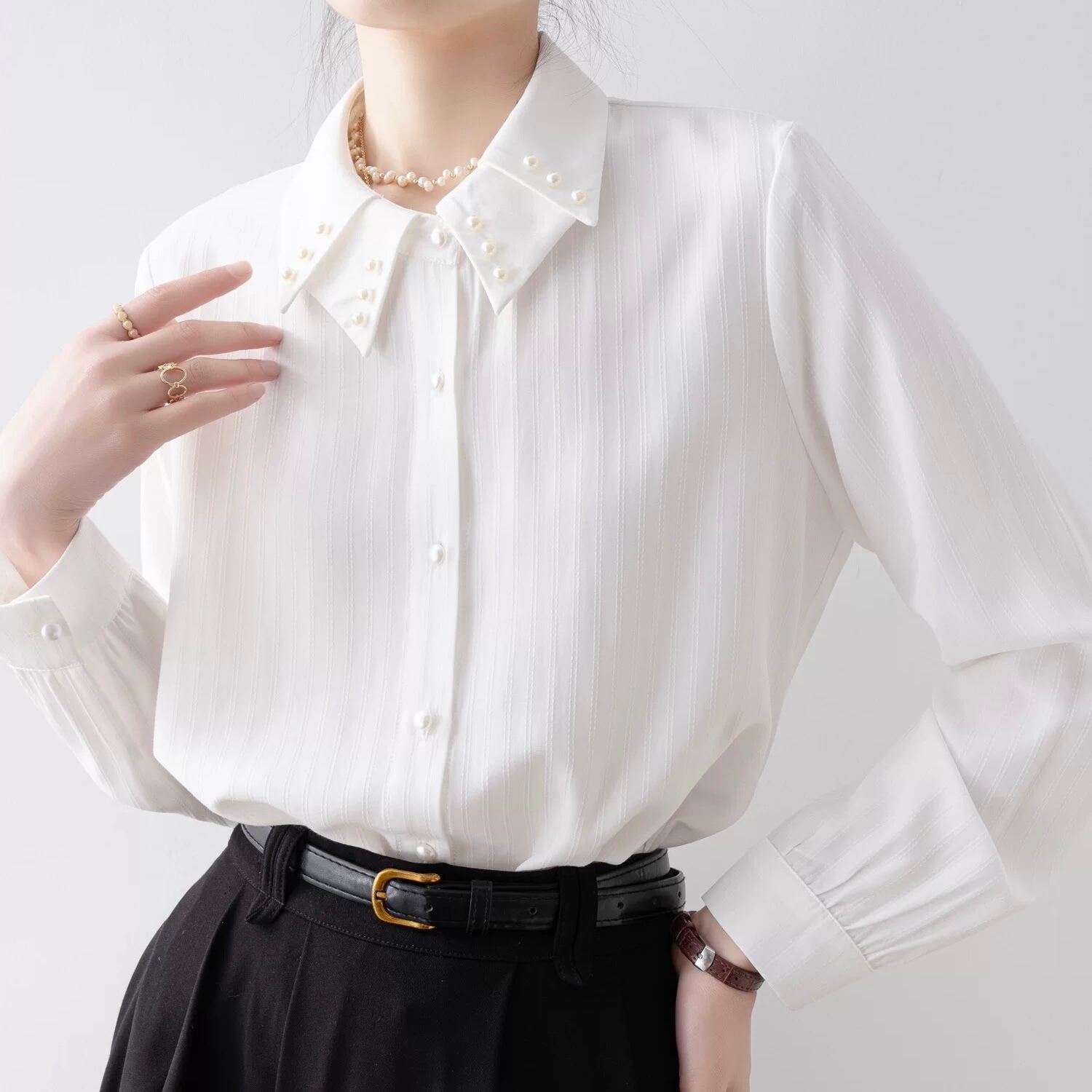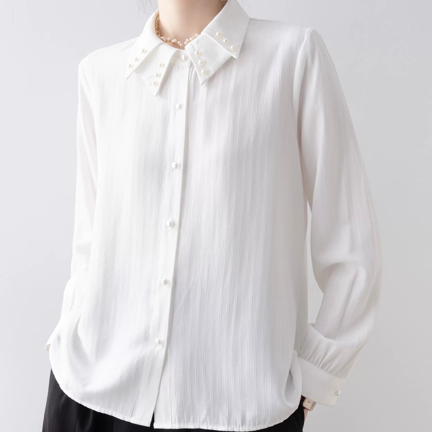 襟元のさりげないパールが上品なアクセント。