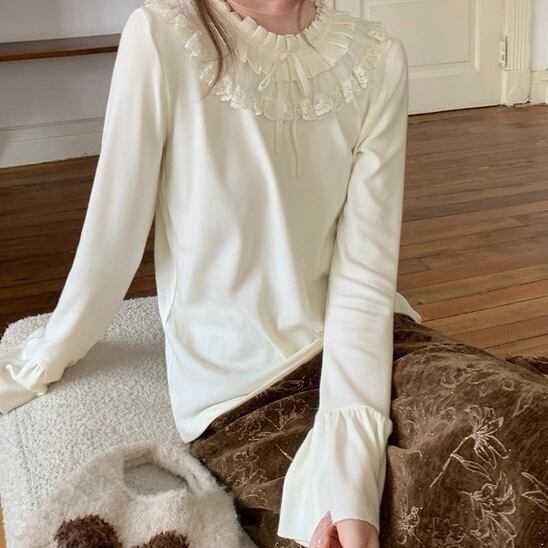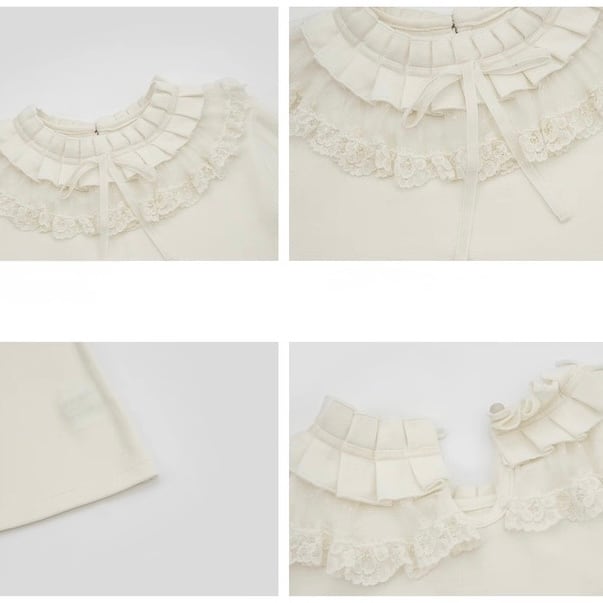首元のフリルとレースが上品な印象を与えるブラウス。