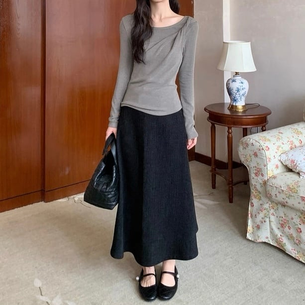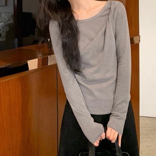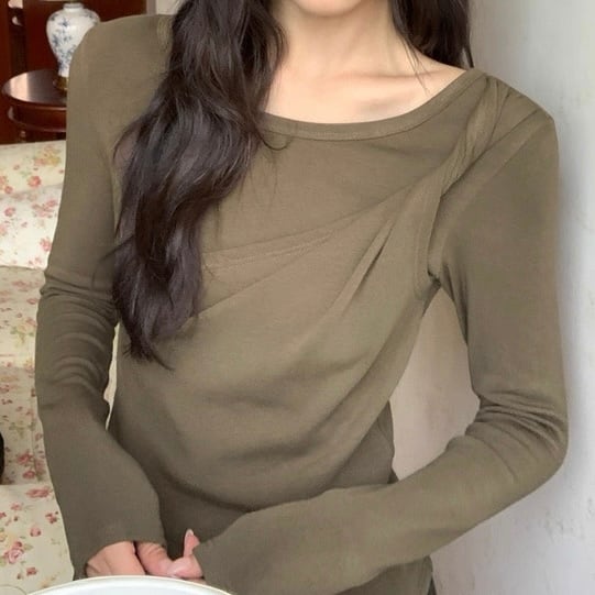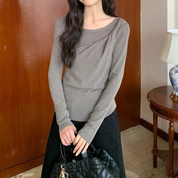 斜めに入ったドレープデザインが美しいシルエットを作るトップス。