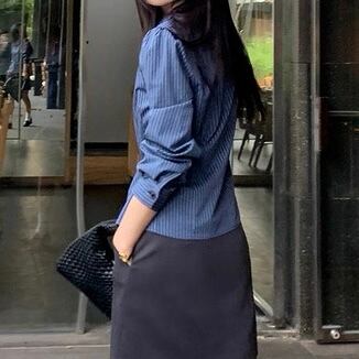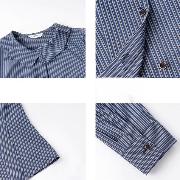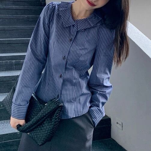 クラシカルな襟デザインが印象的なストライプブラウス。