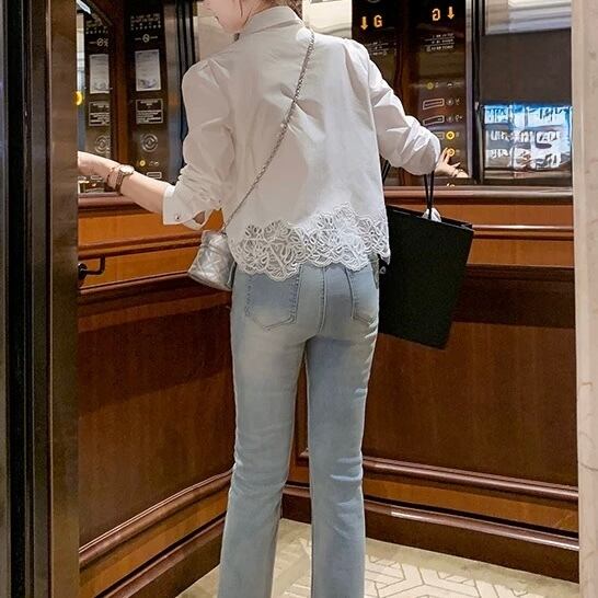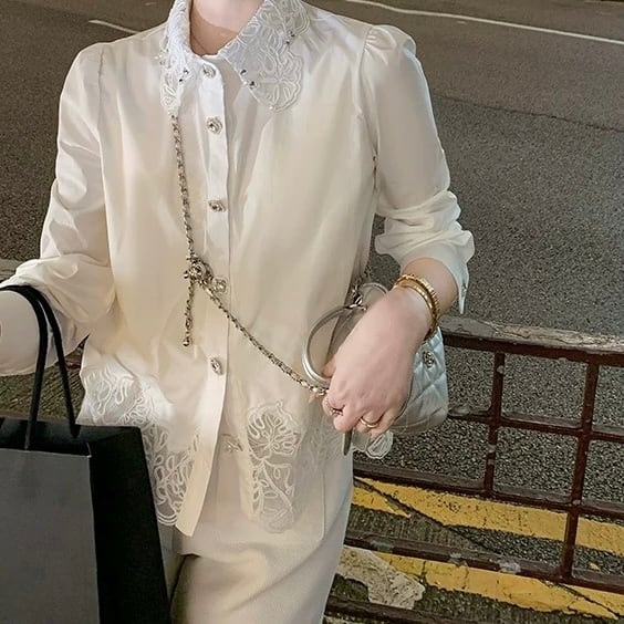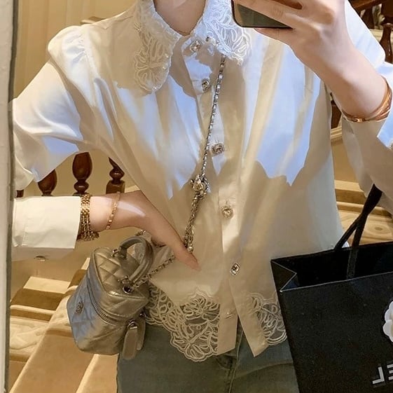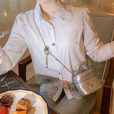 襟元と裾のレースが上品なヴィンテージ風ブラウス。