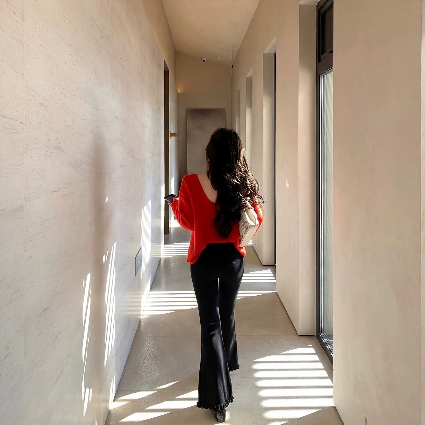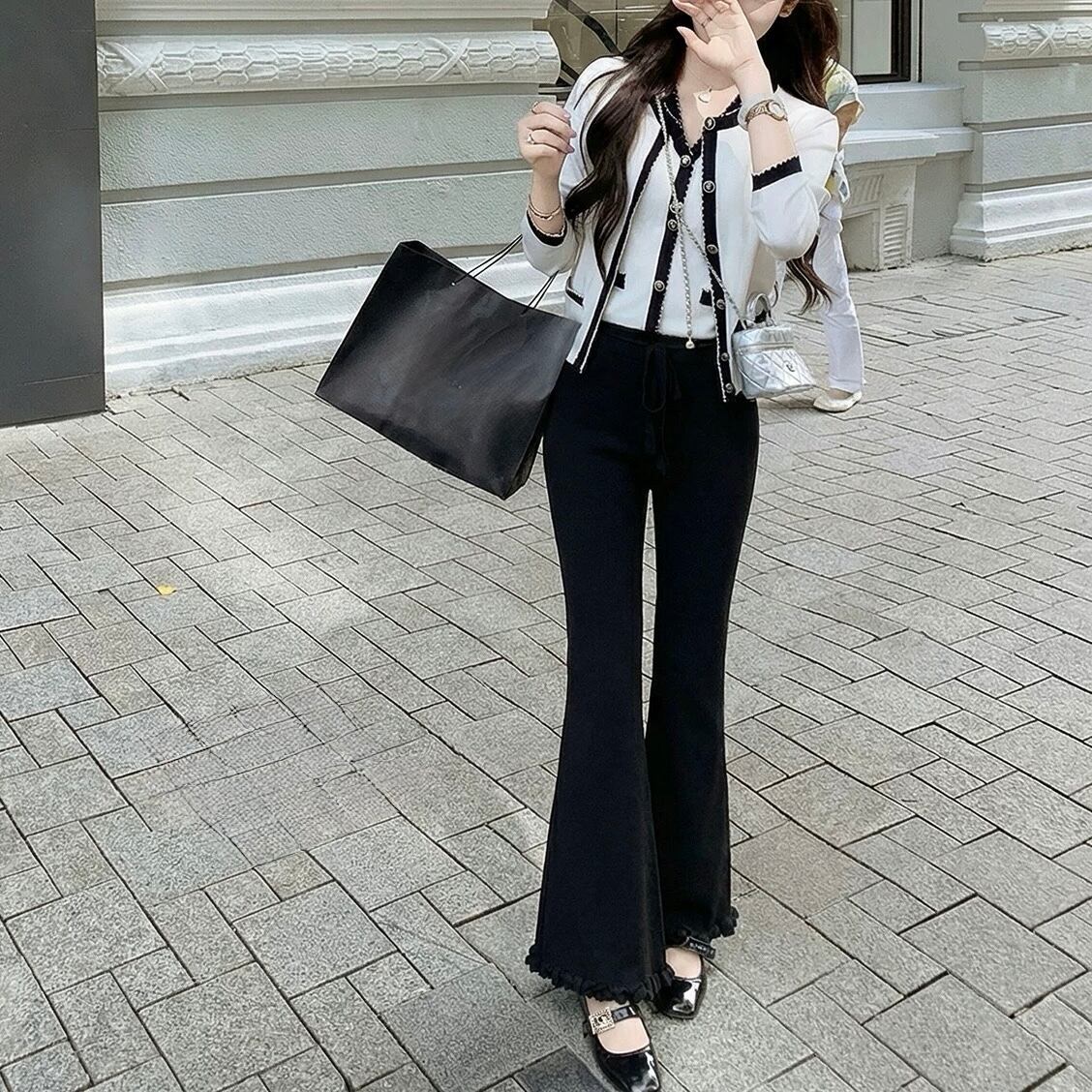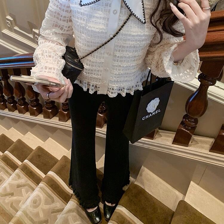 美しいシルエットを作るフレアデザインのパンツ。