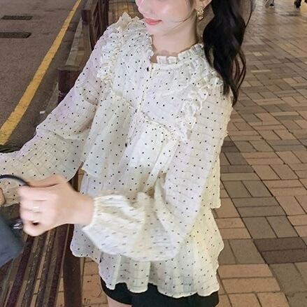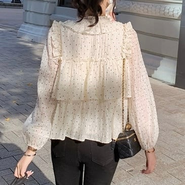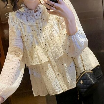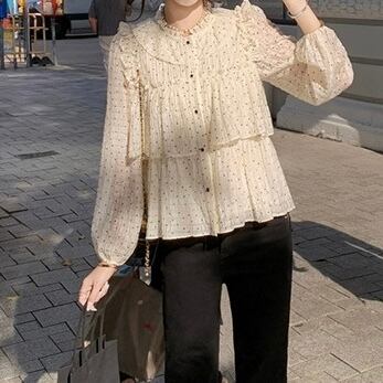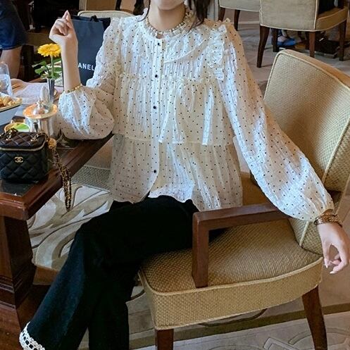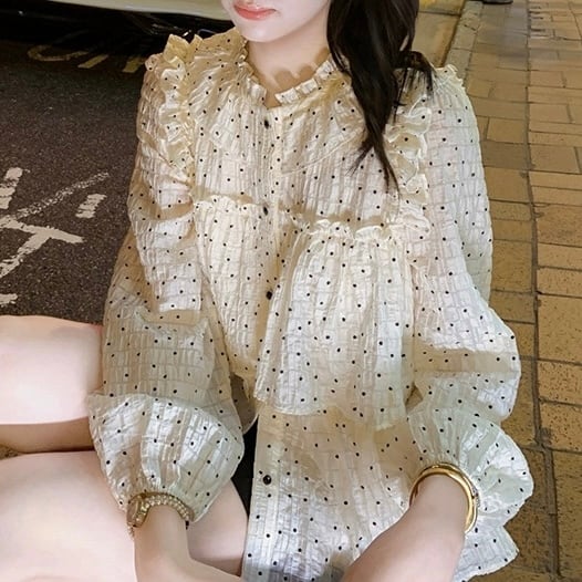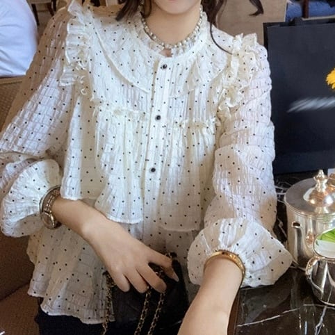 小さなドット柄とフリルデザインが可愛らしいブラウス。