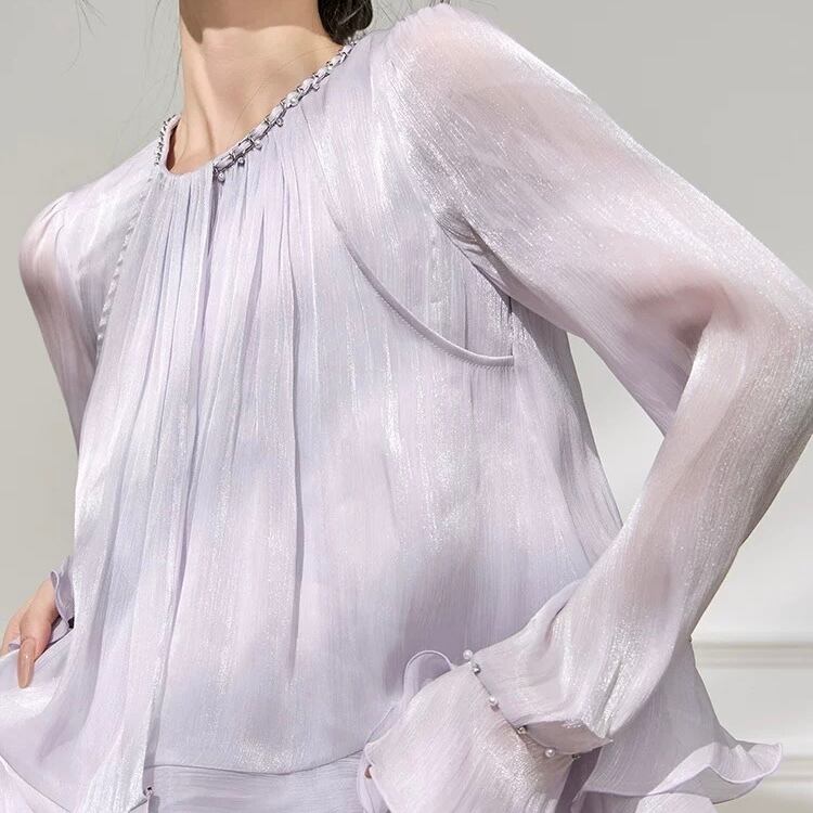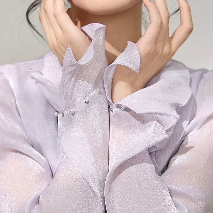 繊細なギャザーとパールネックが上品なブラウス。
