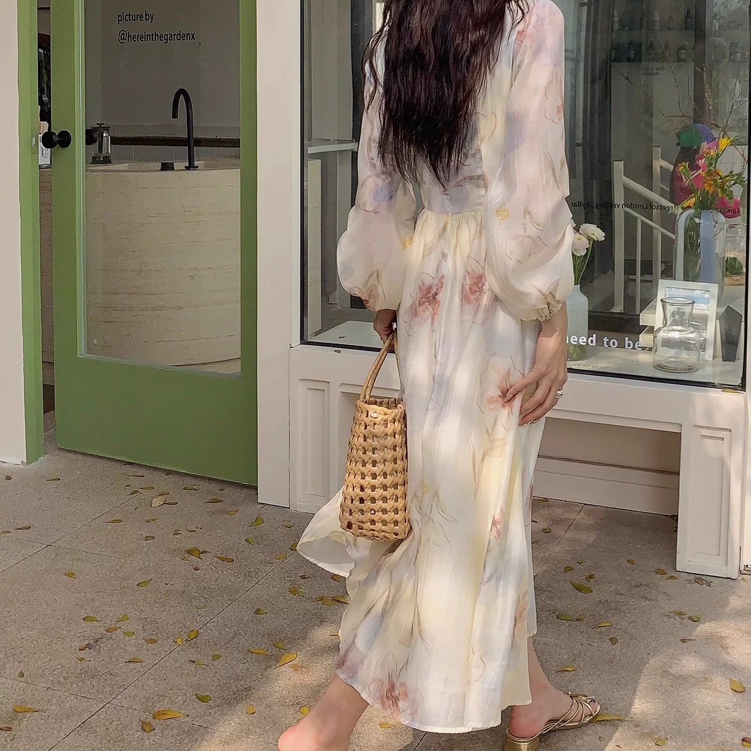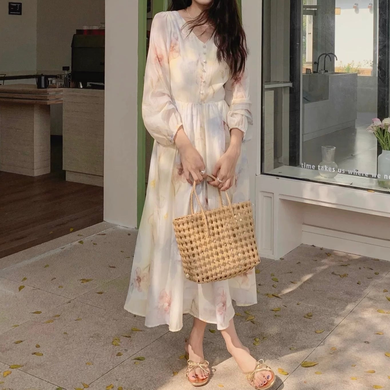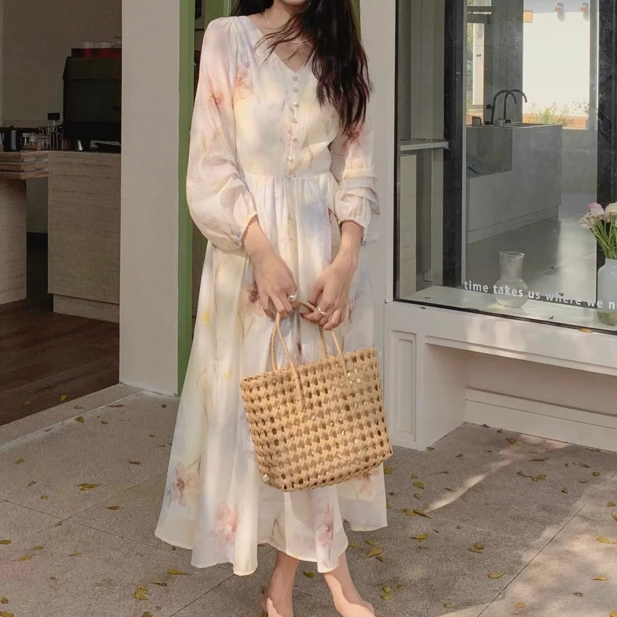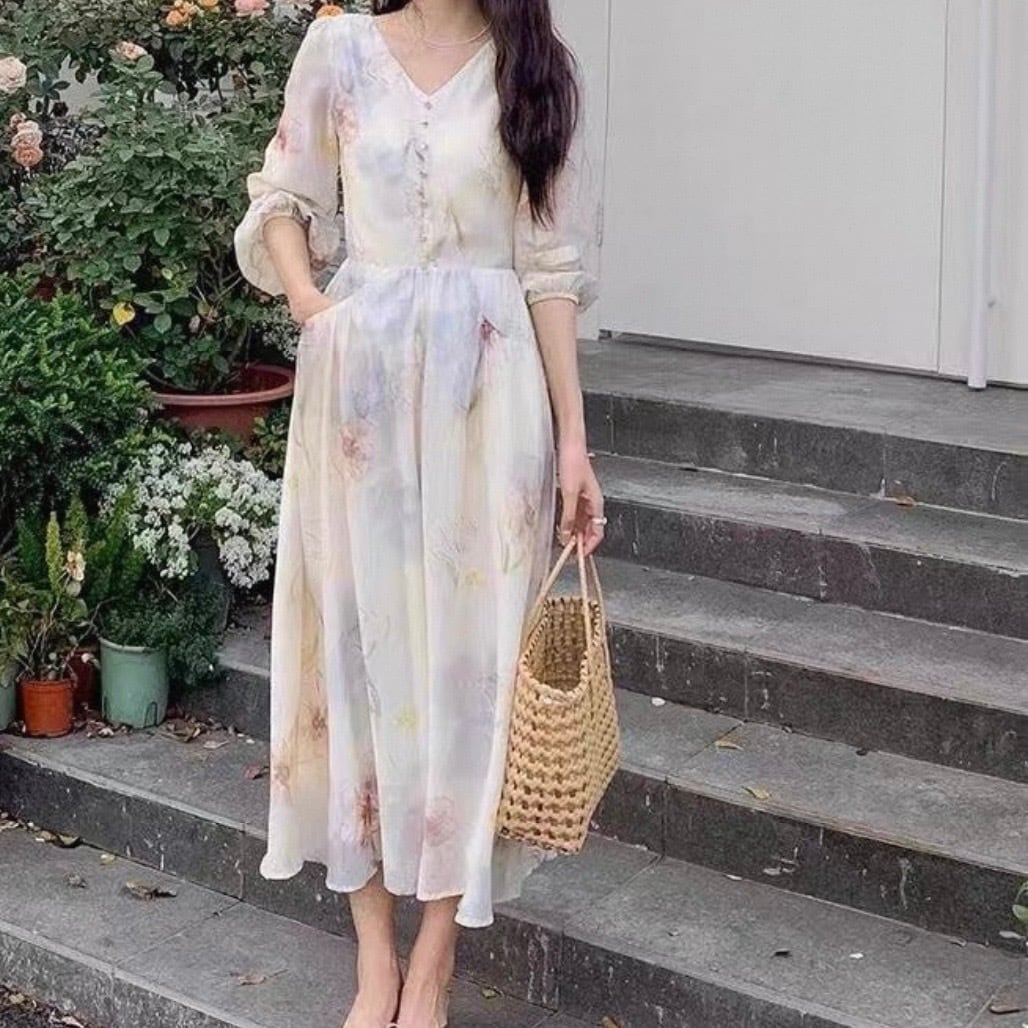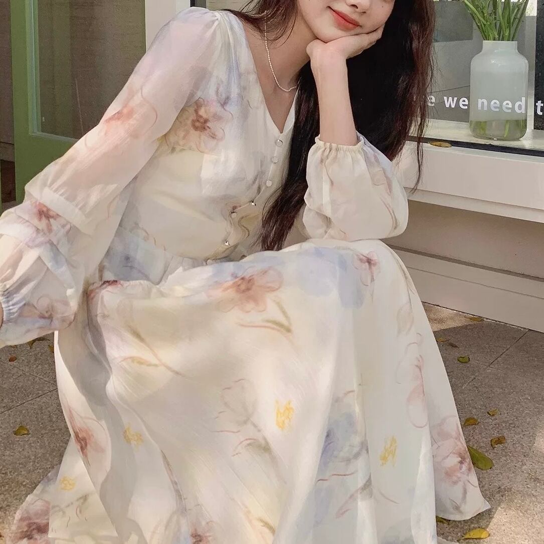 淡い花柄が優しい雰囲気を演出するワンピース。